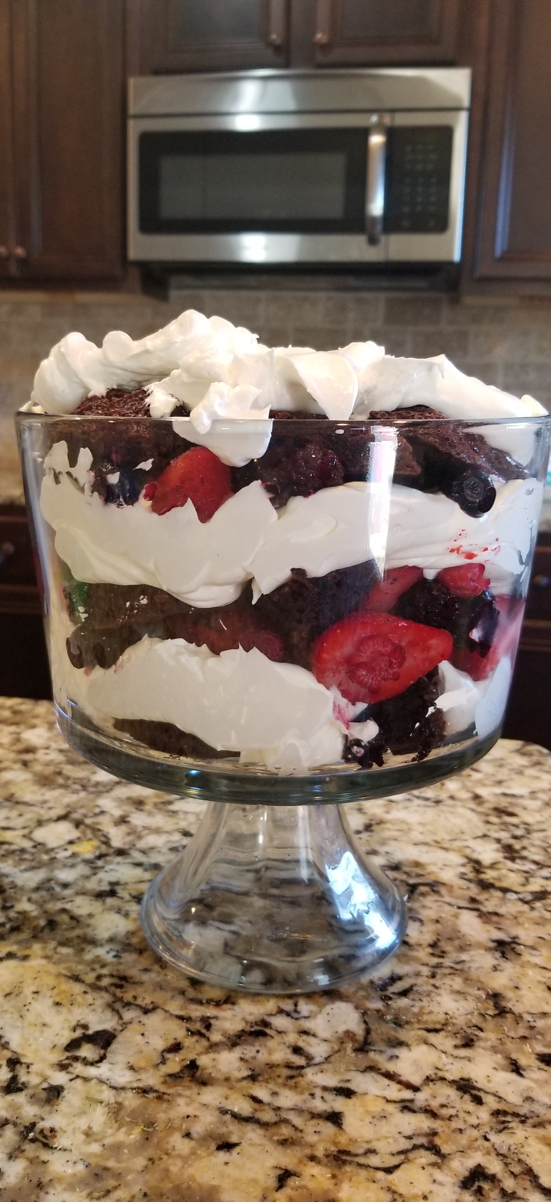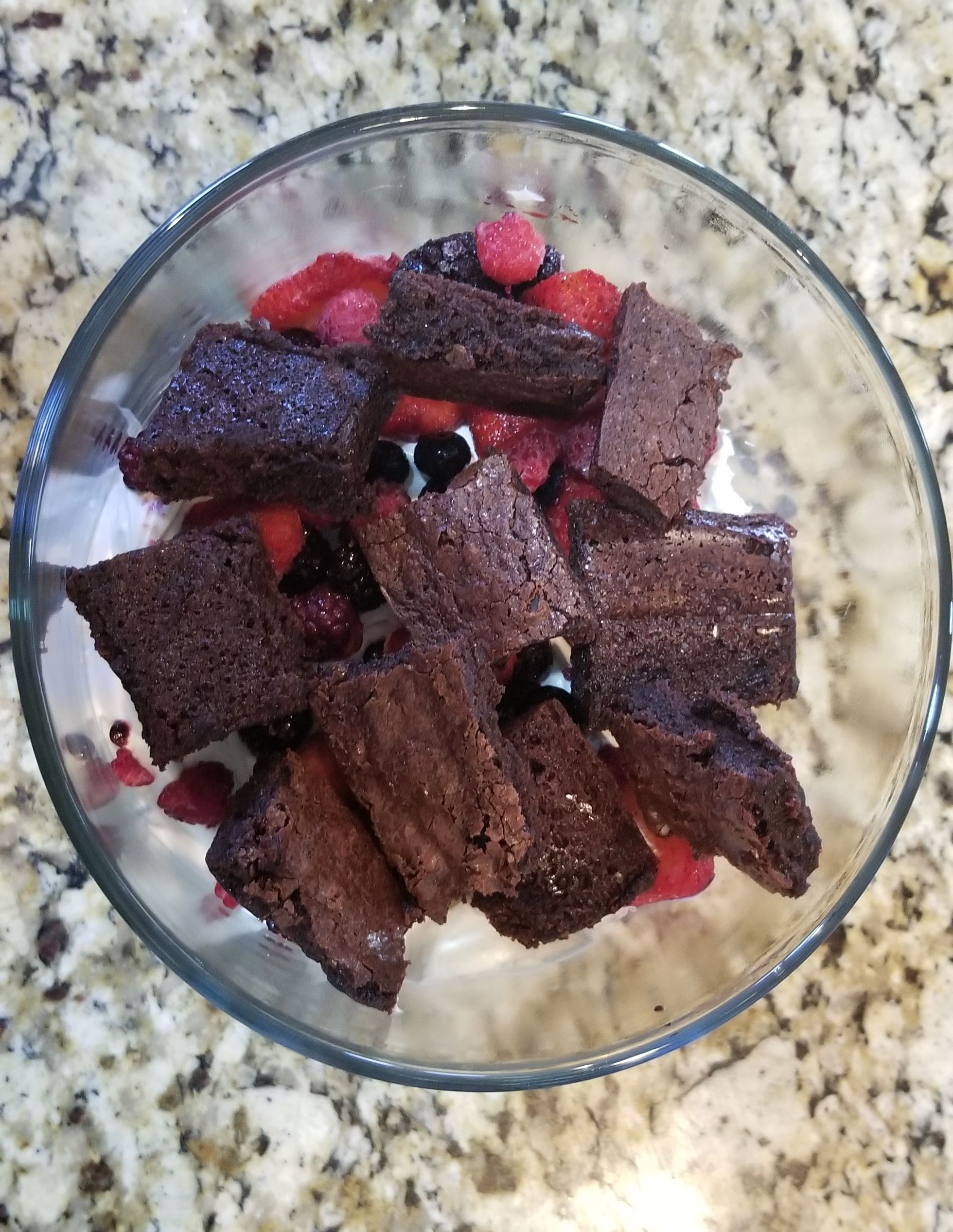 - Layer brownie, cream then fruit and repeat 2 to 3 times ending with a layer of cream