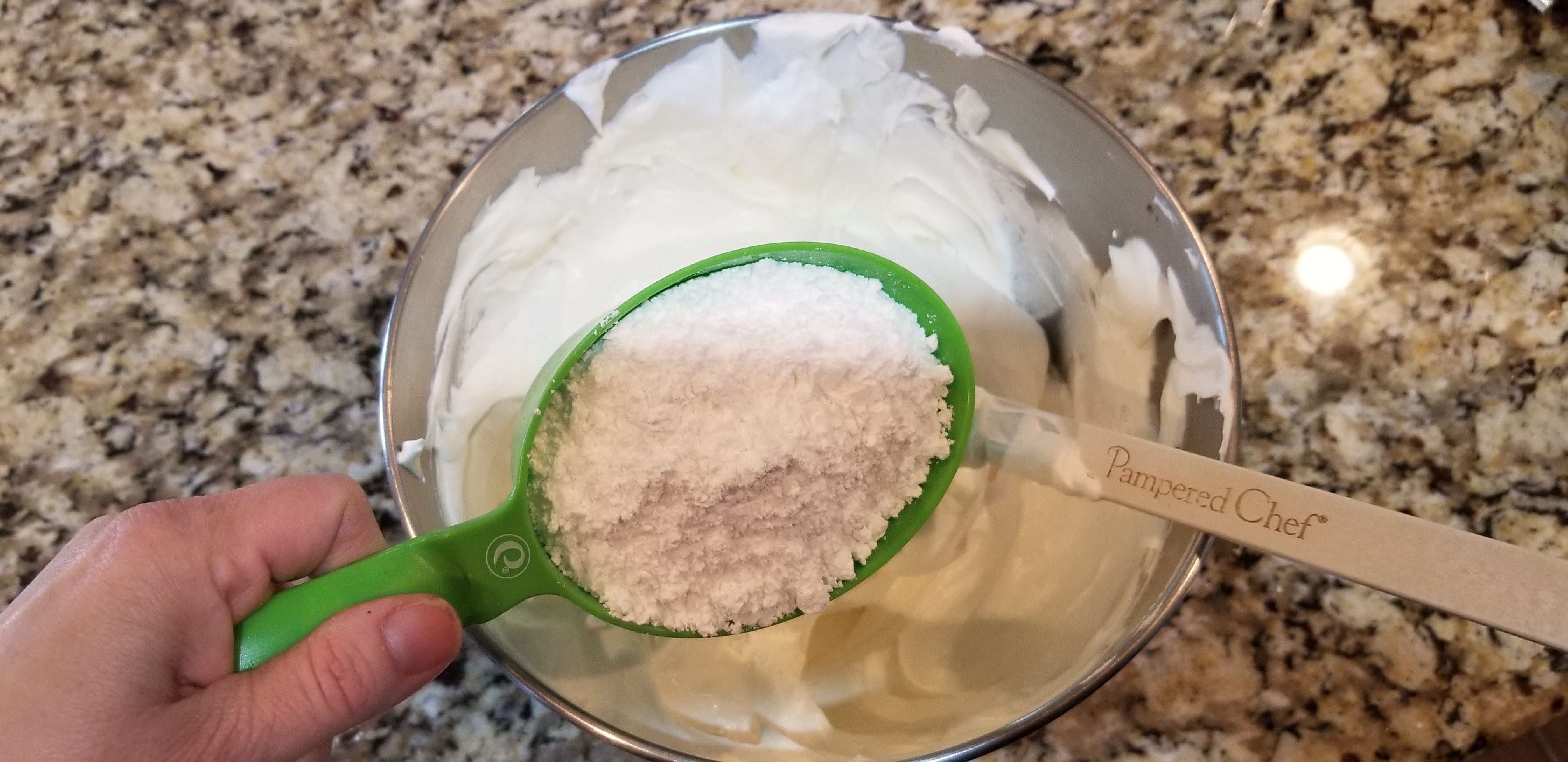 - In a bowl, mix the cool whip, sour cream and confectionners sugar