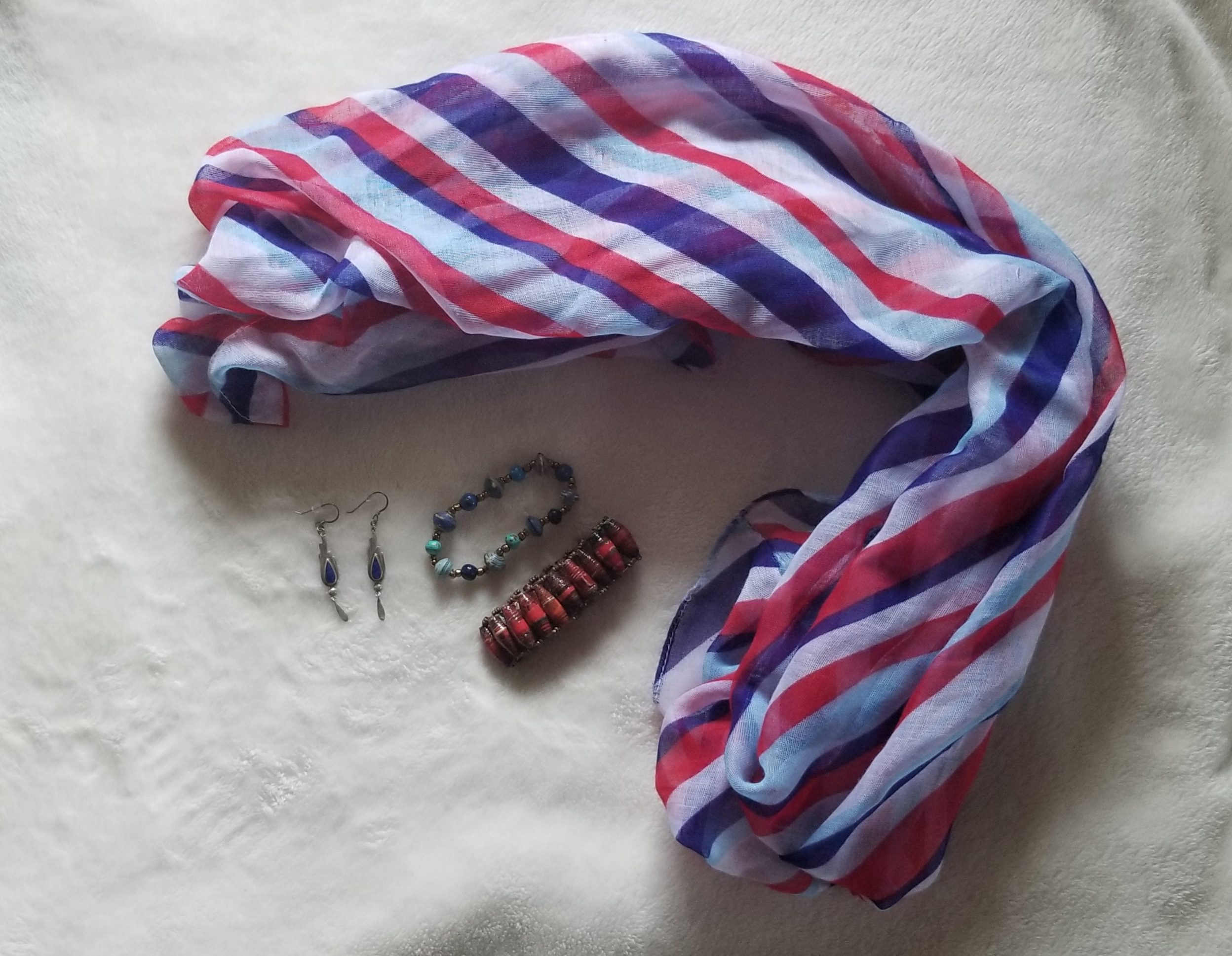 To bring interest to my outfit, I added a waterfall 3/4 sleeves cardigan, a scarf (Target dollar stop a few years ago), dainty earrings and Fair Trade bracelets (from Mercy house). The layer was practical to add some warmth as well as add color, and the scarf, earrings and bracelets complement each other.