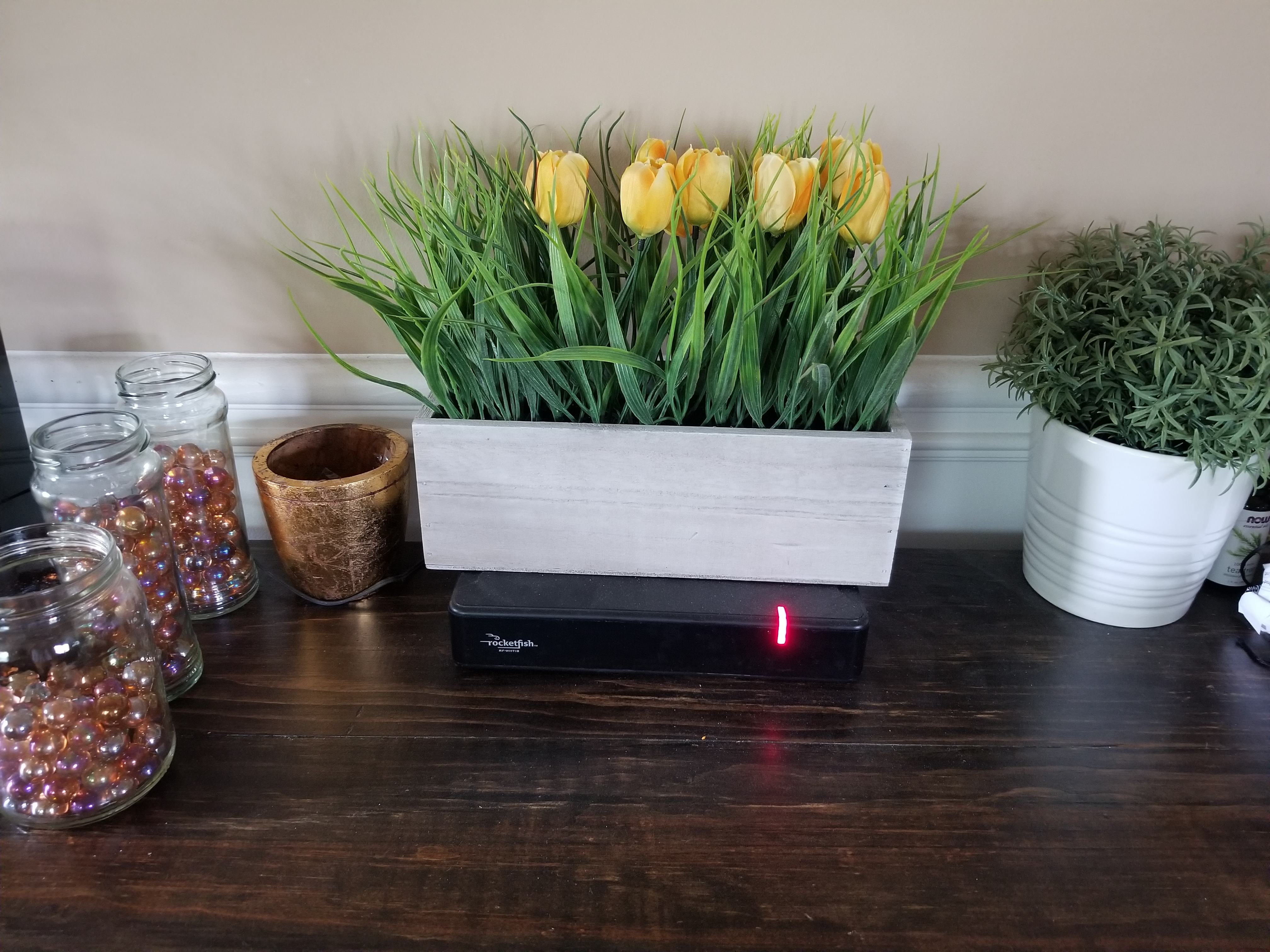 Next I needed a few things to add to the mantle and table behind the couch: I like the sunshiny color of these fake tulips and the little sign sums up what we should do each day.