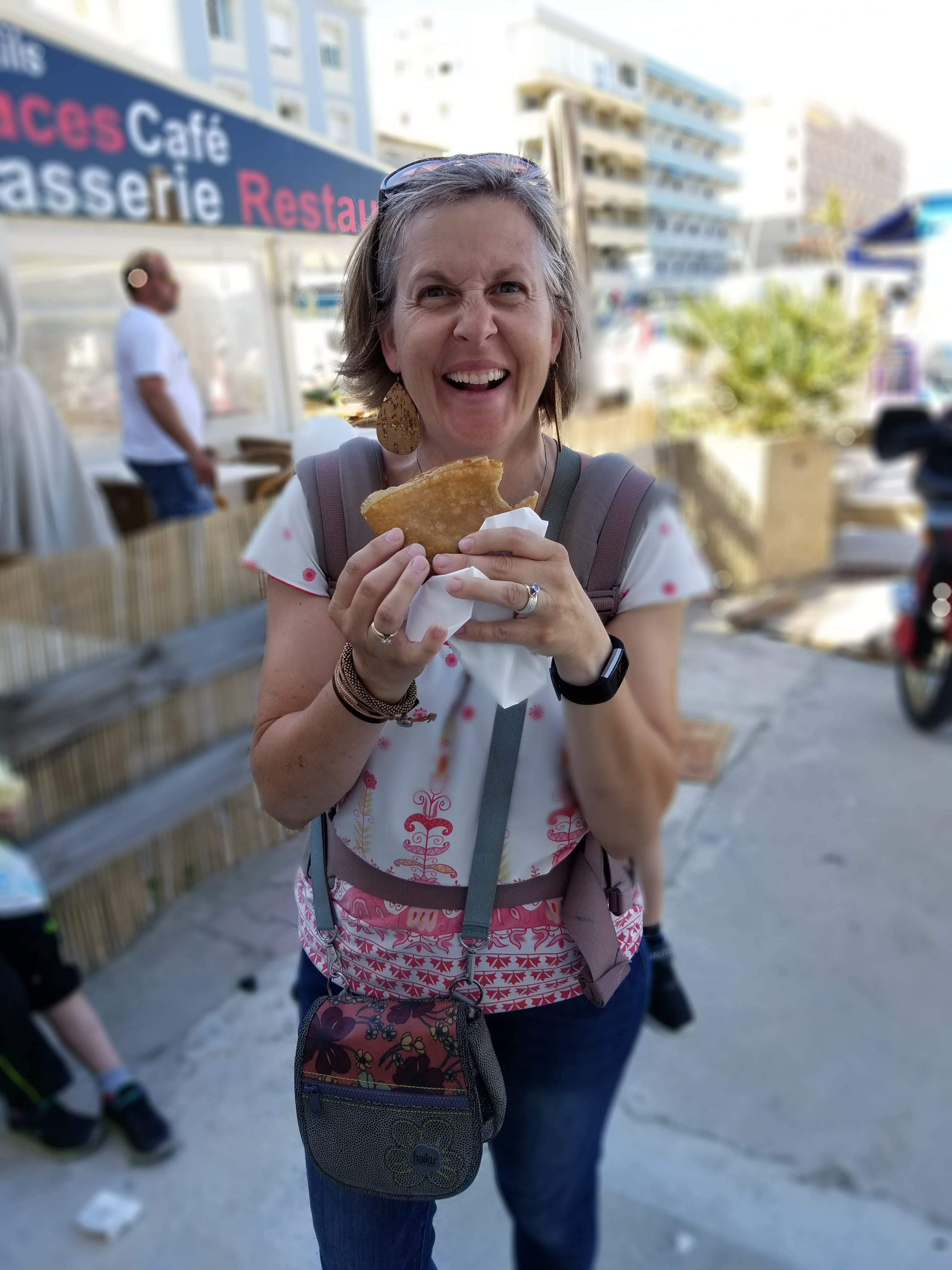 I wore this outfit twice, once for a day visiting a market and beach in the south of France and once traveling from the South of France to the North of France. This is one of my favorite thrifted shirt. I really like that first picture of me eating a crepe with nutella: I feel like it takes 10 years off! What a little special snack can do, lol!