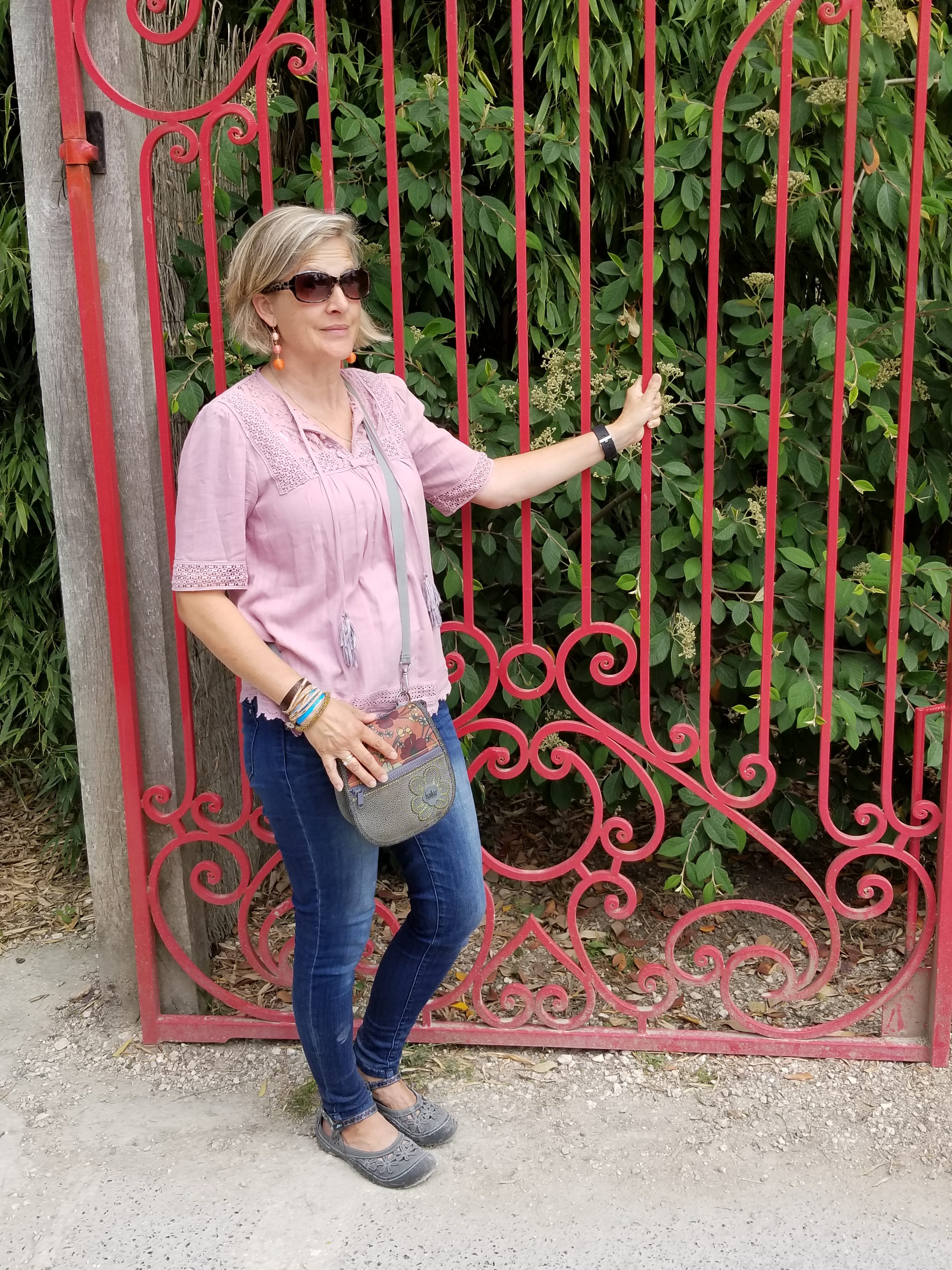 I wore this outfit while visiting Girona and later that day in Calella de Palagruell. The scarf started around my neck, then I attached to my purse when it became hot and then again was a source of warmth. I love everything about this outfit. My peasant blouse is old as well as my comfy wit and wisdom jeans. My new Jambu shoes took a day to break in and after giving my feet a day’s rest, I was able to wear them with great comfort. They were my most worn shoes as you will see in my pictures and I could have just brought those shoes on the trip and have been happy. Pretty with pants and dresses. I love them!