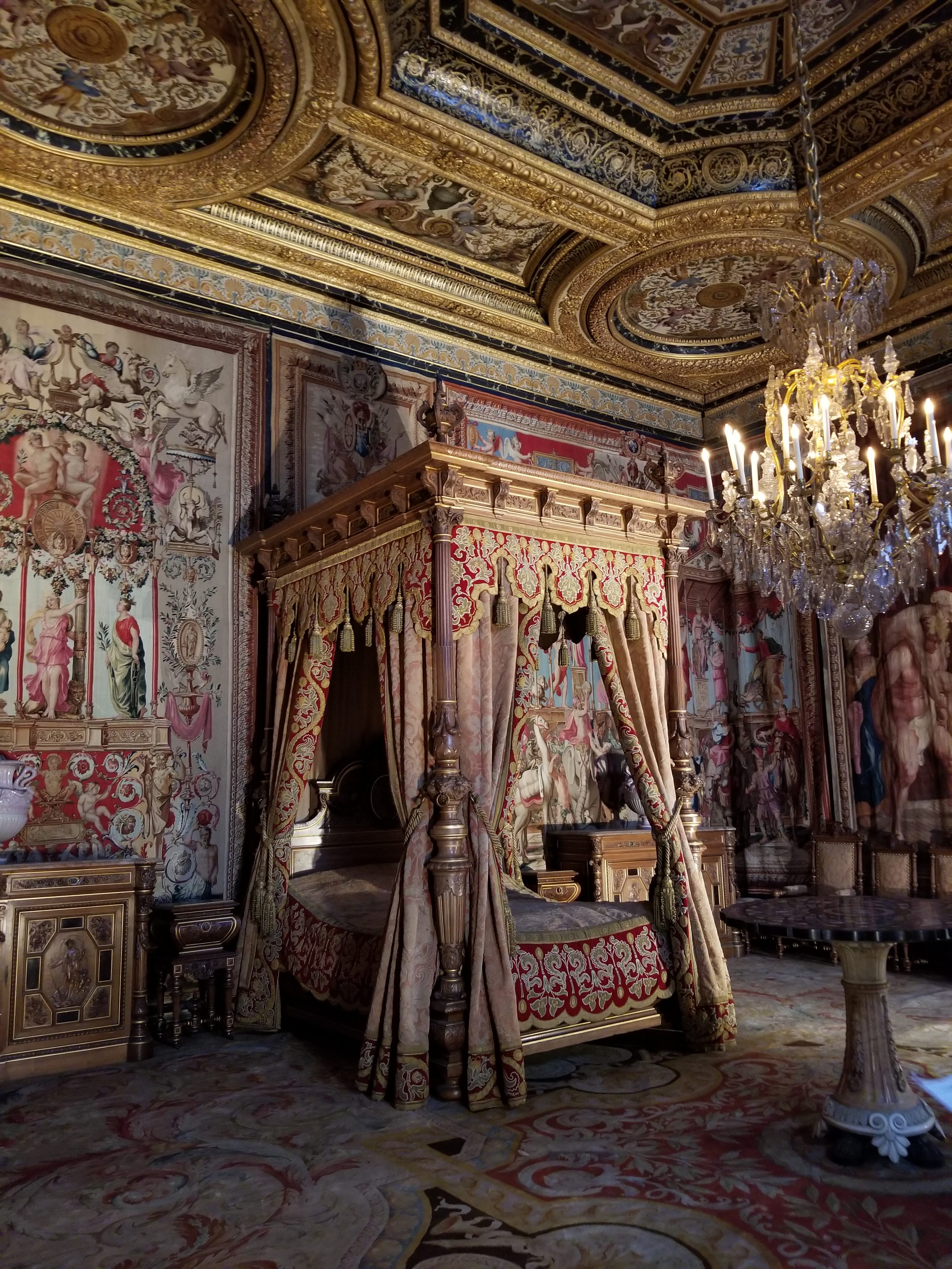 This will be my last travel post about our trip to Europe. I have enjoyed reliving our adventures through writing and recording our trip. Before leaving the north of France, we decided to visit Fontainebleau, a castle that began in the medieval times (nothing much is left from that era, just a small donjon stairwell) through the 19th century. It bcomes a large palace especially during the 2nd part of the reign of Francois 1er (1494-1547). Napoleon 1st will also spend time there in the 1800s.