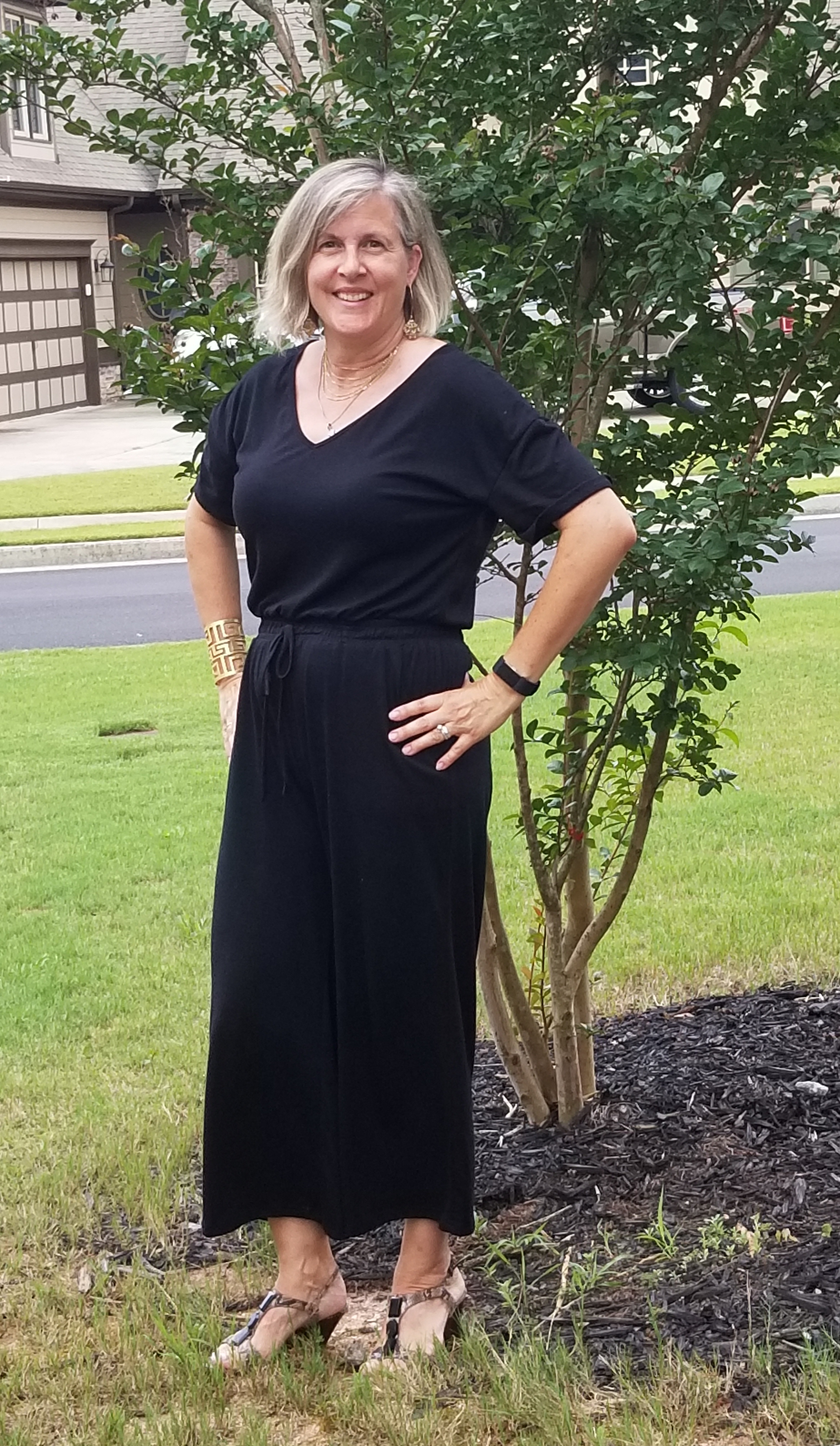 So after seeing bloggers sporting cute jumpsuits for a few months and trying a couple on some of my outings, I took the plunge and ordered a simple black jumpsuit on Amazon. I ordered it in medium and that was the perfect size. The jumpsuit is made of a thick tshirt like material and feels like pajamas with an elactic waist and a tie at the waist. I always love posts that show you how to wear an item several ways so here are 4 ways to wear a simple black jumpsuit in the summer. Because it is hot here in Georgia in the summer none of the looks involve layers so the looks are changed by the accessories.