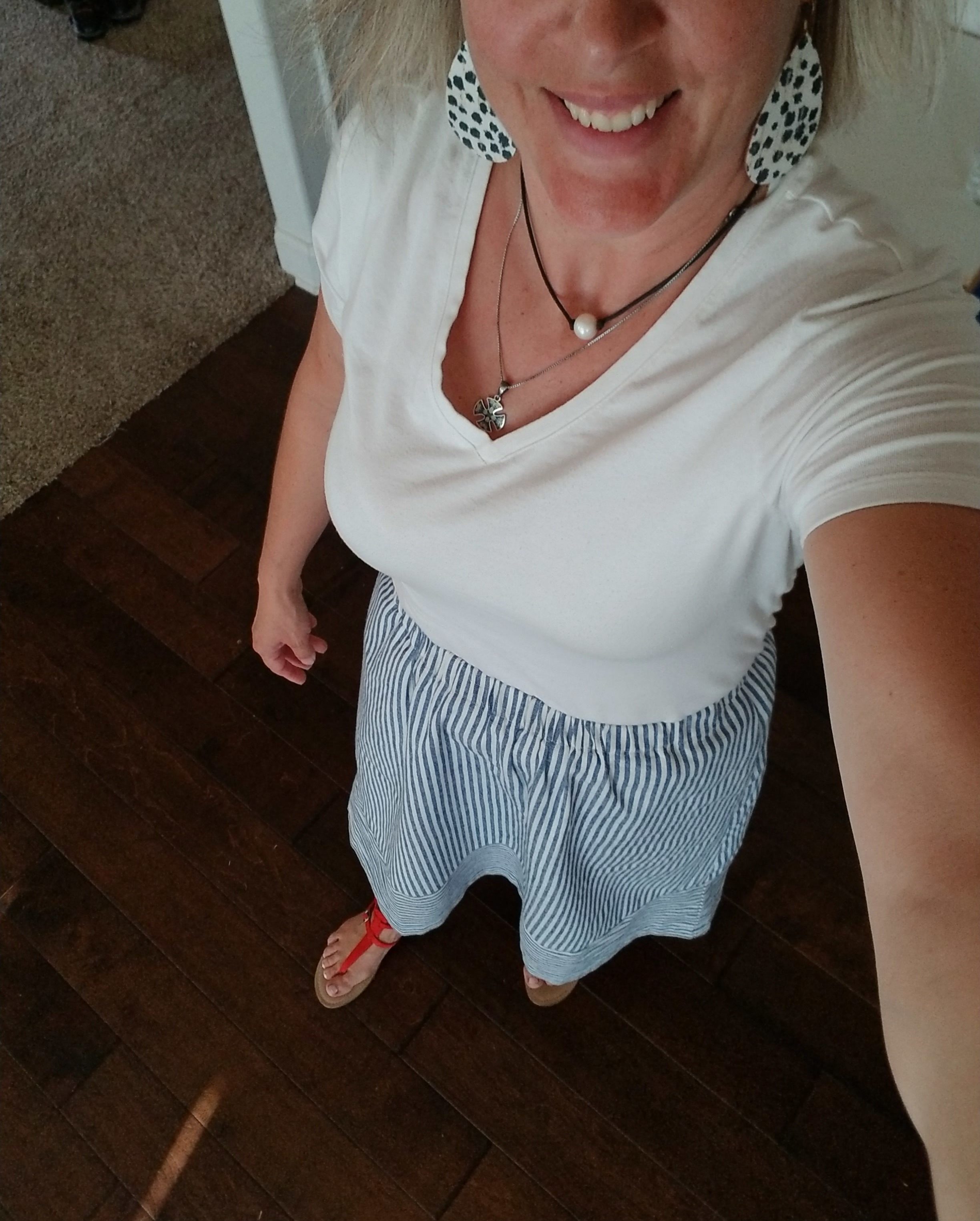 I wore my new Nickel and Suede tee and my joggers. My flip flops are a pair I found at Aldi a couple years ago. I have been surprised at how comfortable they are and how well they have been holding up. I do not wear flip flops much, usually just to the pool and the beach or to the mailbox but these were comfortable on our 2 mile walk on gravel and regular road. And those ball earrings I found a several months ago at Cracker Barrel: so perfect for so many outfits!