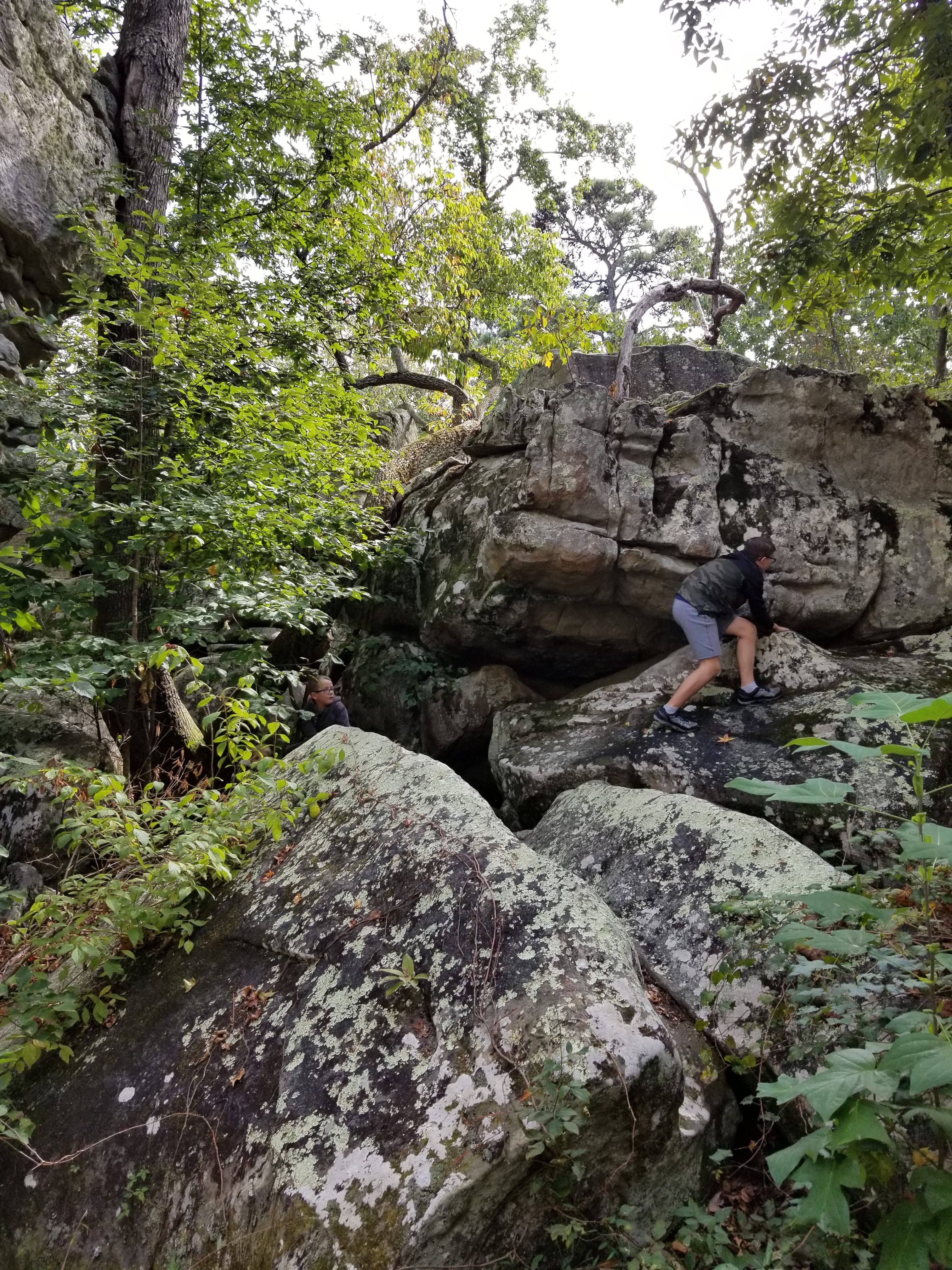 We spent our mini fall break at our uncle’s lakehouse! He is always so hospitable and we enjoy visiting him and finding new places to discover nearby. My youngest is at the age of where it is easier for us if we are on the go when in a place like that so one of the places he suggested we visit was Horse Pens 40. This outdoor nature park is privately owned (it was $8 for ages 10 and up) and is well known by rock climbers as a bouldering sites. It was used at times by native americans to corral horses, by the confederate army to store supplies and now hold bluegrass festivals and welcomes visitors every day.