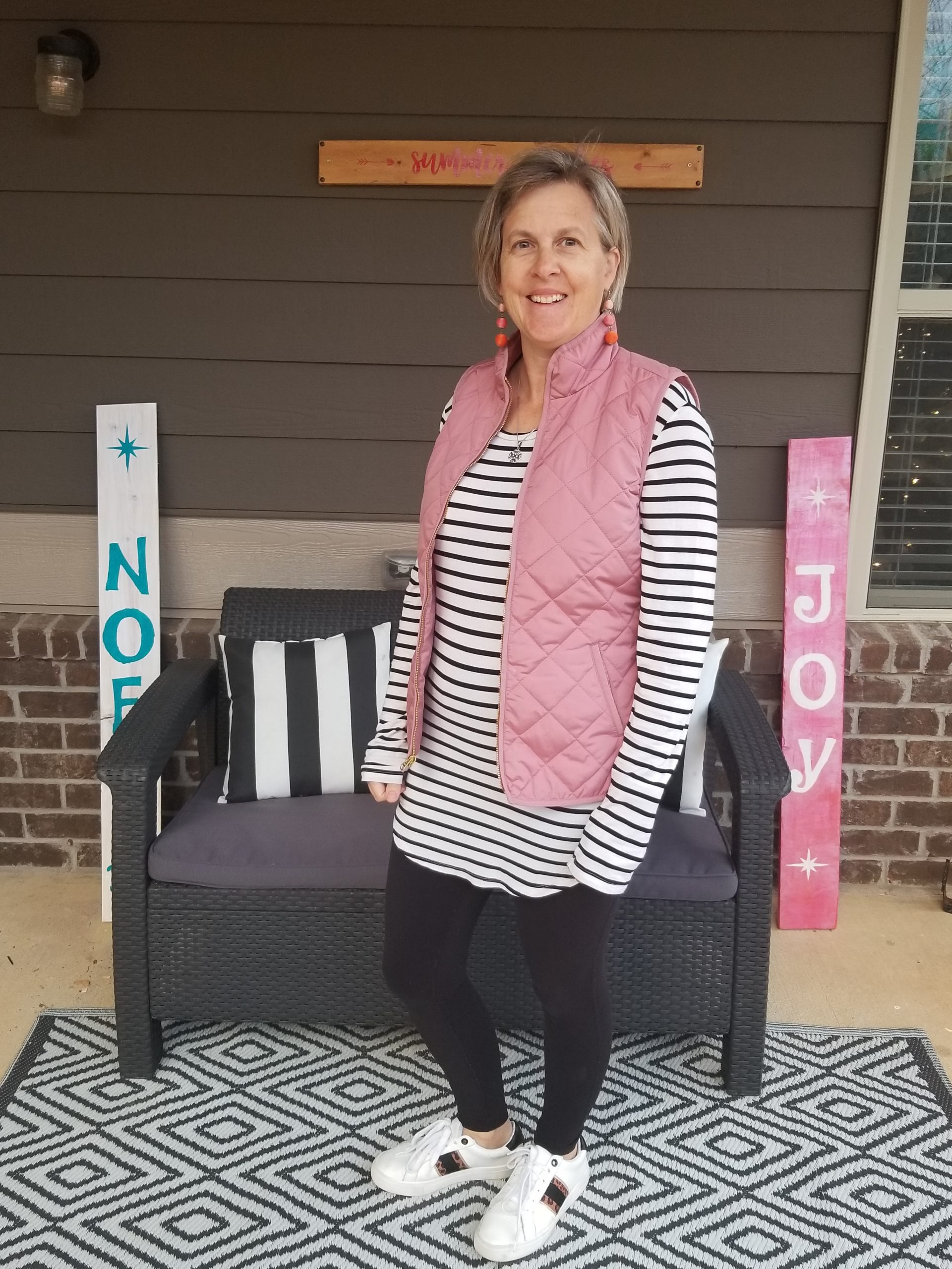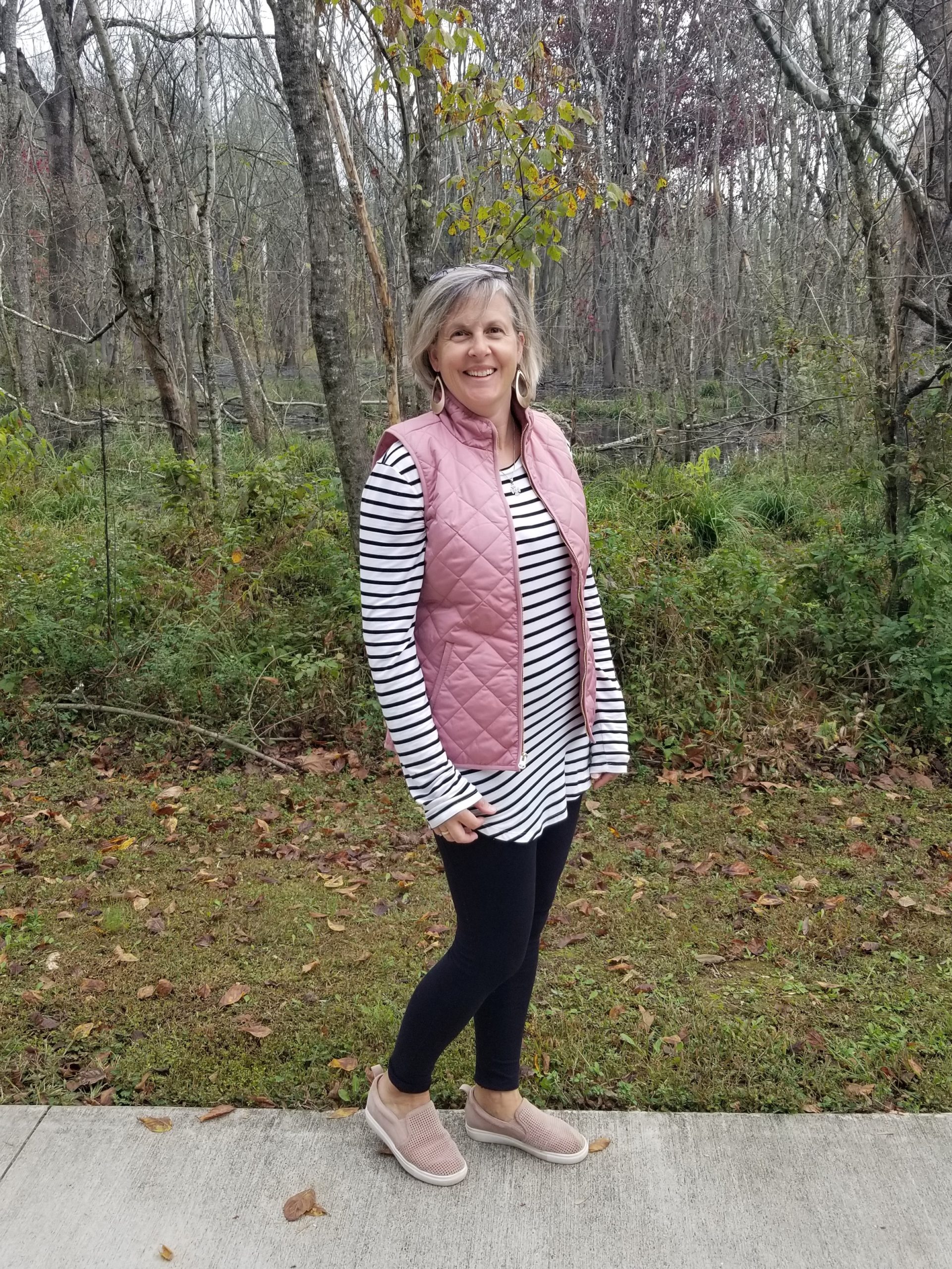 I always like hearing about how people style their outfits. Love the earrings and how just changing shoes and accessories really change a look. What a cute pink quilted vest!