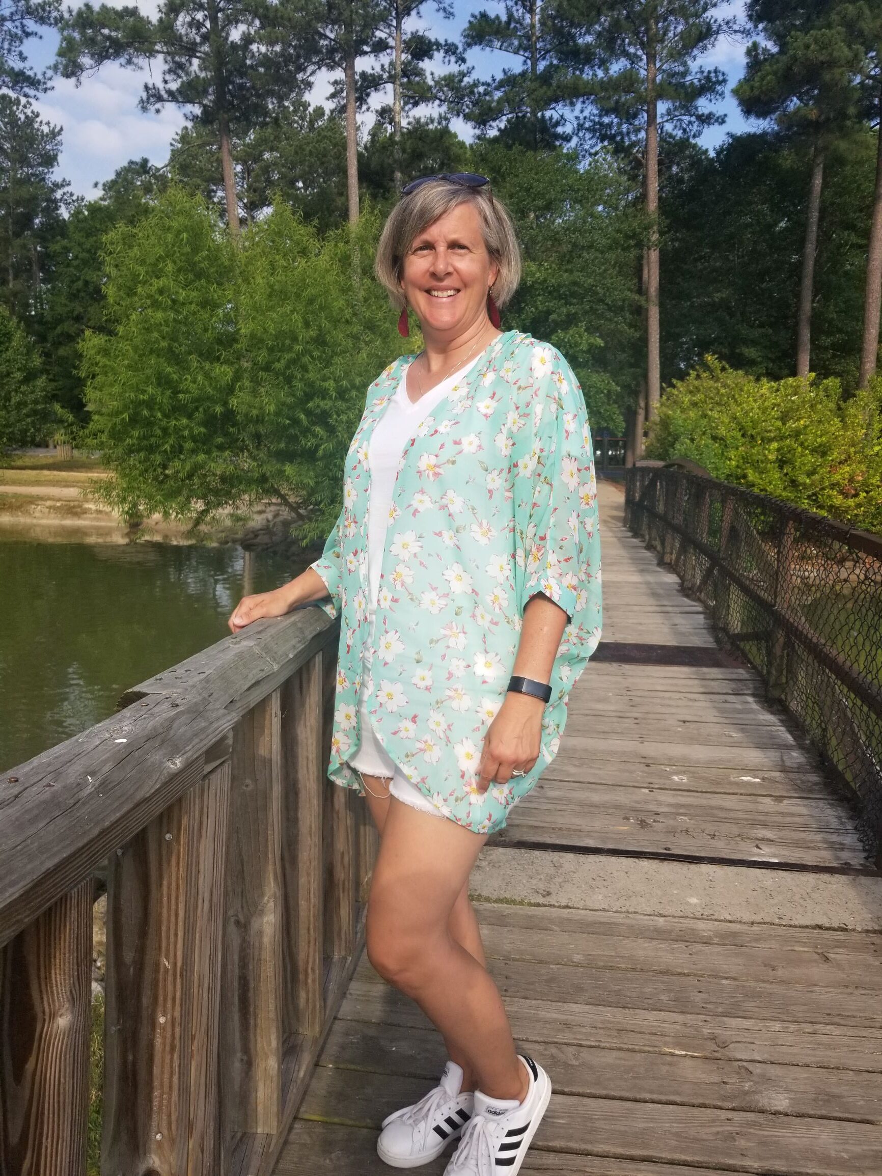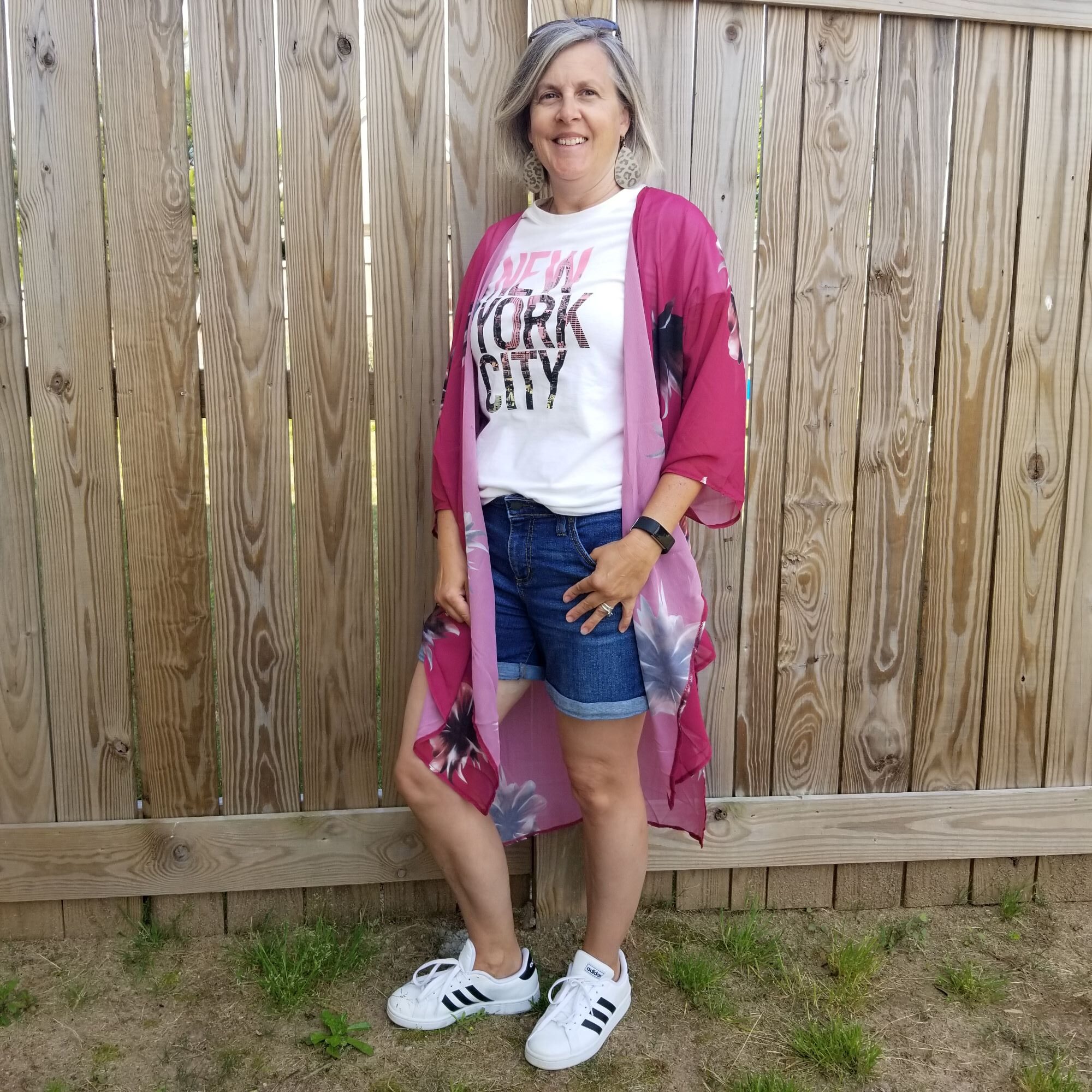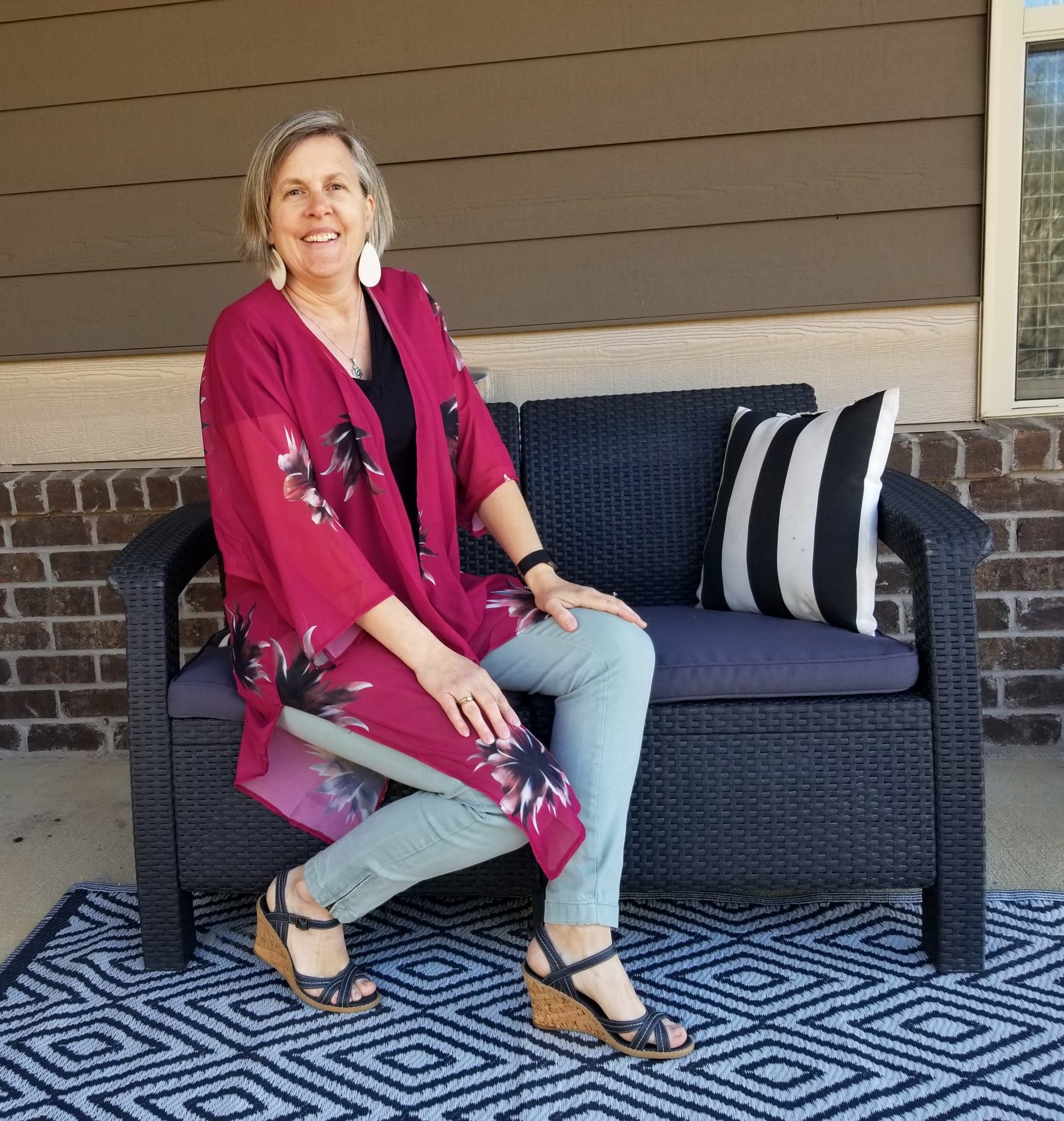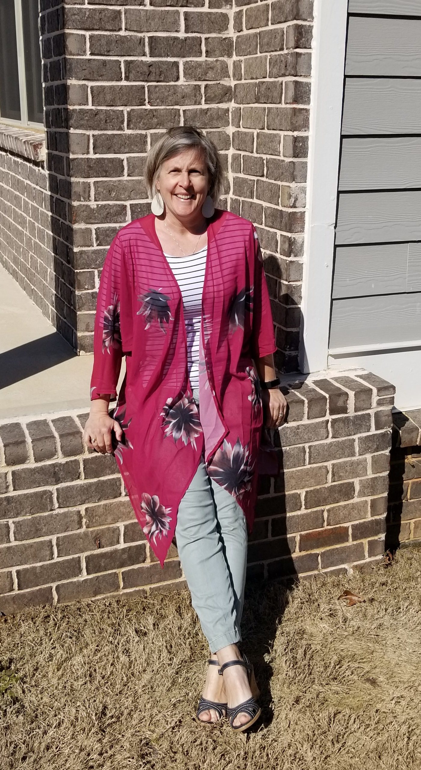 It always amazes me how Ada and I think alike as we take our pictures then email them to each other: look at our choice of casual looks: both burgundy floral kimonos over tees and jeans with fun shoes!