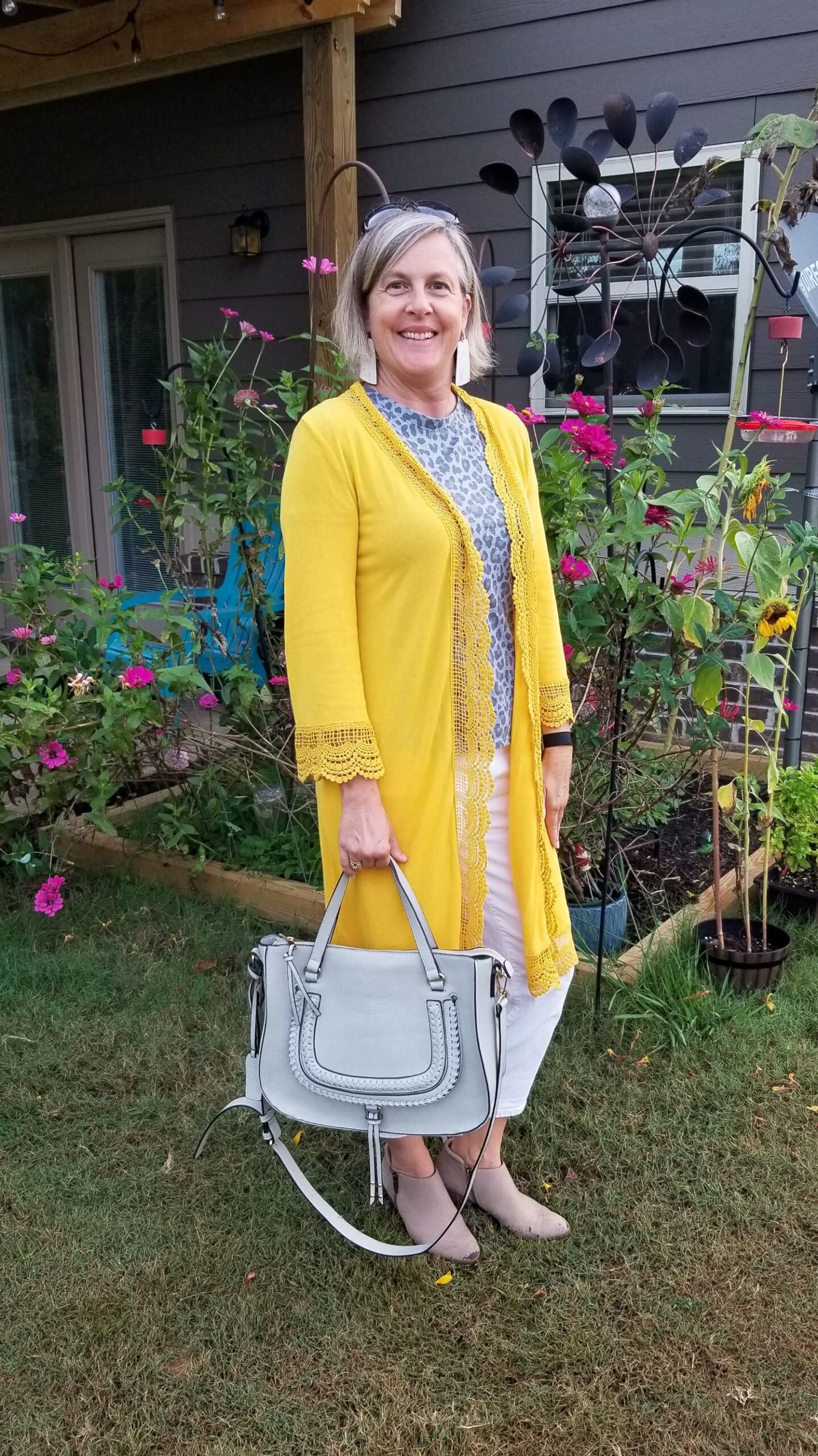 I decided on this mustard yellow kimono for my dressy look because I struggle with it: I love the trim on it, the color, the length.. but I often feel frumpy wearing it. So I challenged myself to come up with a date night look that I would like.