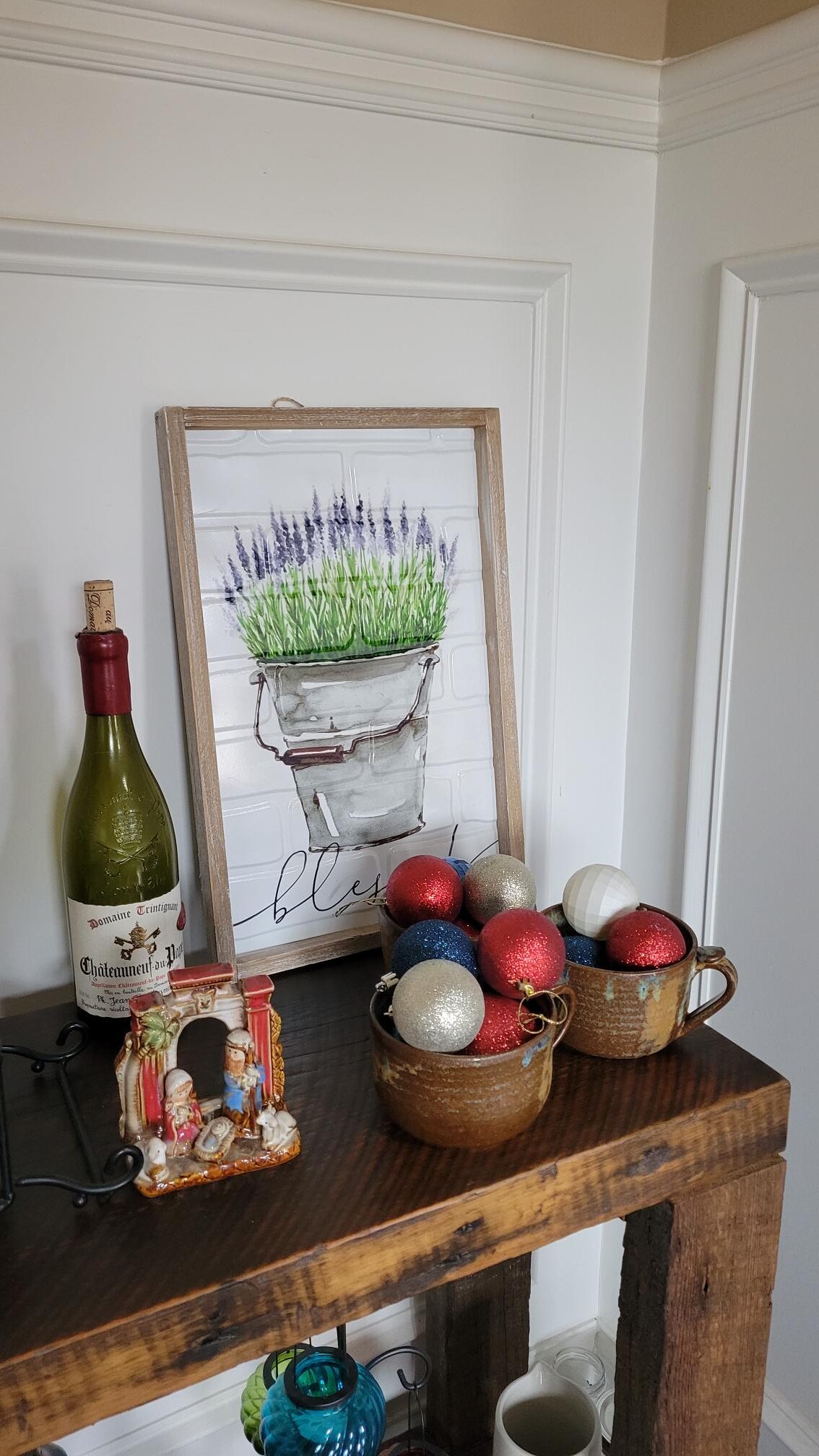 This little buffet in the dining room usually has a few seasonal decorations. My 7 year old made the stone nativity scene this year and I love putting different things in those pottery cups.