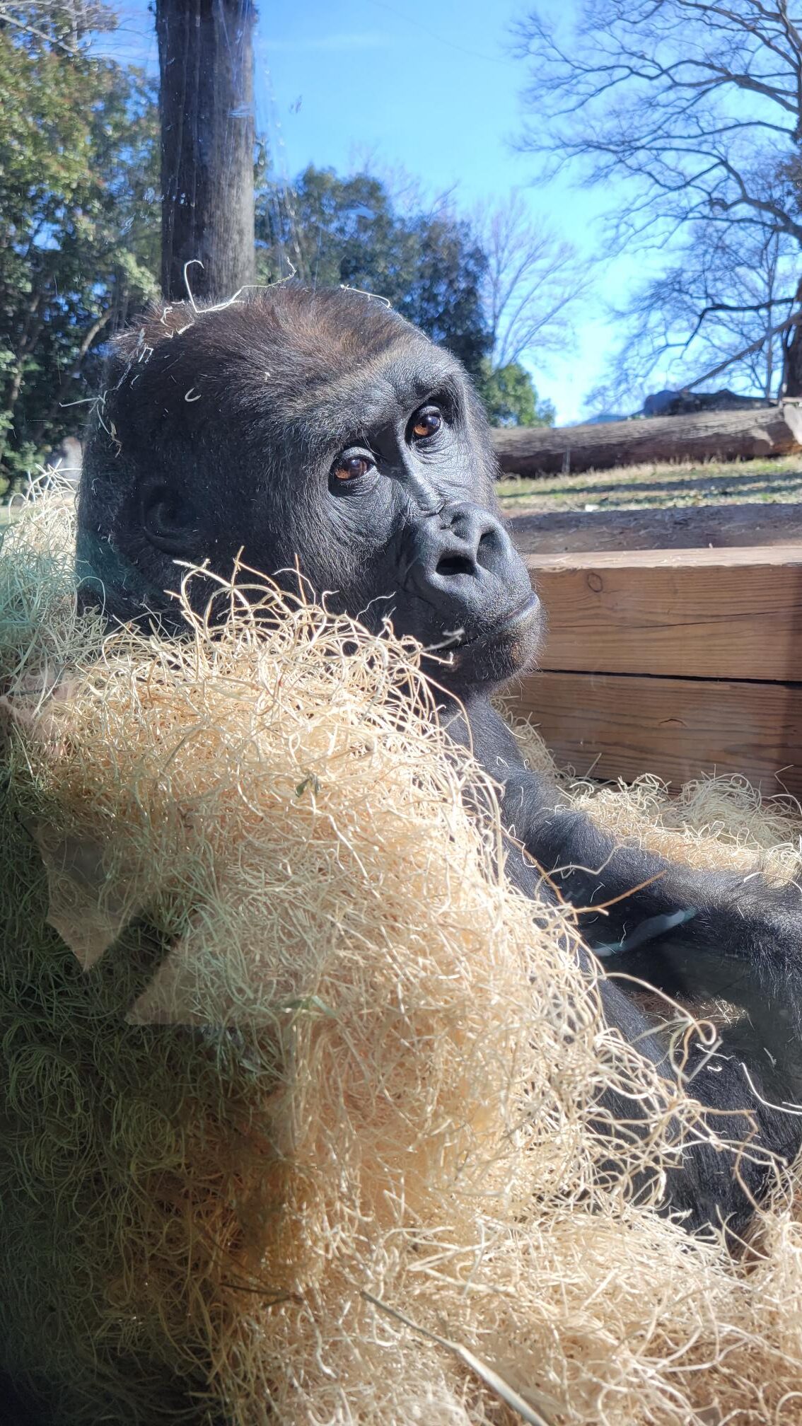 And now my favorites on this visit: the gorillas! First we watched the young gorilla play outside on the hammock and bugging his sisters. We then went to the indoor viewing spot and were rewarded by two females close by getting comfortable in their spots to enjoy the morning sun. The one on the right was sitting by the viewing window and we wondered what she thought as we sat close to her.