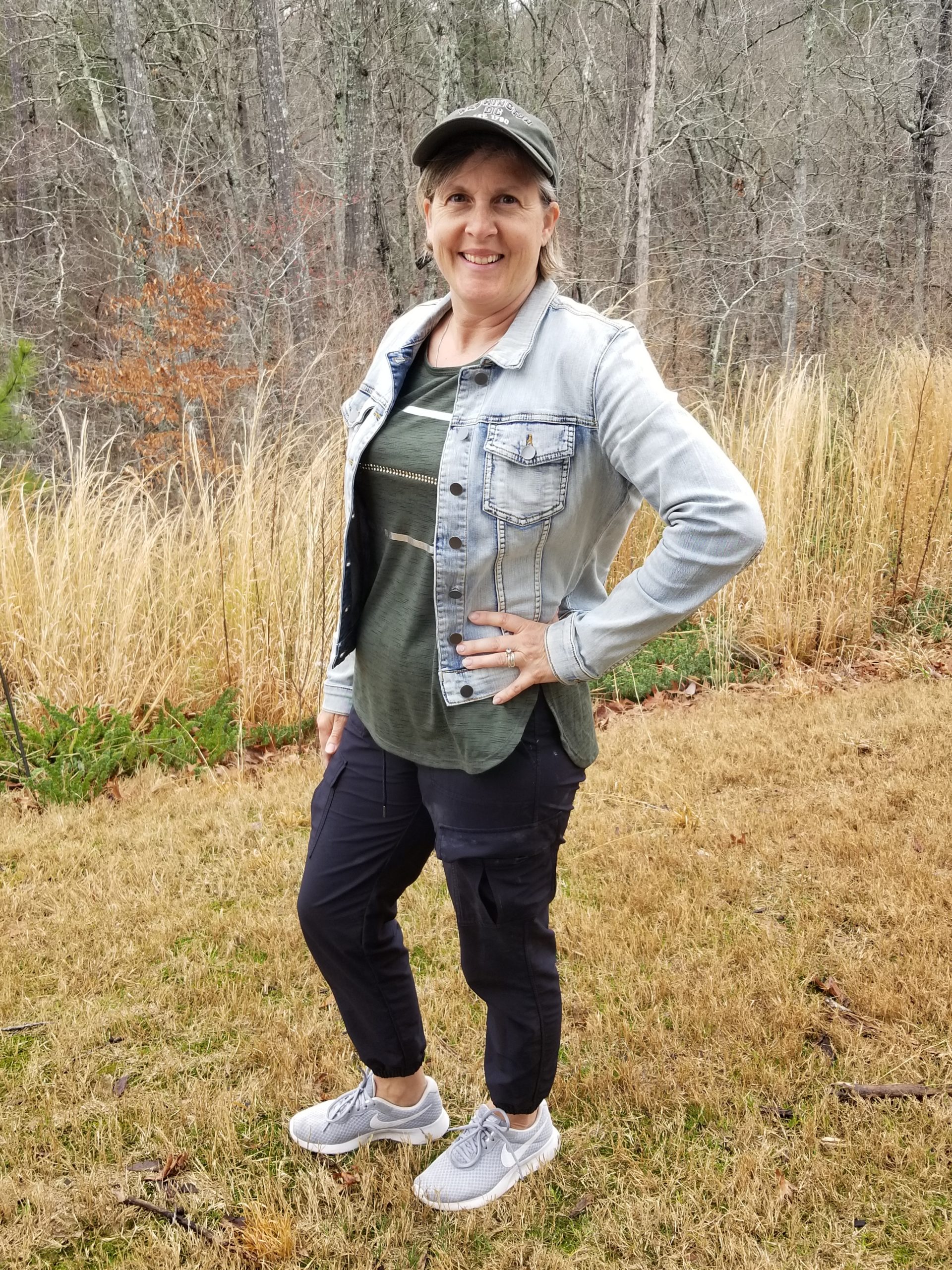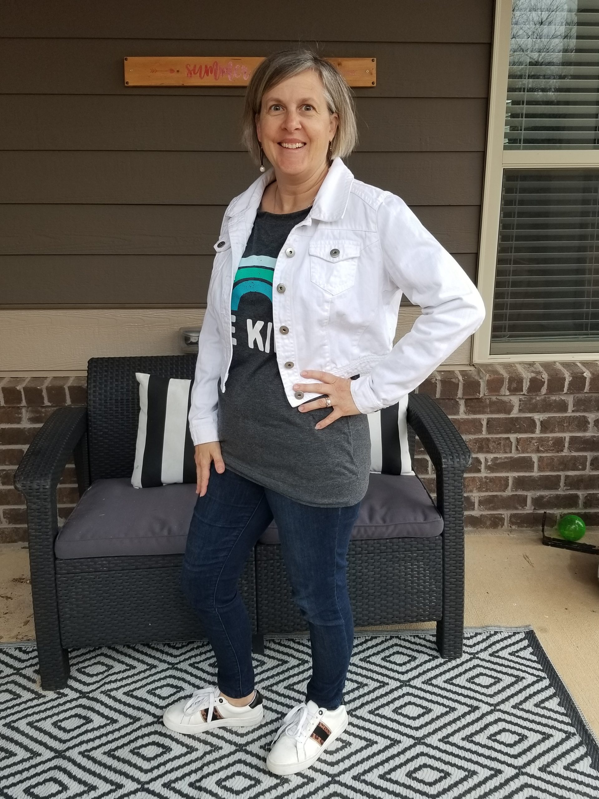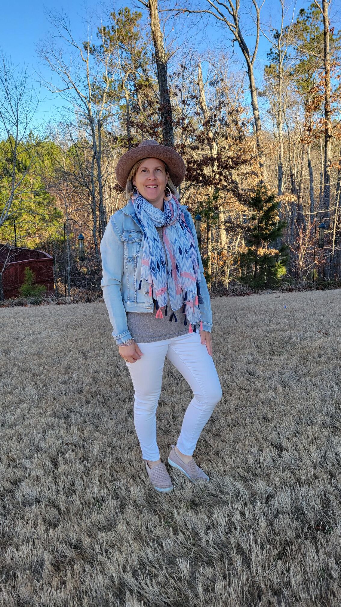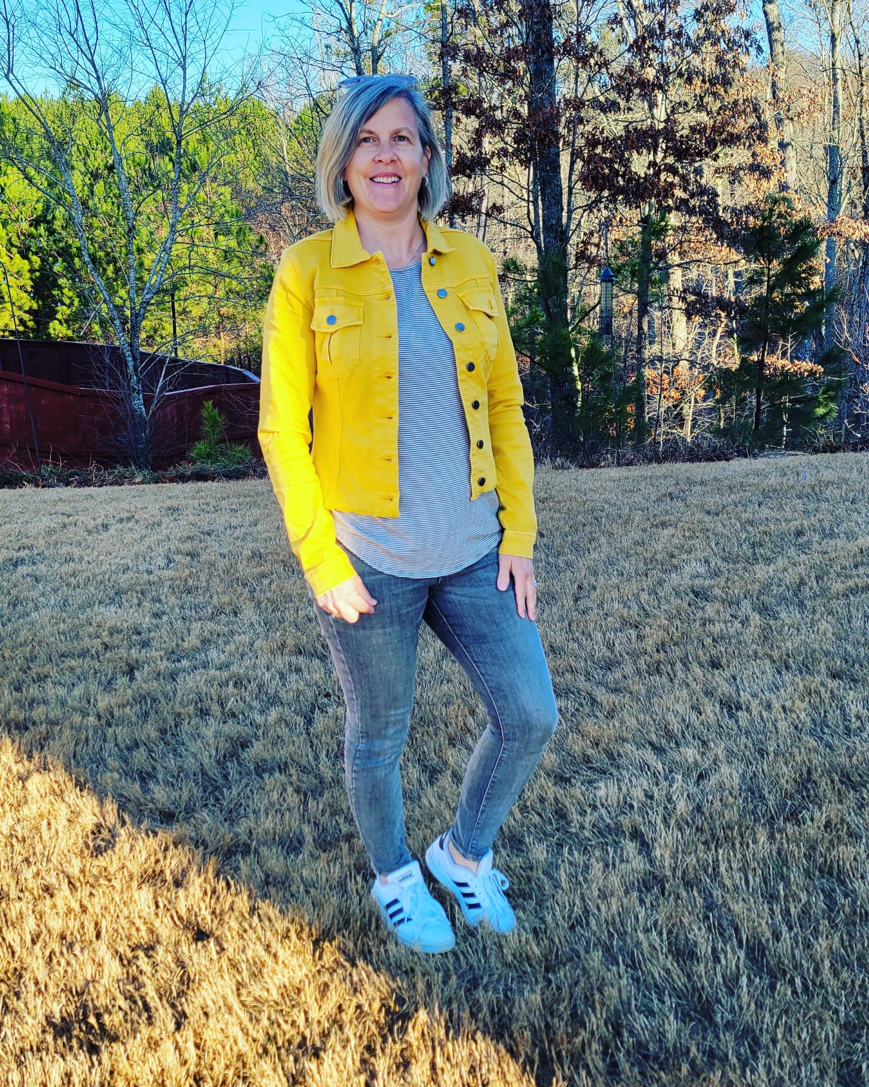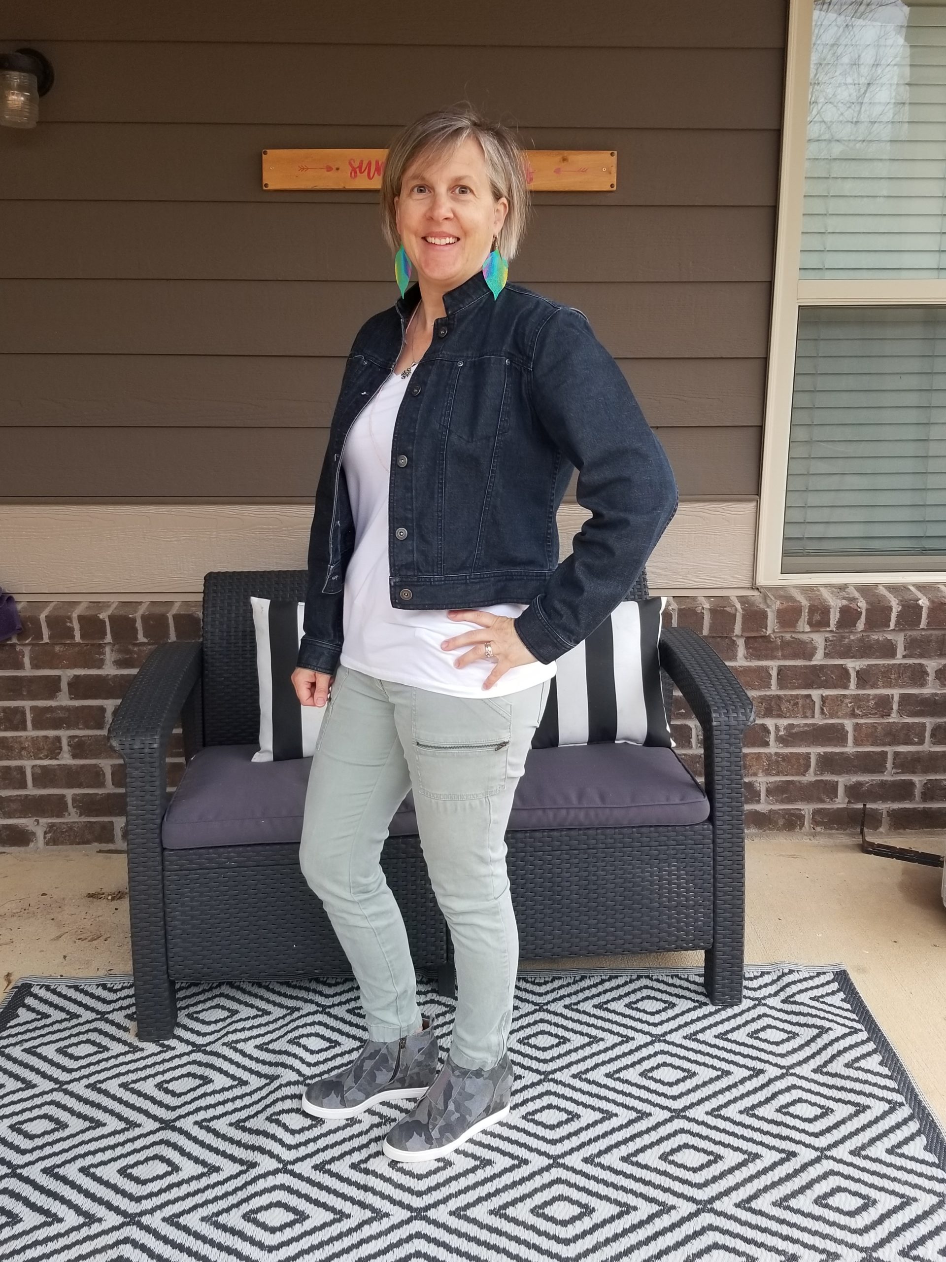 Denim with joggers, pantsuit, dresses, skirts…. Denim jackets with black white and navy… Denim jackets with all kinds of footwear! They are a great lighter layer that hint to spring and warmer weather and are very versatile!
