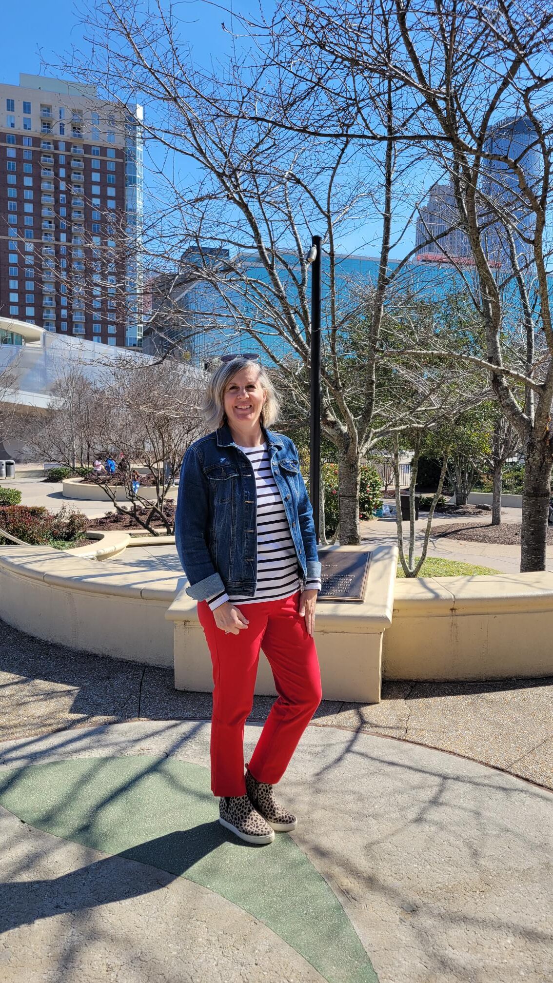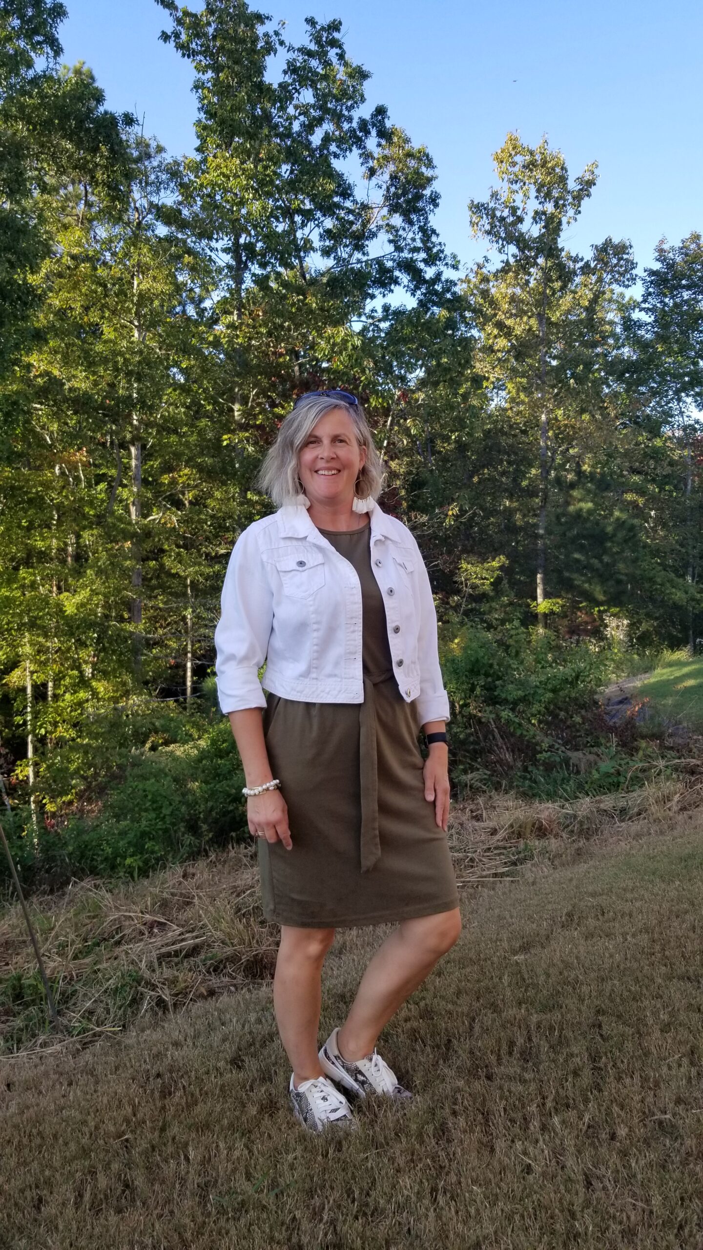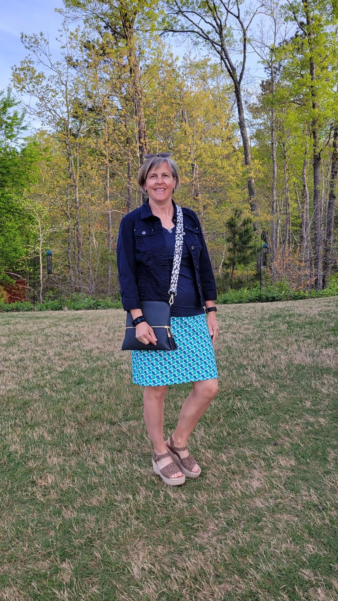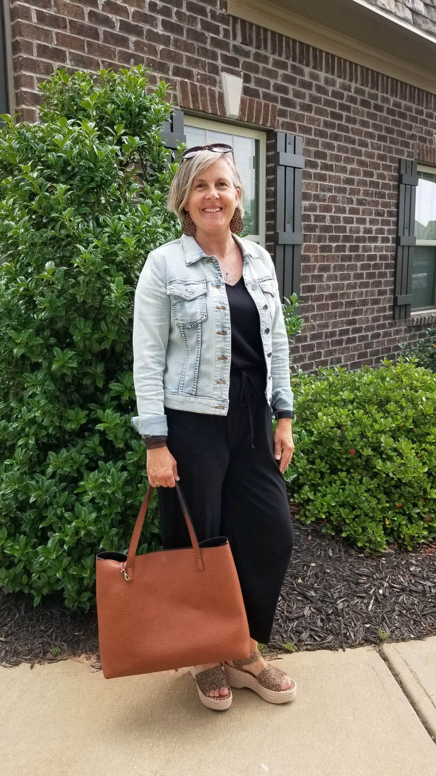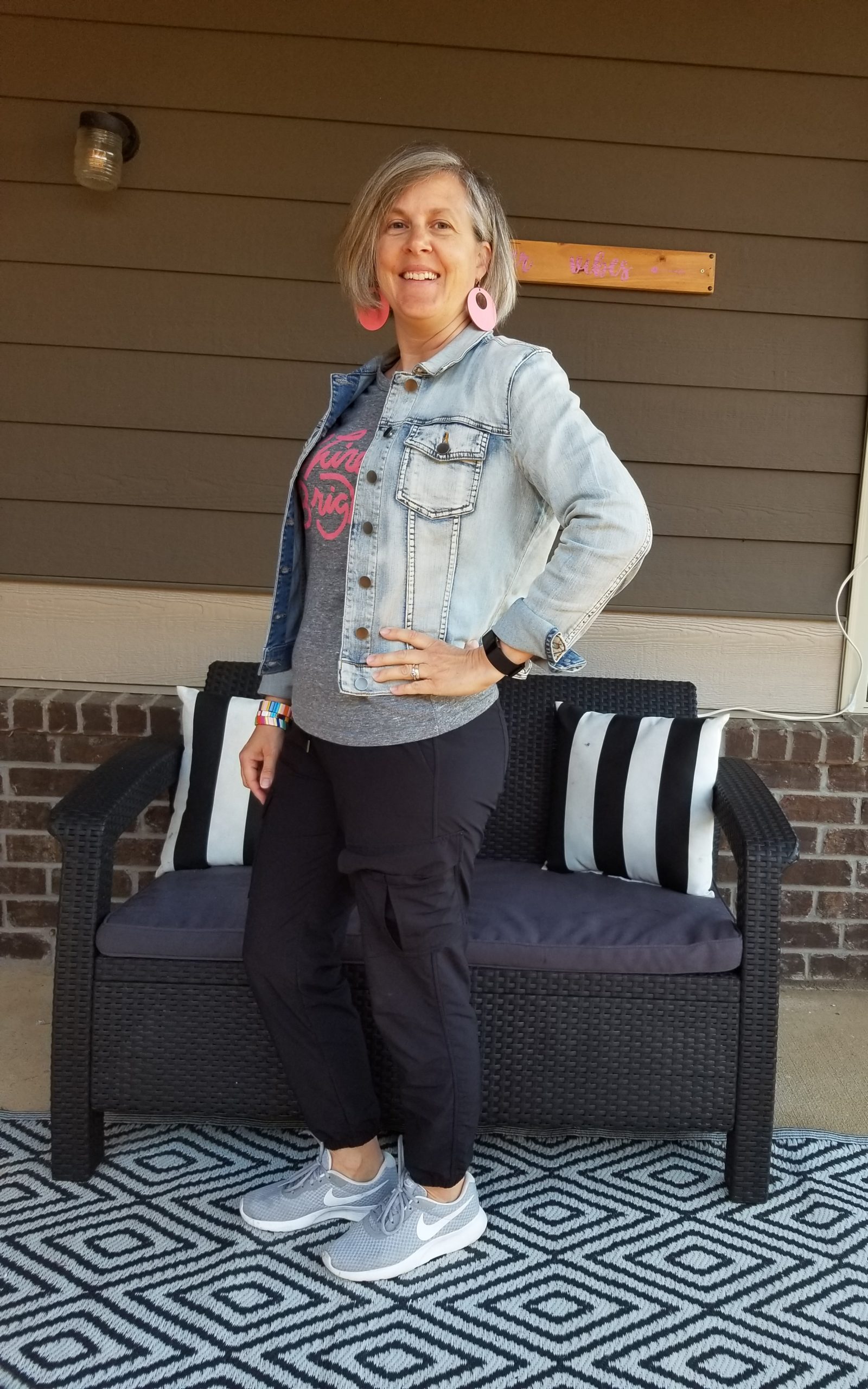 Denim with joggers, pantsuit, dresses, skirts…. Denim jackets with black white and navy… Denim jackets with all kinds of footwear! They are a great lighter layer that hint to spring and warmer weather and are very versatile!