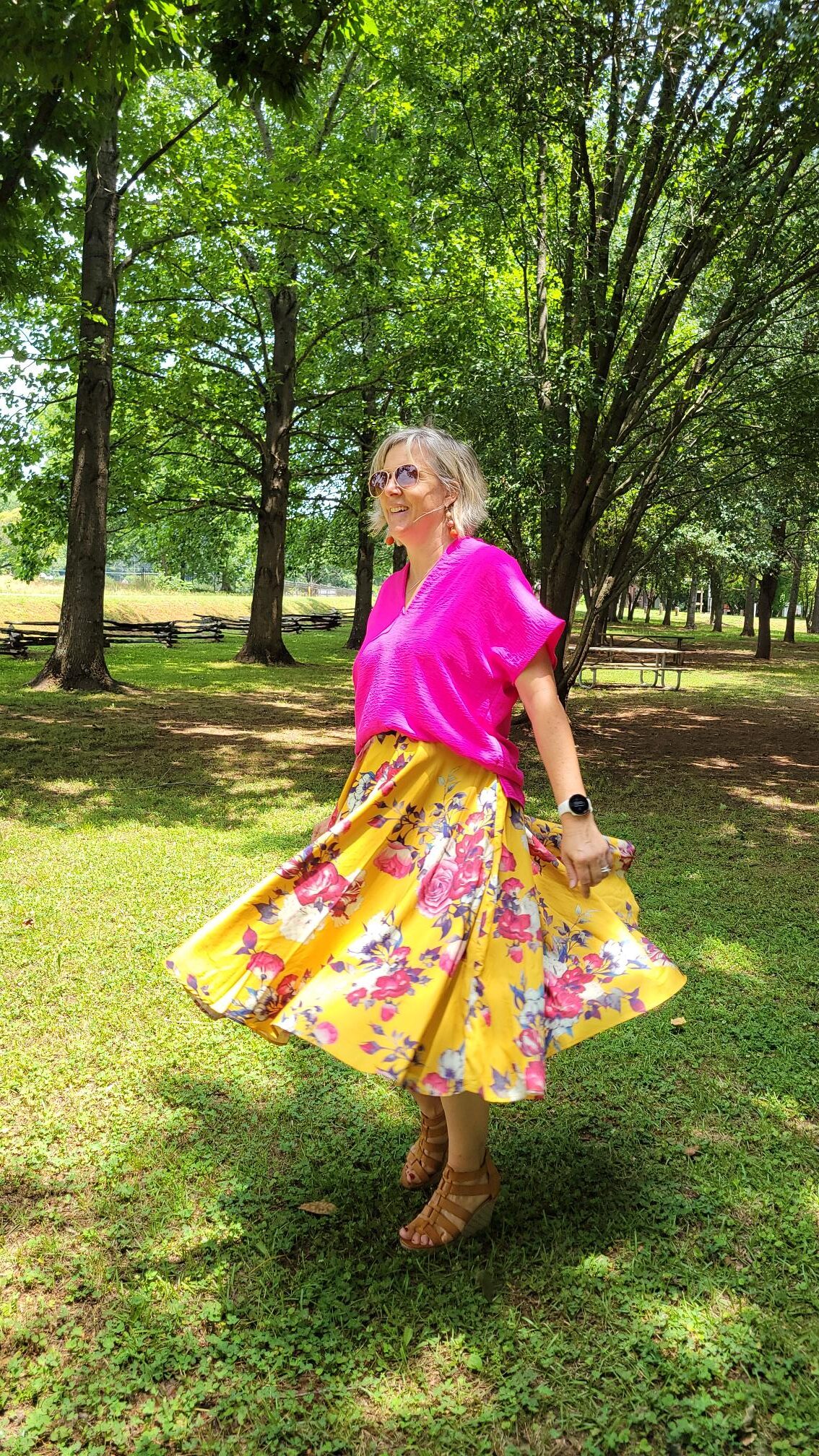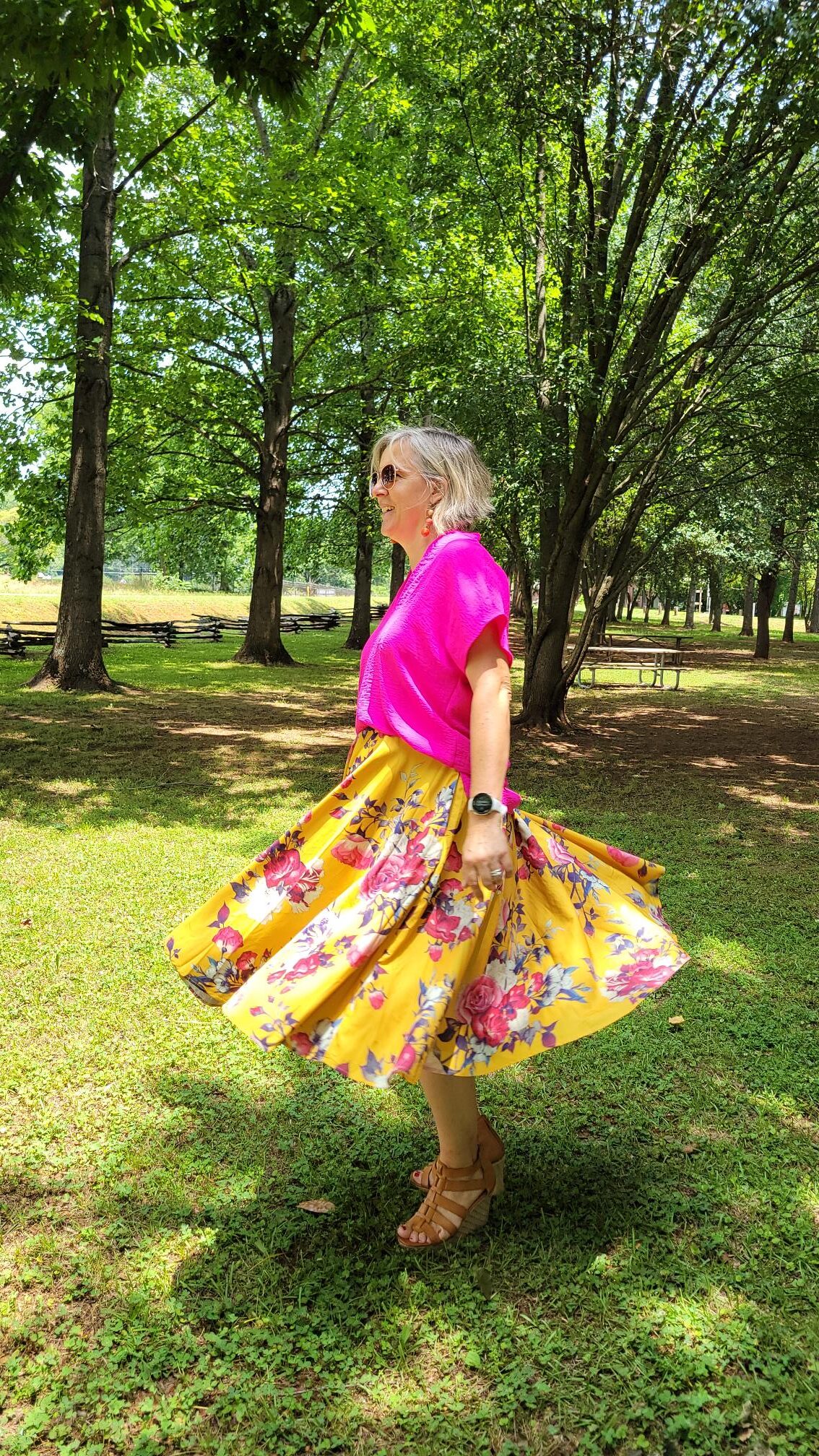 I wore this bright and cheery outfit for Sunday church in June. I have had my Modcloth skirt for several years now and you has seen featured on the blog several times (here, here and here). Since receiving this bright fuschia top from I’ll be have what she’s wearing, I have found several opportunities to wear it and found a perfect match in the bright pinks in this skirt.