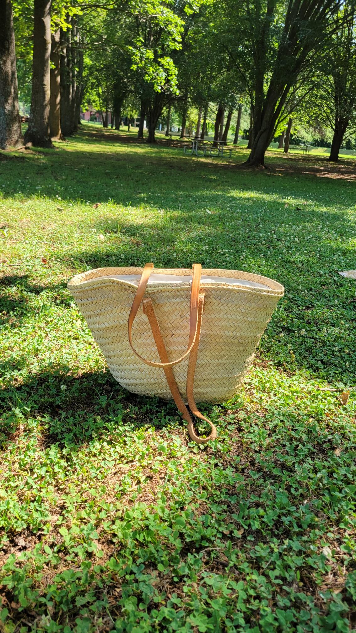 Another look at my basket: I love the long straps and that it has a zipper so things do not fall out. It was a souvenir bought while we were in Catalunia, Spain in 2019.