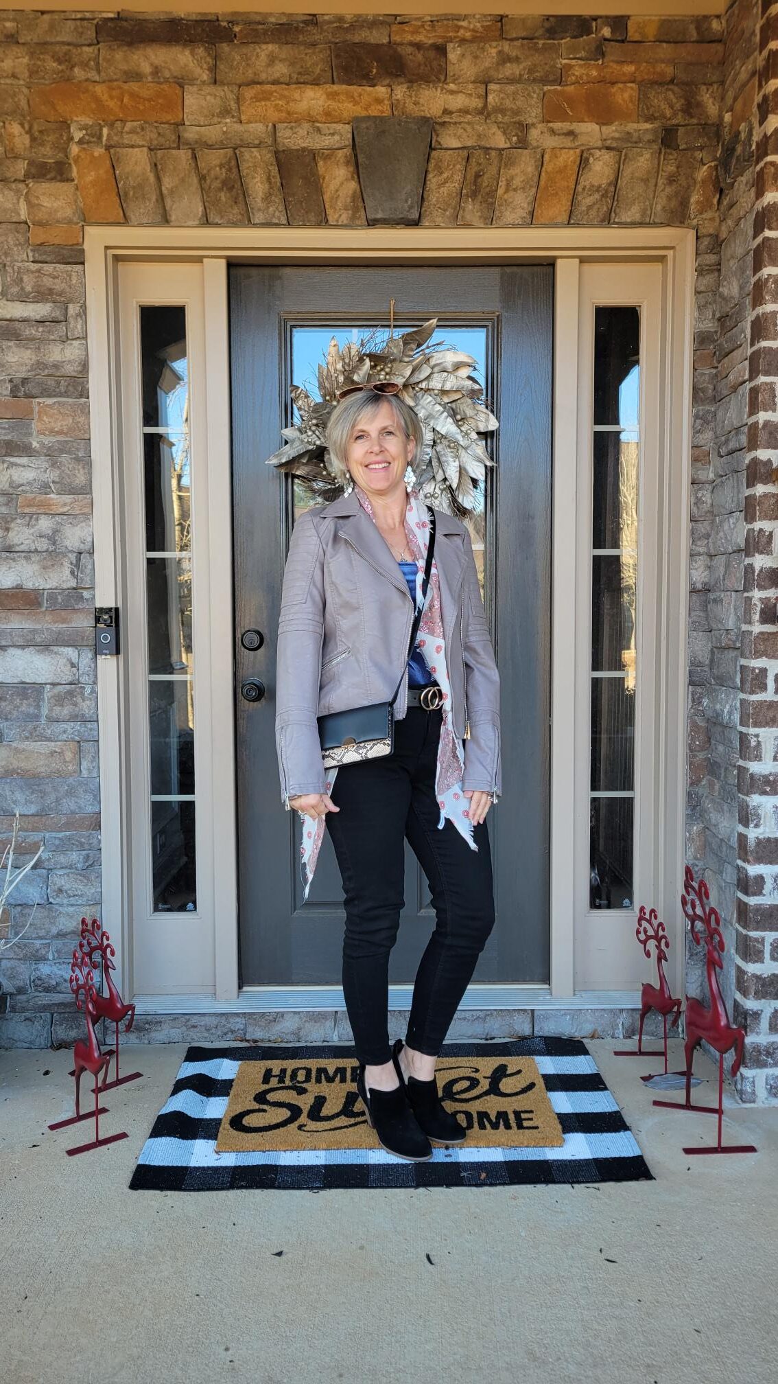 My fun silver earrings always add some shine and bling when I want to dress up an outfit. I hadn’t worn my faux leather jacket in a while and I thought it paired well with the scarf colors.