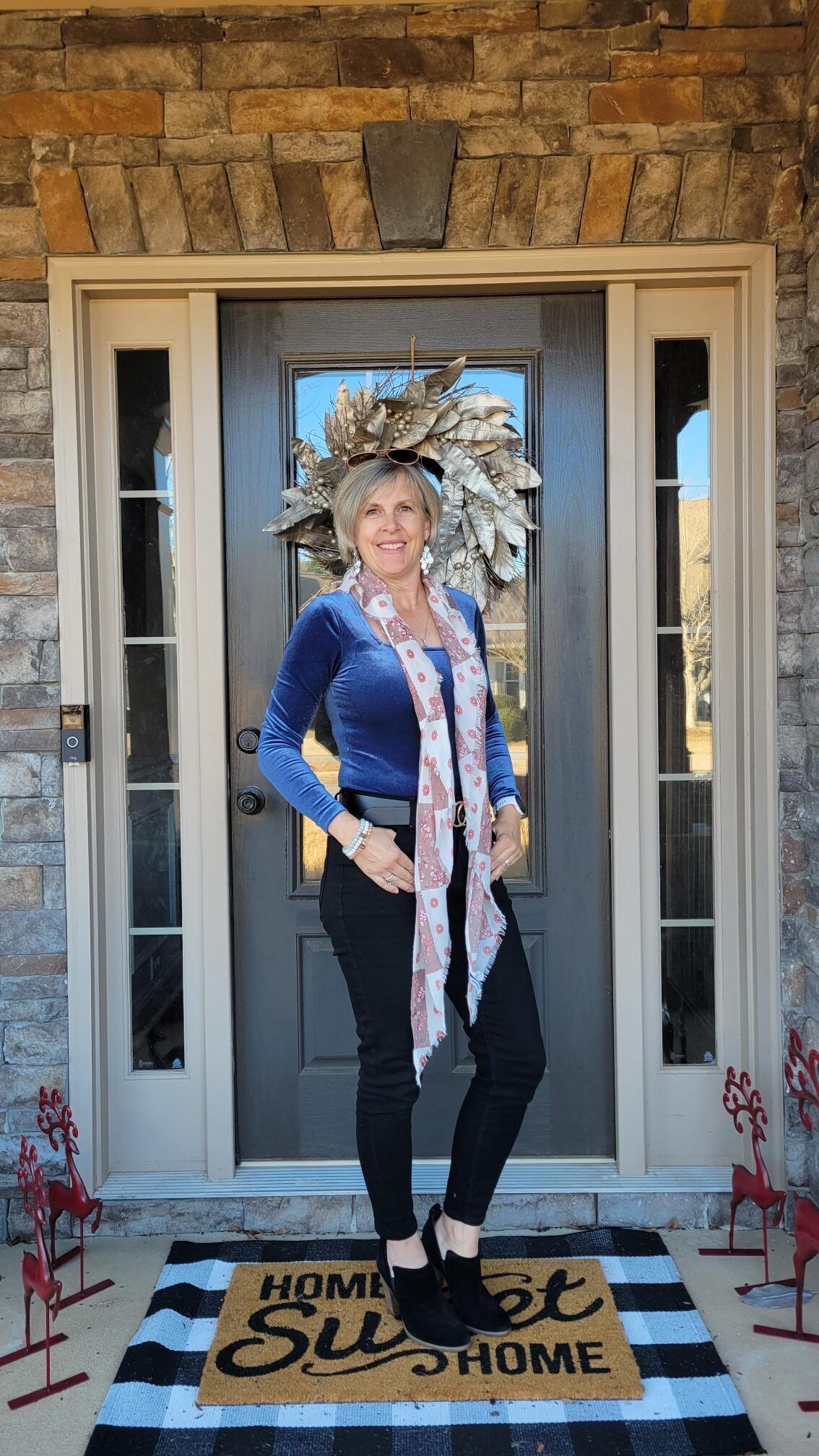 You have may have seen Cathie in several of Jodie’s blog posts and I asked her to join me today because I have loved all of the holiday sweaters and outfits she has shared on her Instagram page. I love her dark green top and fun fur vest in this outfit. Please keep her in your prayers as she recovers from foot surgery.