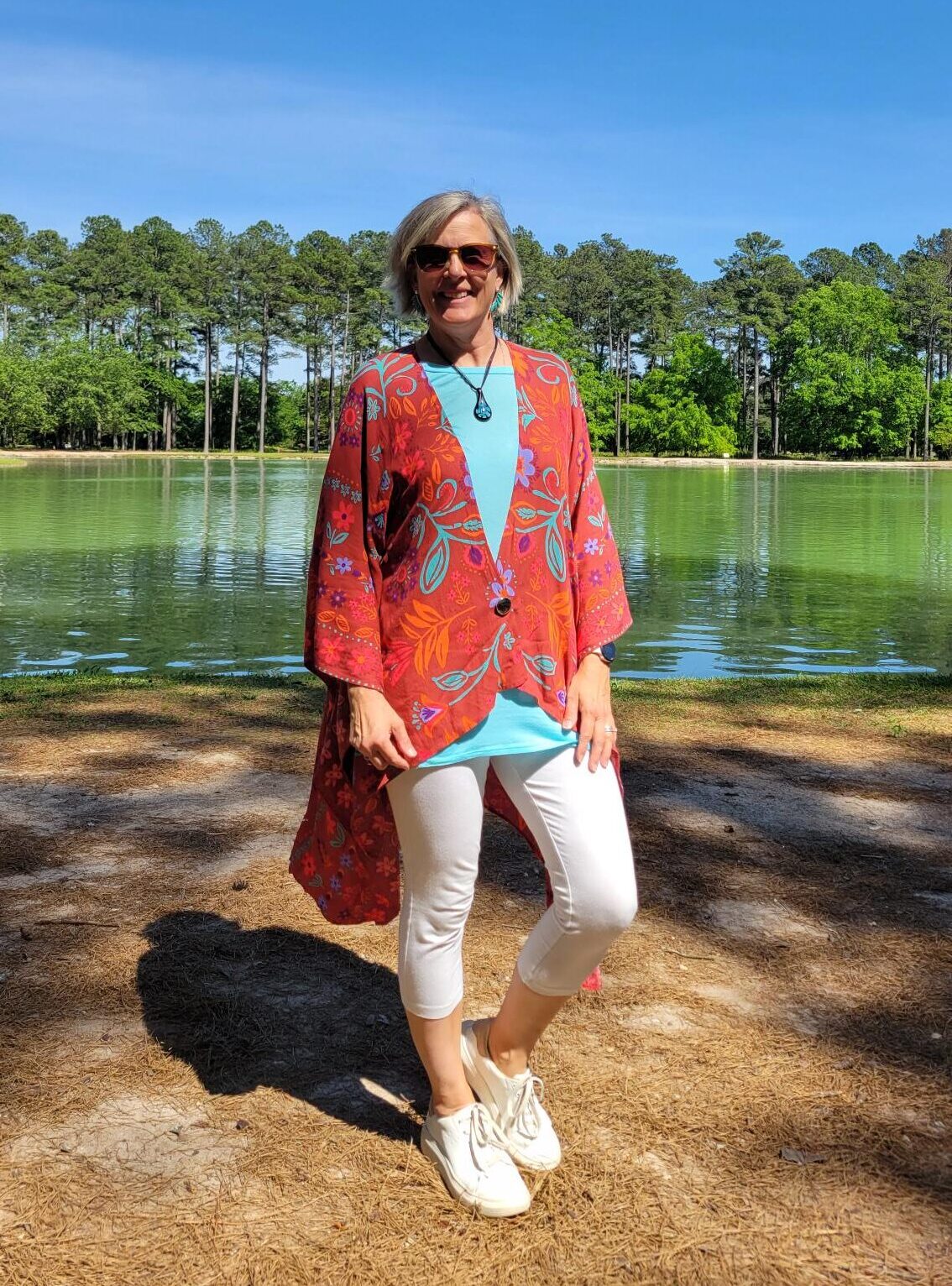 I wore this for my son’s first college visit. It took me a minute to figure out which top to wear under the kimono since I wanted something bright and a little longer since I was wearing leggings. I really love the color combo of this red/orange and turquoise similar to the outfit with the jeans.