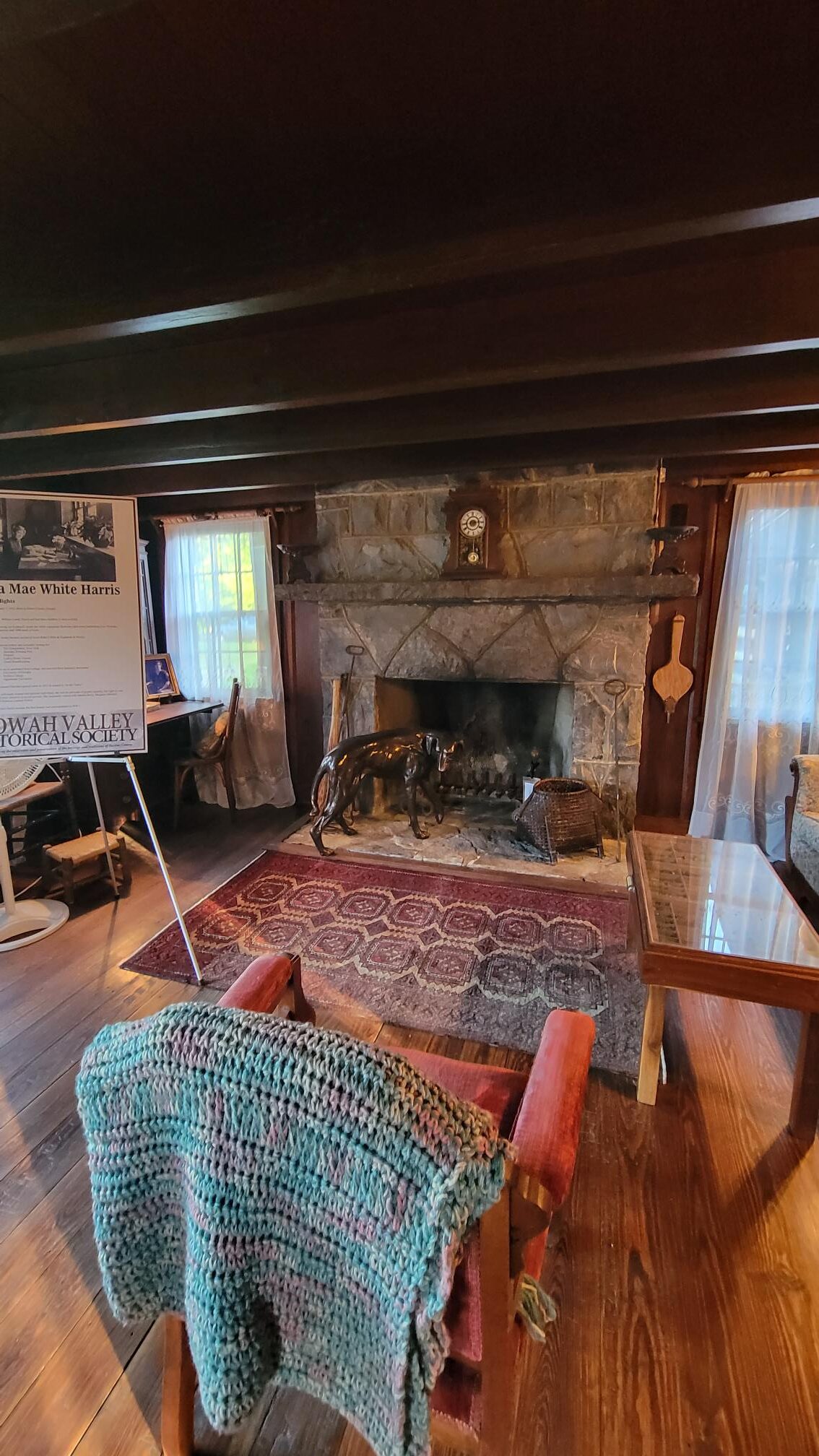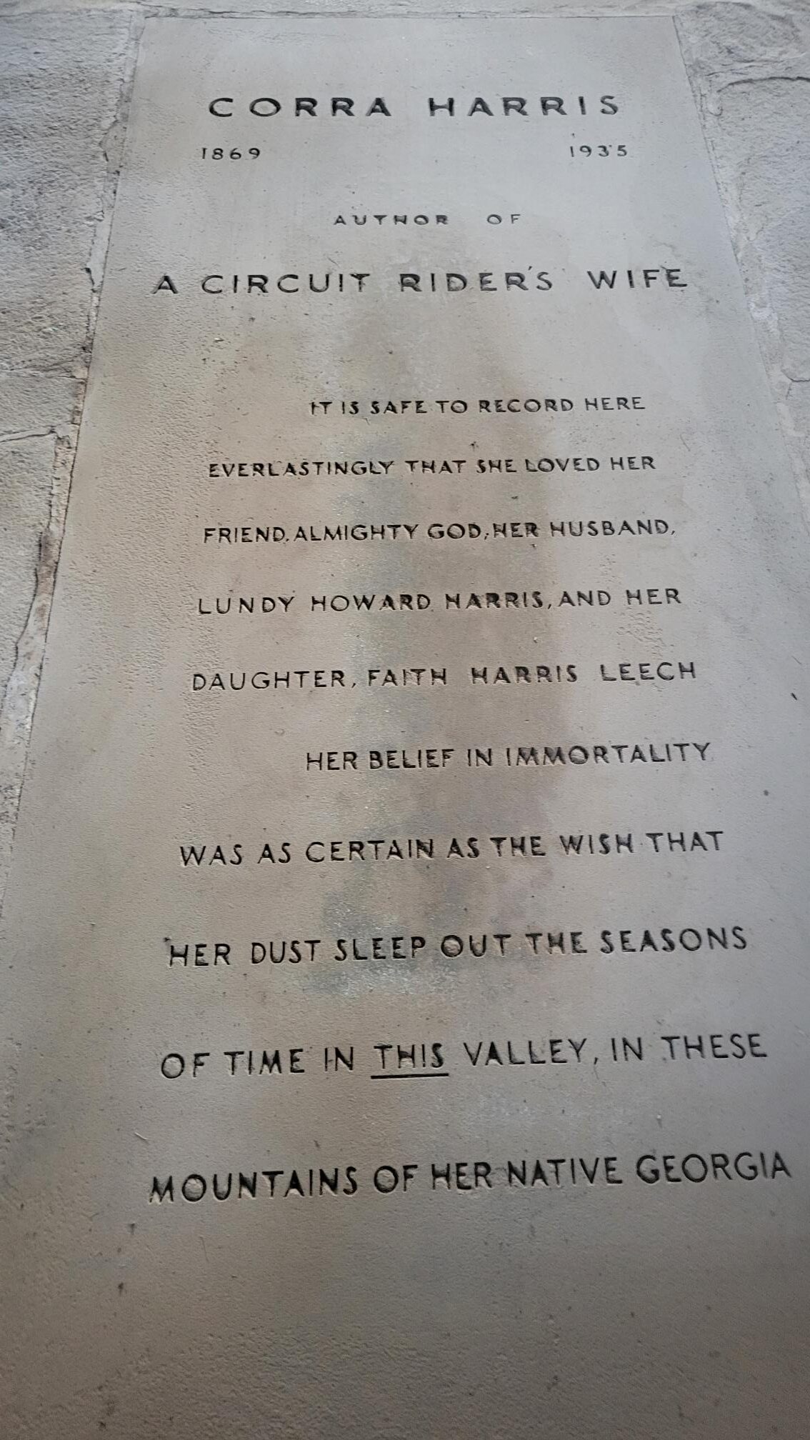 Corra Harris (1869-1935) was a circuit rider’s wife. Corra Harris bought this property in 1913 and named it “In the Valley”. Rock from the local quarry was used to add to the foundation of the cabin. Corra Harris was the 1st woman in the state to own a car and was the 1 female battlefield war correspondent in WW1 for the Saturday Evening Post. Two of her books were turned into a movie (I’d Climb the Highest Mountain). She had 3 children of which one lived past birth.