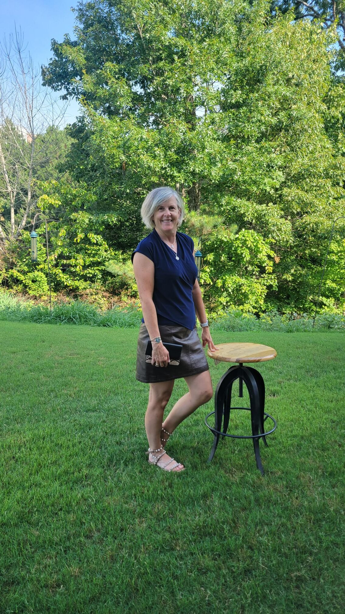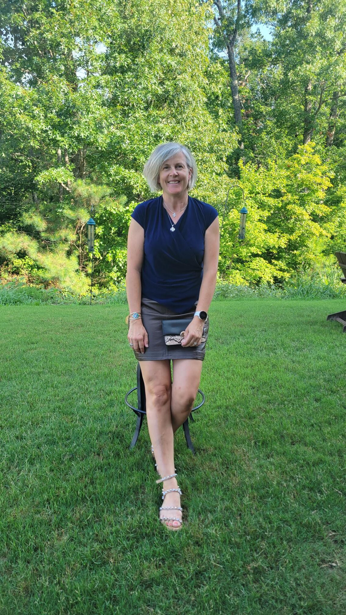I wanted to show you some options that were casual too, so here is the top paired with olive shorts and sneakers. The more I took pictures, the more ideas I had so go have fun with navy and other pieces in your closet! The fabric the mother/daughter team uses feels really good to the touch and does not wrinkle which makes it perfect in our humidity and heat.