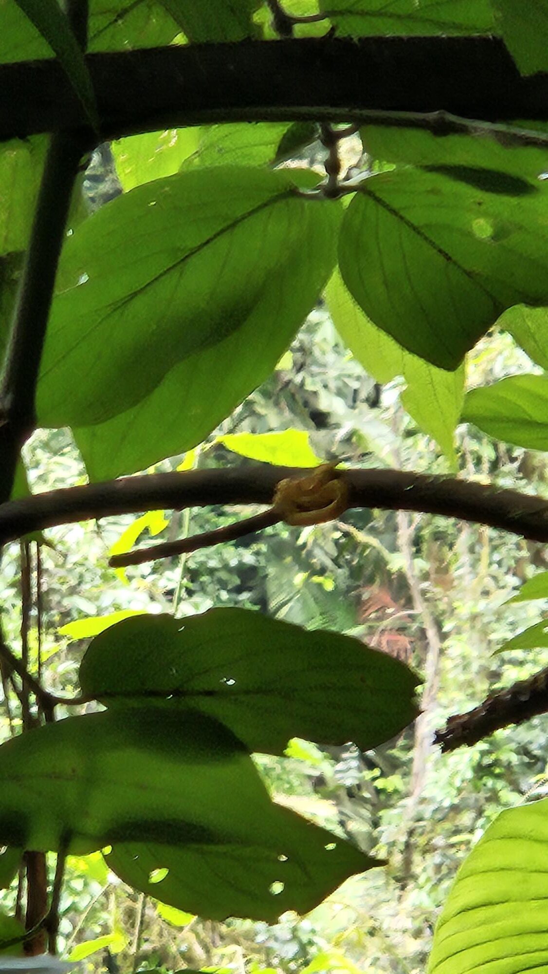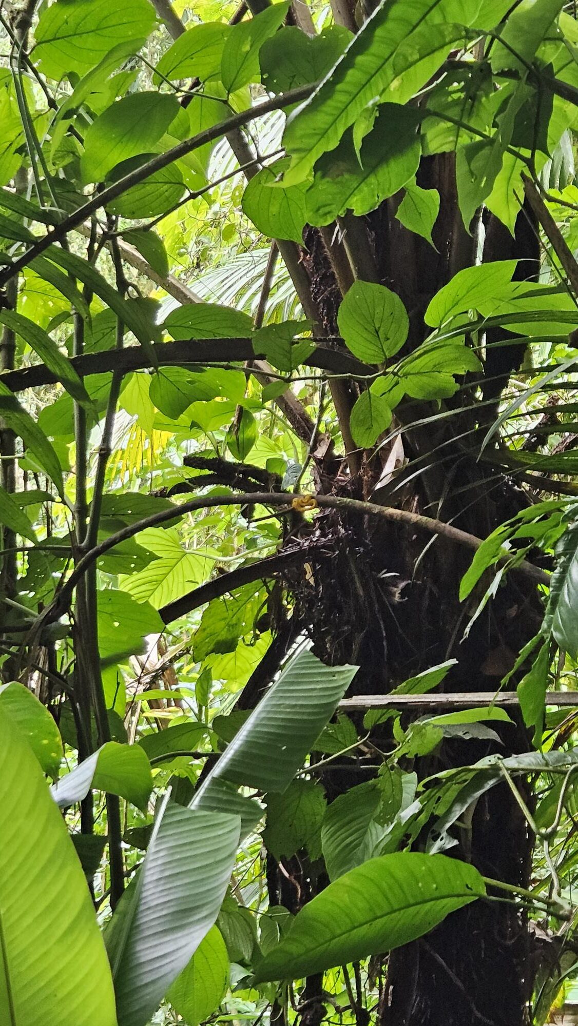 See that little yellow snake? On the right is a blurry enlarged picture of it. That is a jumping pit viper, yes, I said, jumping! It is very venomous and as this was a little one, even more dangerous as the young snake will let out all of its venom as it does not know yet how to control it. We were advised not to get too close to the ramp (he was on the other side of the trail behind the ramp and not that close).