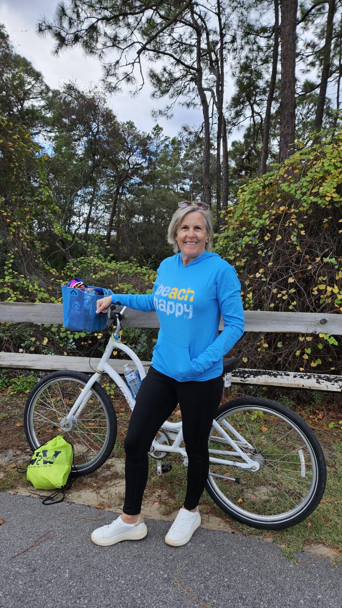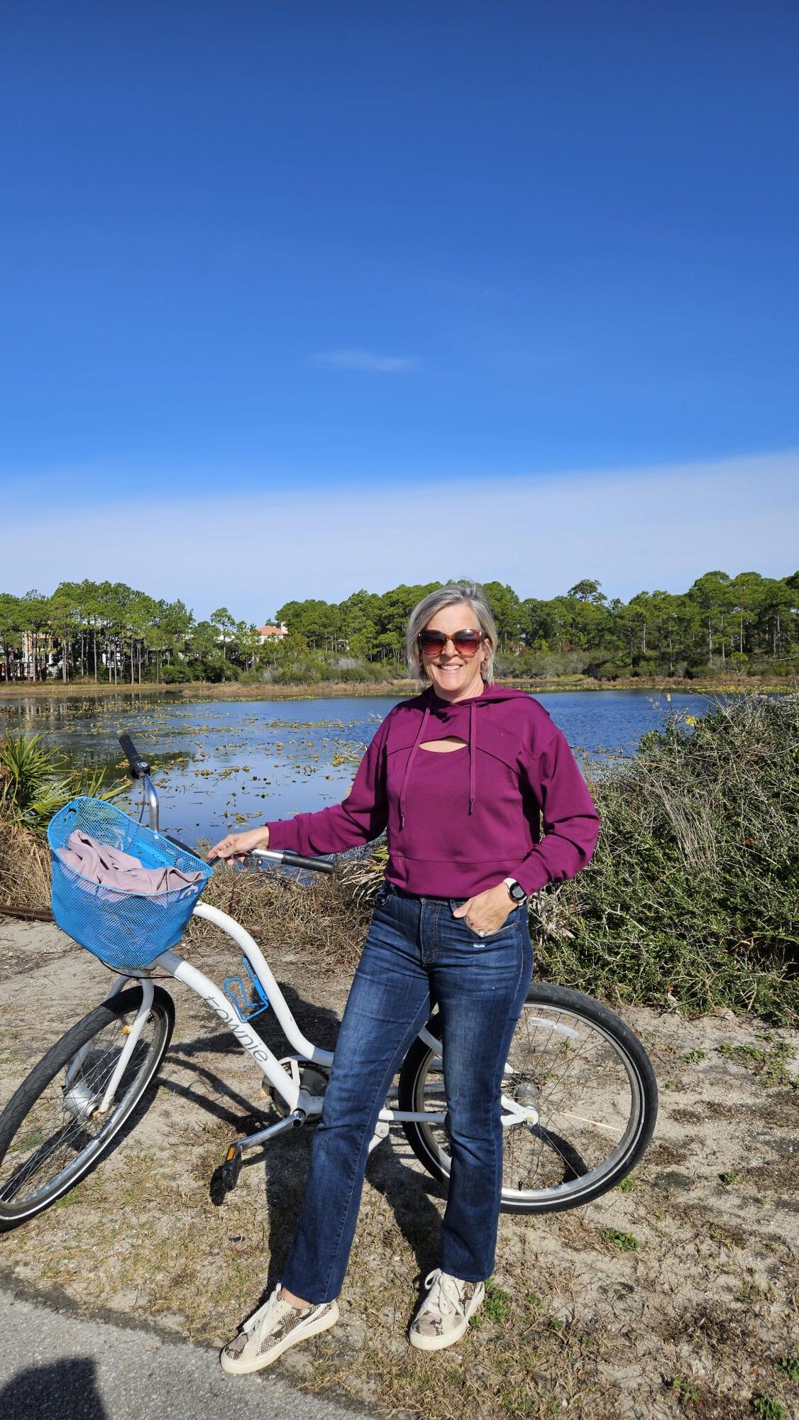 Chilly day riding bikes the day before Thanksgiving! I packed my leggings last minute and was glad I did since we ended up renting bikes for the last 3 days of our vacation. I purchased the turquoise hoodie as a souvenir for several reasons: I love the color and it is a perfect reminder of our vacation, and I can wear it for running as I have just a couple long sleeve running tees. I brought along my cozy sweatshirt (a souvenir from our June vacation to TN) and it kept me warm on the bike ride as well as every morning on the beach. Not portrayed is my tan beanie that I wore to keep my head warm!