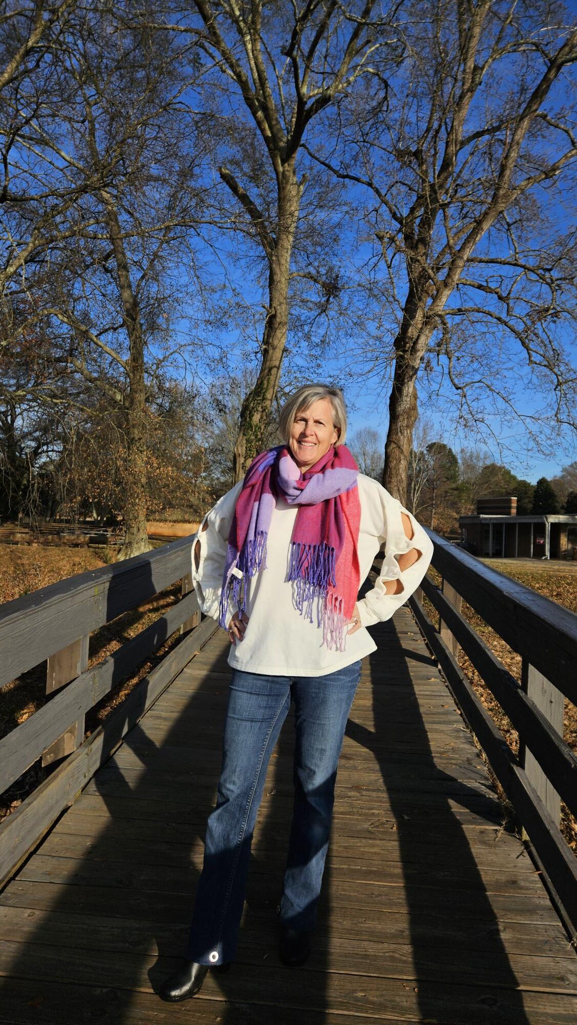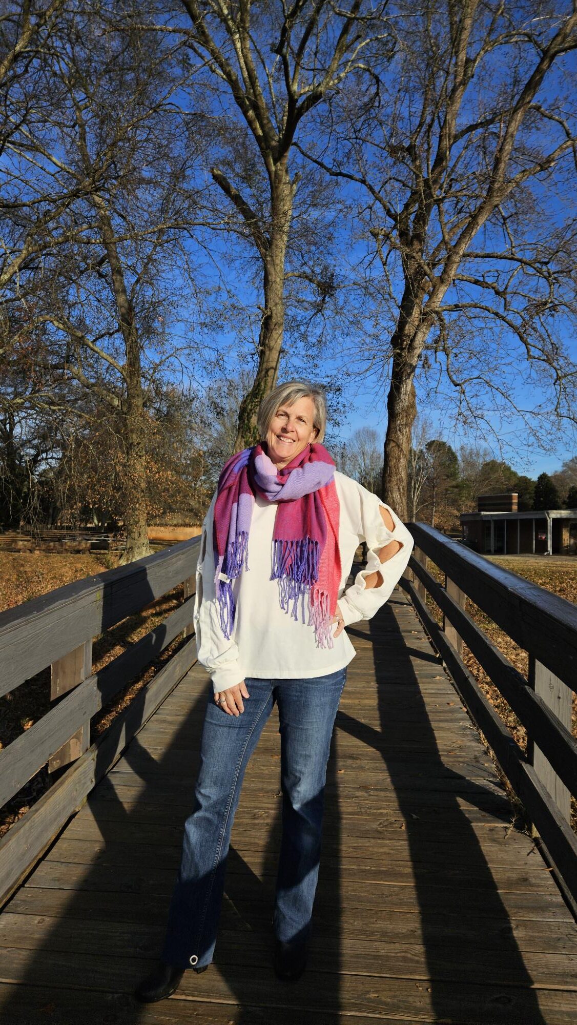 Love your scarf. The colors suit you so well.