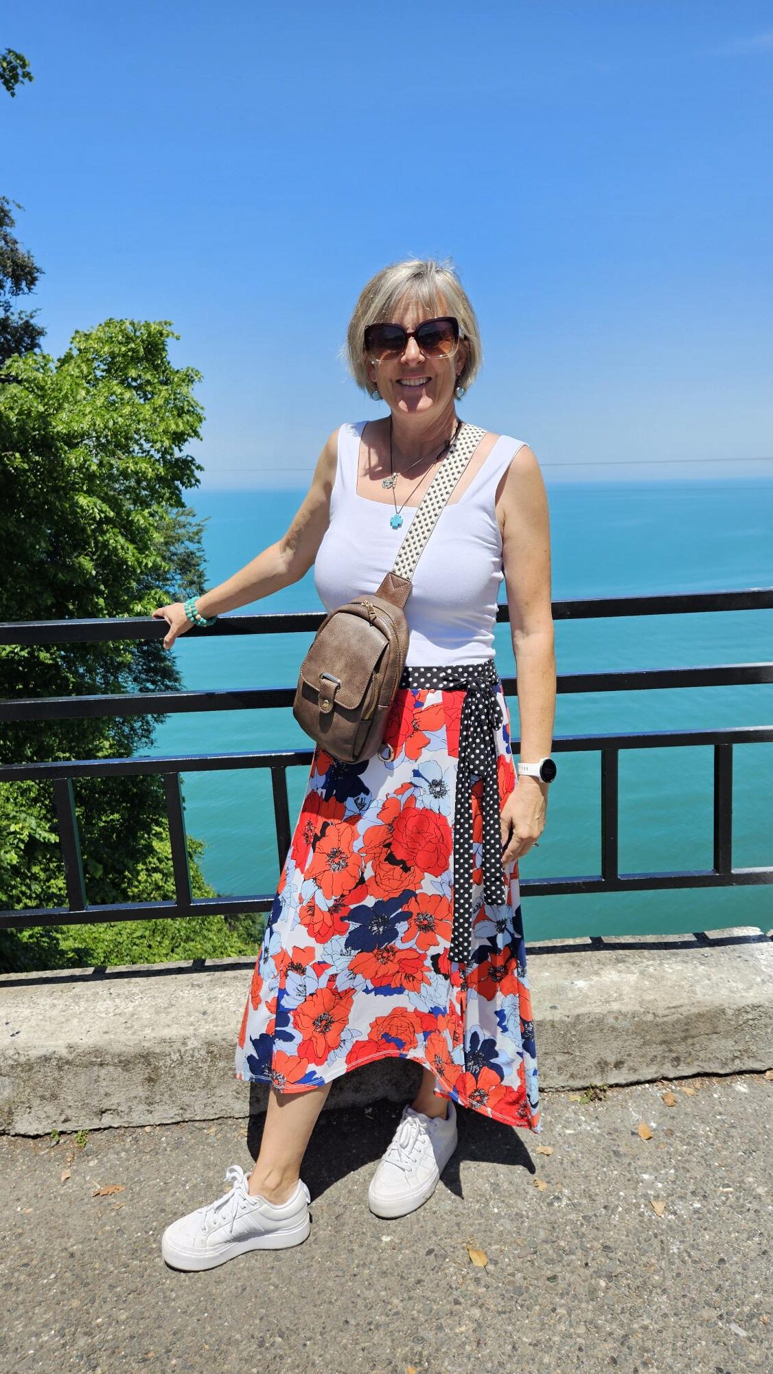 So glad to have this example of packing a carry-on with enough outfits for a week or more of travel. I managed to pack only a carry-on for our trip to Boston/NY/Ohio. But glad to see your outfits and suggestions. Have been contemplating linen pants but I don’t think they will be flattering on me and I don’t want to try them on and then get all depressed!! Ha!! Plus wrinkles. But they would be cool and comfortable. Might need to look into a longer skirt in a print like yours that I could cahnge up with different solid tops. My favorite looks are the red/blue top/blouse with the jeans and the black top with the aqua floral skirt. You look fit and youthful and fun in everything. Hope it was a wonderful vacation.