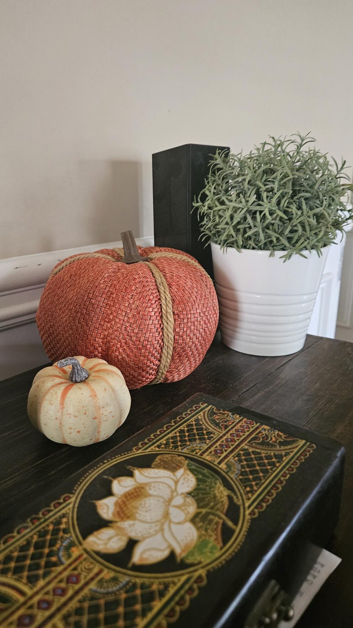 I usually go all out for Fall and Christmas decorating. But, this year has been different. Most of my pumpkins (which are ceramic) are in the attic. So, I had do with the ones that were in the house. My heart just isn’t in it this year.