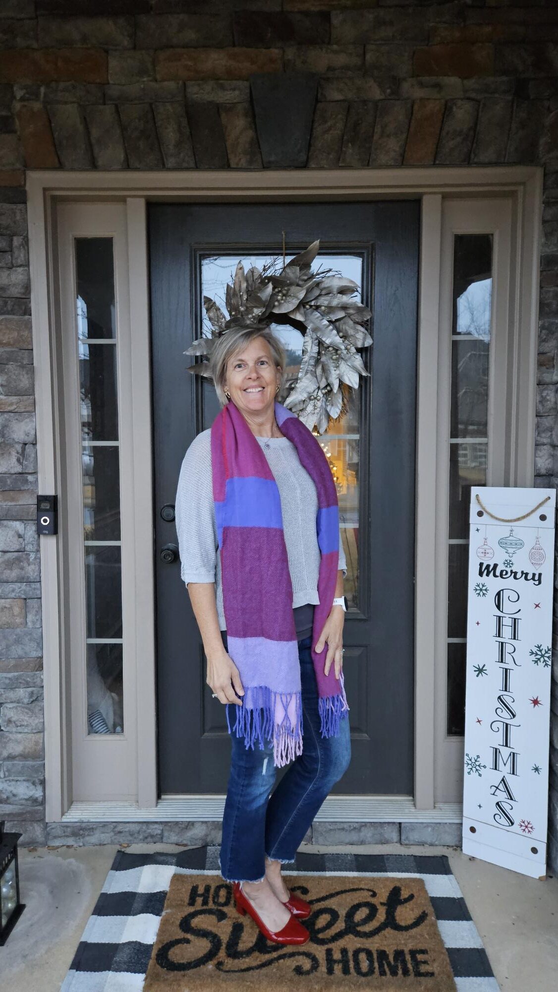 I went Christmas shopping with my sister in law. She lives near all of the stores in Kennesaw, so we got together for shopping and lunch. It was a lot of fun! I wore a thrifted sparkly top and tank, and jeans from a local boutique. I thought the scarf and the pumps (which I will be sharing next Wednesday) added a festive touch.