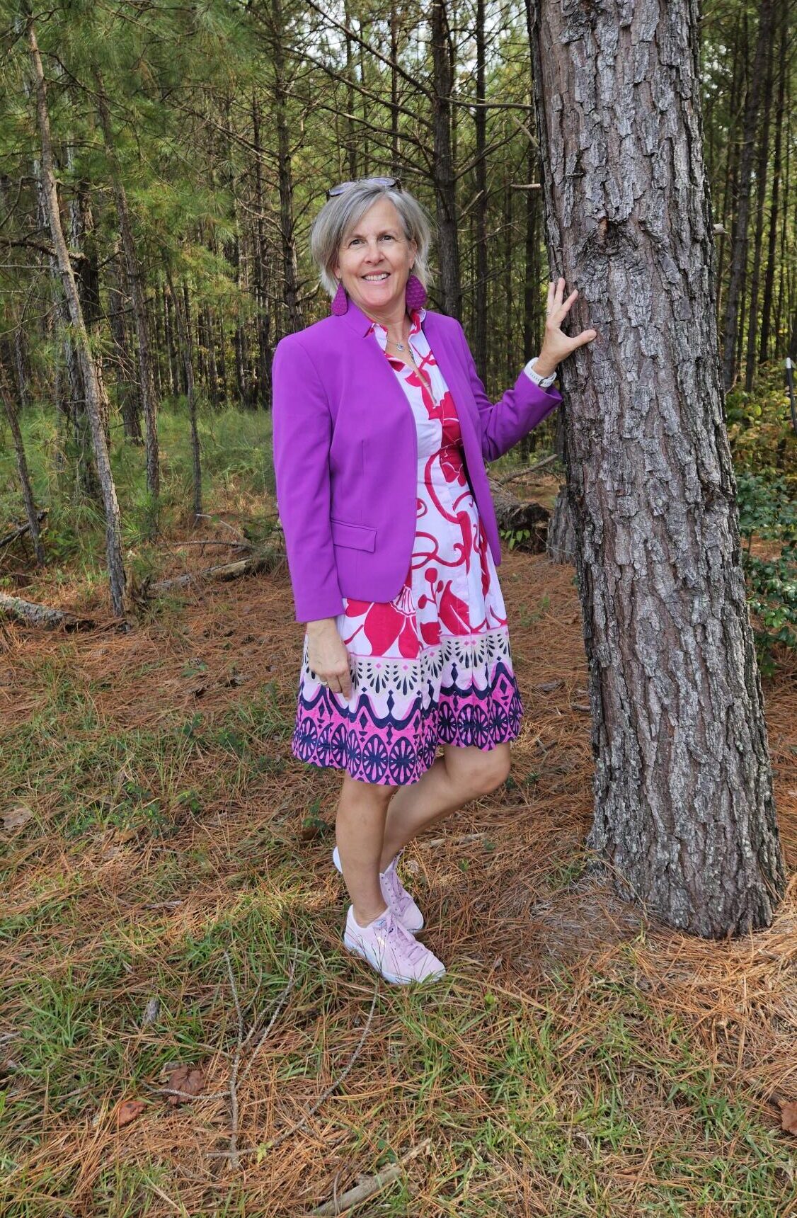 That blazer is stunning! I just love the bold purple shade! It looks so good with all of your outfits!