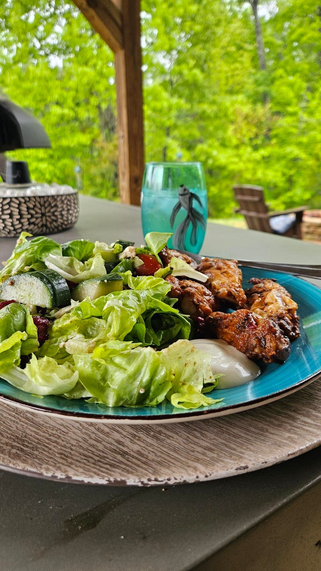 I had my coffee (sometimes breakfast) and my lunch outside most days. I made use of my new checkered tablecloth to eat in the grass and the porch tables if I wanted to stay in the shade or if it was raining.