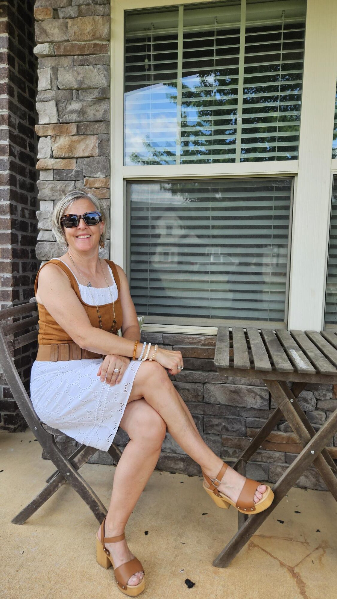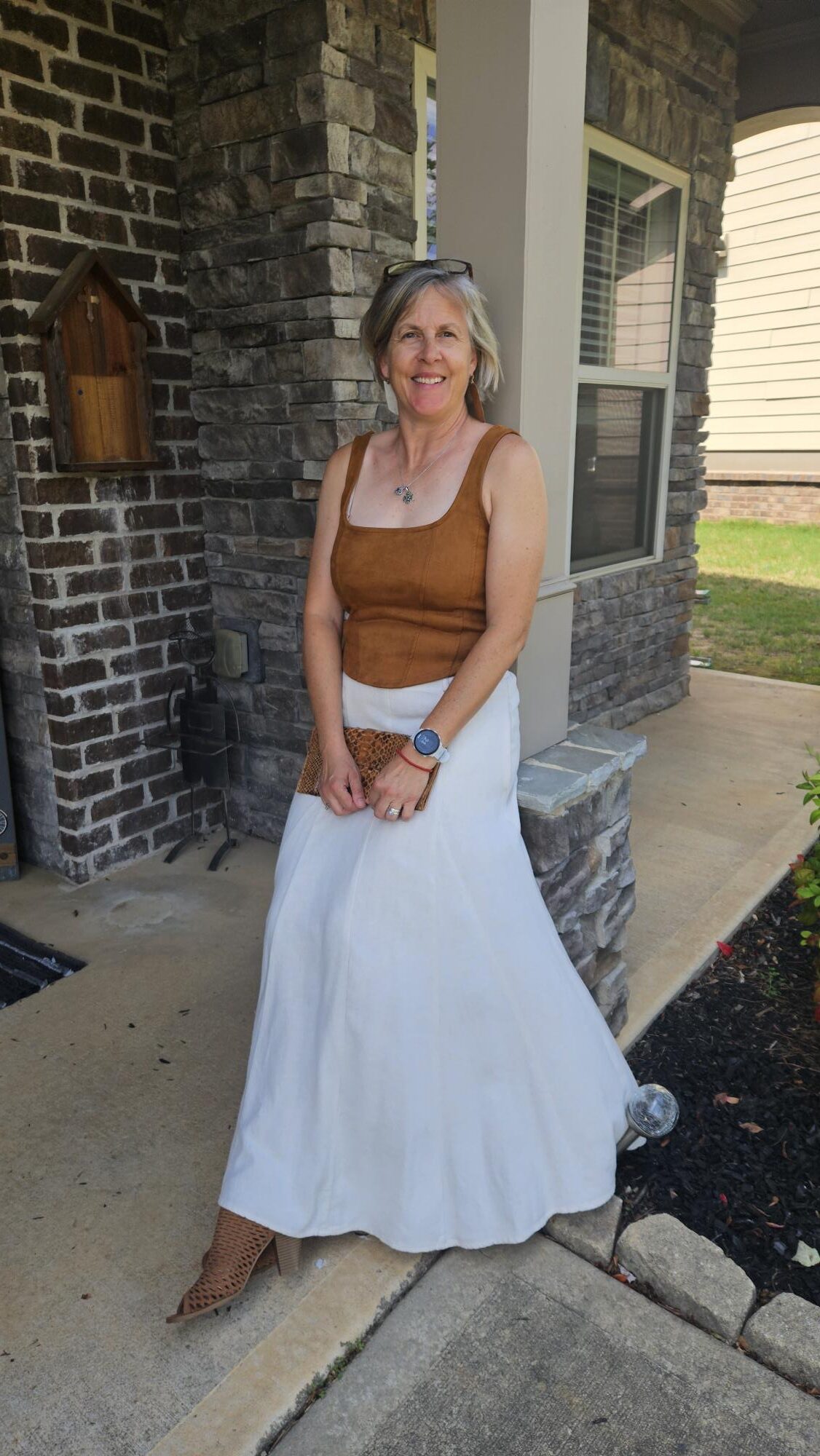I wore this outfit to the middle school play that my son played in. I liked the vest over the top because even though the pants were high waisted, I wasn’t worried about showing skin. The vest also add a different texture as the corset top is faux suede and the pants linen and the vest crochet! The only part of this outfit which is not second hand is my pants!