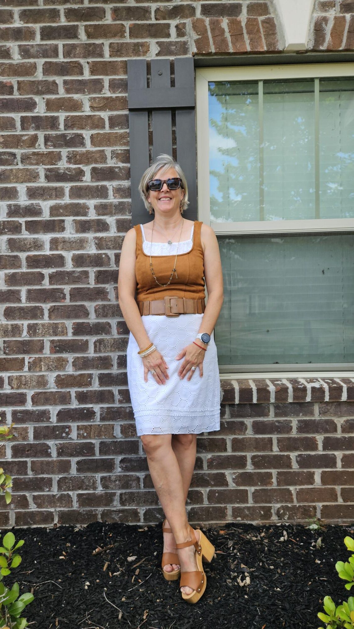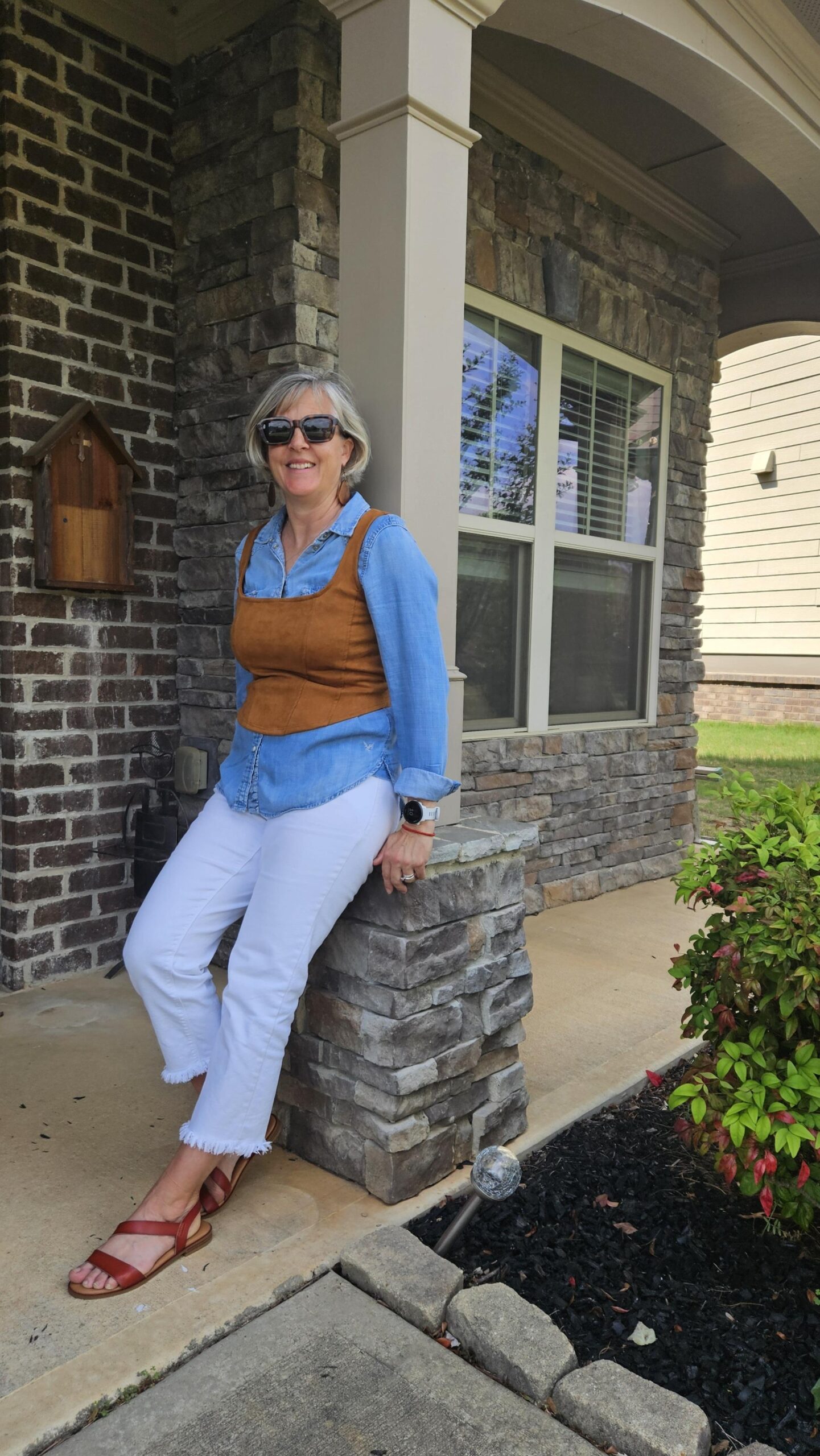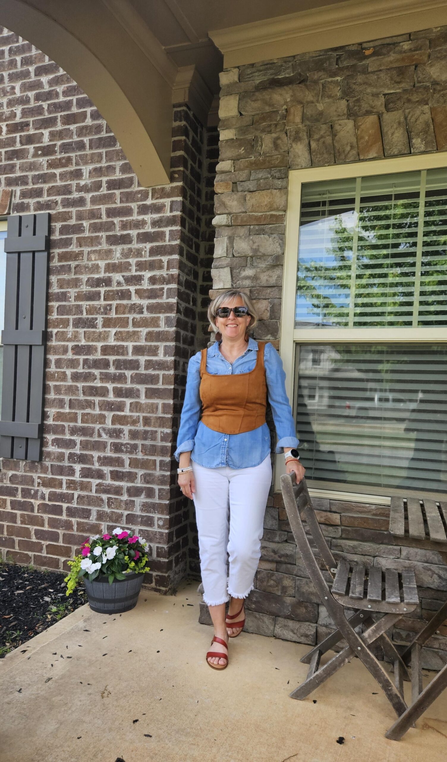 Today, I am sharing a corset top 3 Ways. I thrifted it last month when I was searching for cognac/caramel tone pieces to add to my closet. The price was right ($3) for something that I knew I could wear at least a couple of different ways. When I shared my outfit on my Instagram stories, Jodie reached out to me to collaborate on a blog post featuring different ways to wear a corset top and here is the link to her post. I thought it would be fun to see how I could wear it and it was definitely something I had to experiment with. I had 2 outfit ideas that I chose not to photograph:  one with peplum blouse layered under (I looked like a German beer maid) and neither did I like it layered over a Halftee.