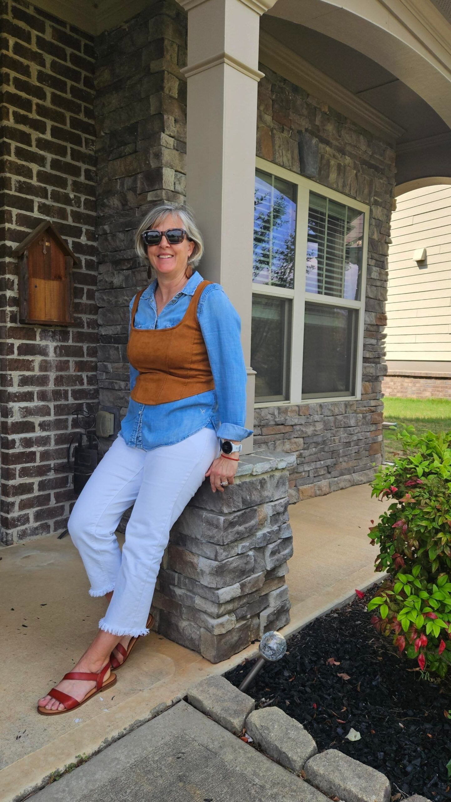Jodie suggested pairing it over a button down, and I looked at the few I have (I don’t wear them often). I wanted a fitted one so my choices were a black denim one, a blue denim one and a chambray one. I really love it with this chambray and white denim. I think the contrast in color makes it a cute and interesting outfit! I think that the corset top would also pair well with black shorts or black jeans.