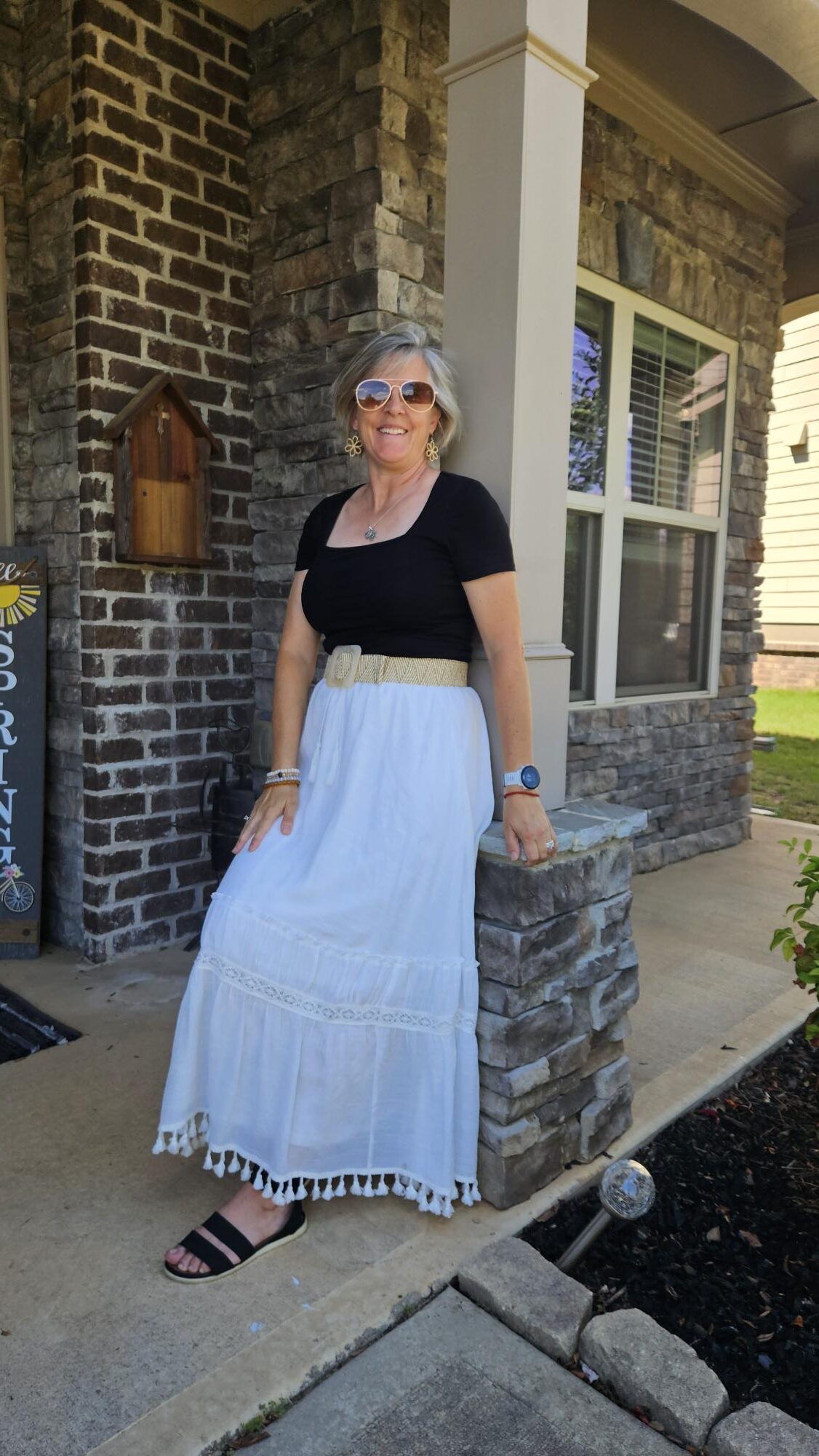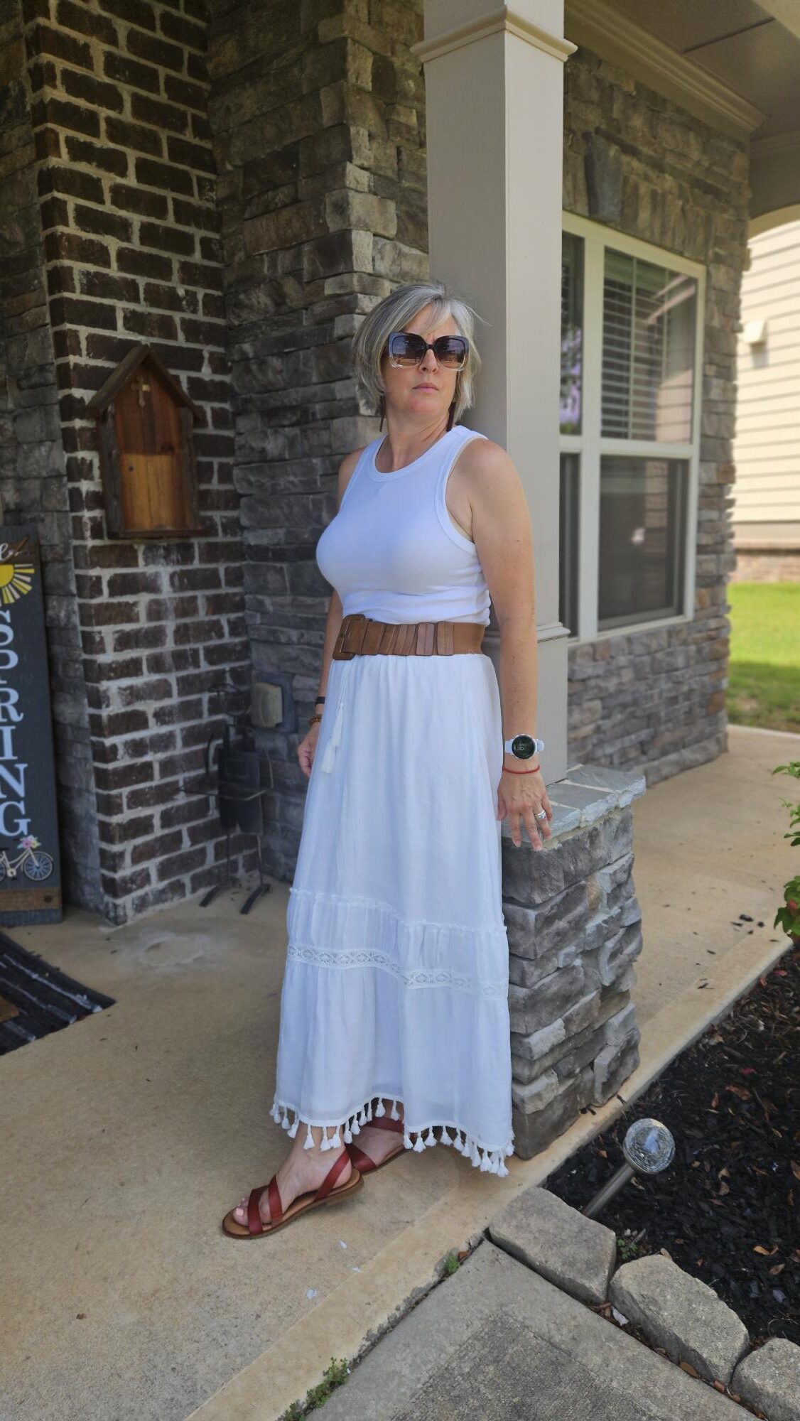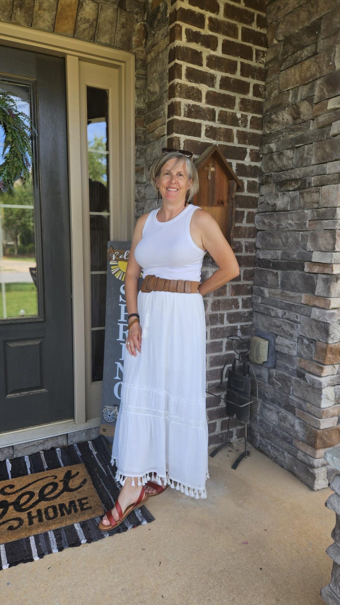 In the summer, when it is really hot, I like to wear my Target tank tops with maxis or my flowy pants. So this outfit was an easy one to put together since I always make sure to have a white tank on hand. My thrifted cognac belt is one of my favorites. I am wearing a newer pair of sandals I picked up at TJMaxx last month.