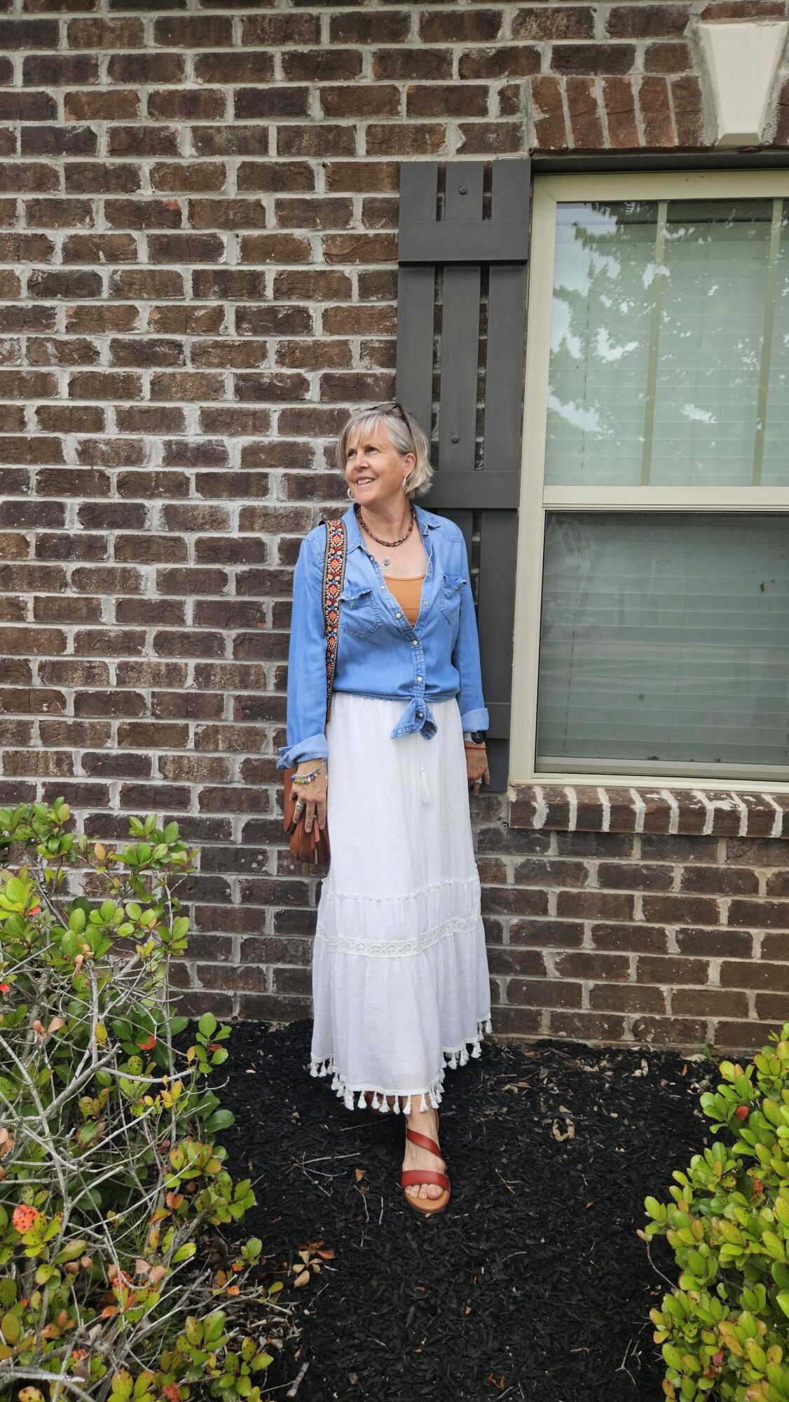 I saw 2 outfits on Pinterest that  featured a chambray and I liked both. I decided to first wear the skirt without a belt because I knew I would wear 2 outfits with belts for this blog post. I am so glad I am liking this thrifted chambray shirt: I  finally found one that I will keep and wear!