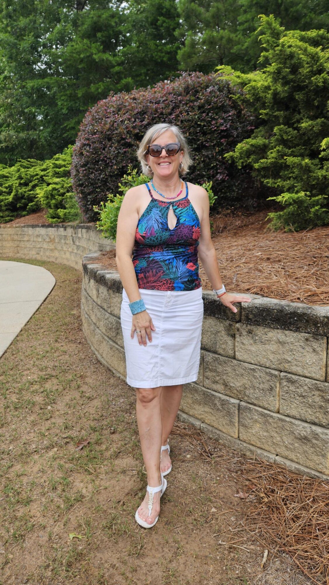 It’s time to beat the heat with the Ageless Style Link Up. Today’s theme was chose by Amy from Amy’s Creative Pursuits and I was inspired by one of the #wearitwednesday’s Instagram theme of bathing suits for today’s post. I really don’t mind wearing a bathing suit and wear 2 pieces, tankini sets and one pieces, but really do not like how I look in pictures when wearing one. And for modesty’s sake, I don’t usually feel confortable sharing pictures of me wearing a suit on social media. However, I really liked Jodie’s idea of wearing a bathing suit as part of an outfit and I have two tankini tops that lend themselves to such an idea.