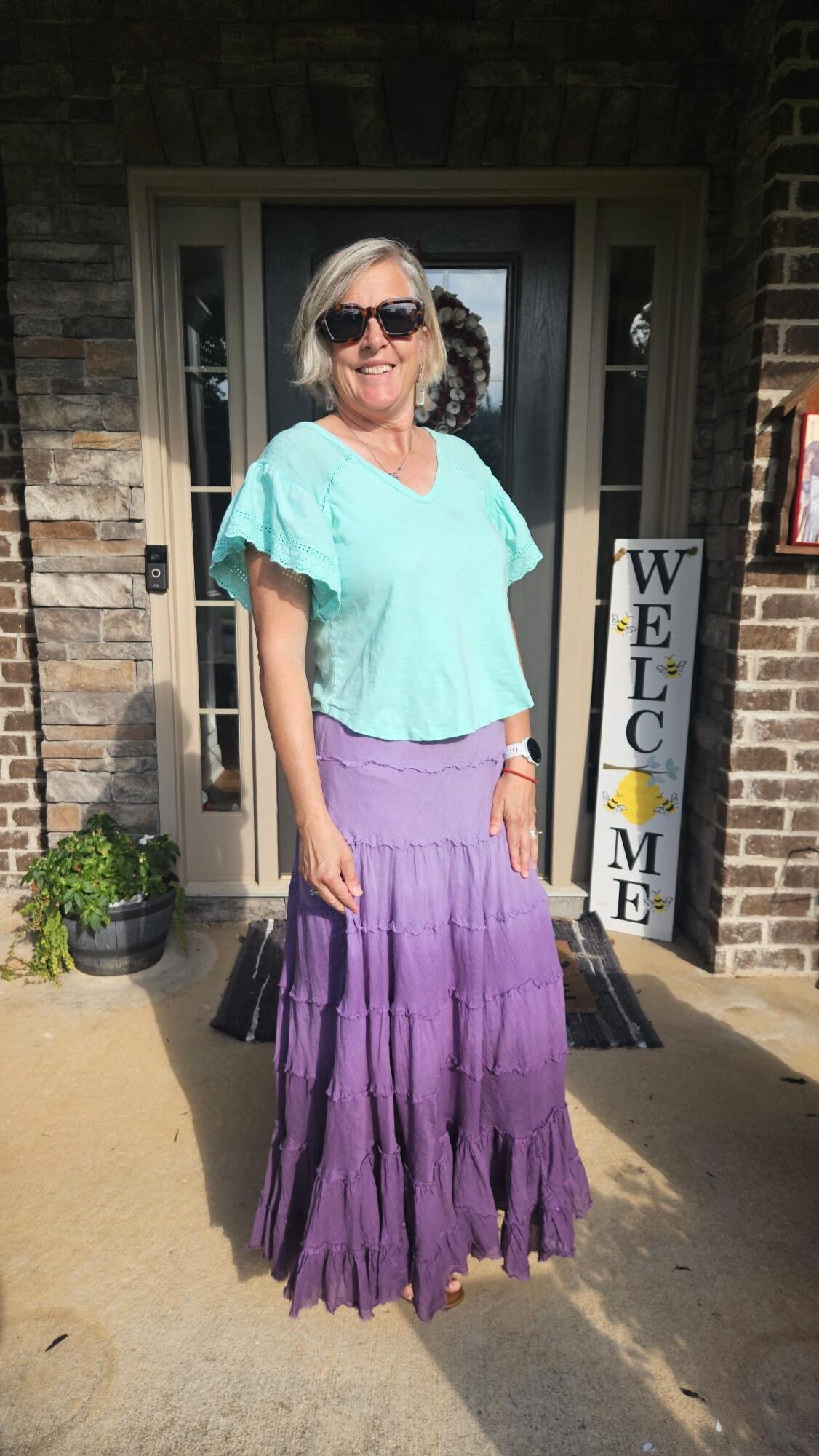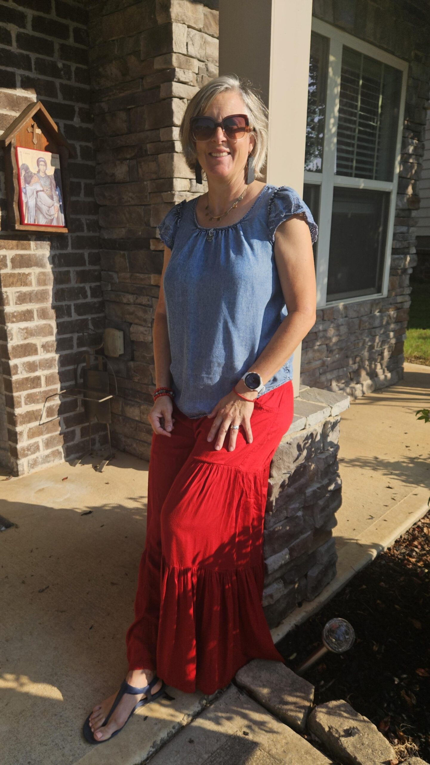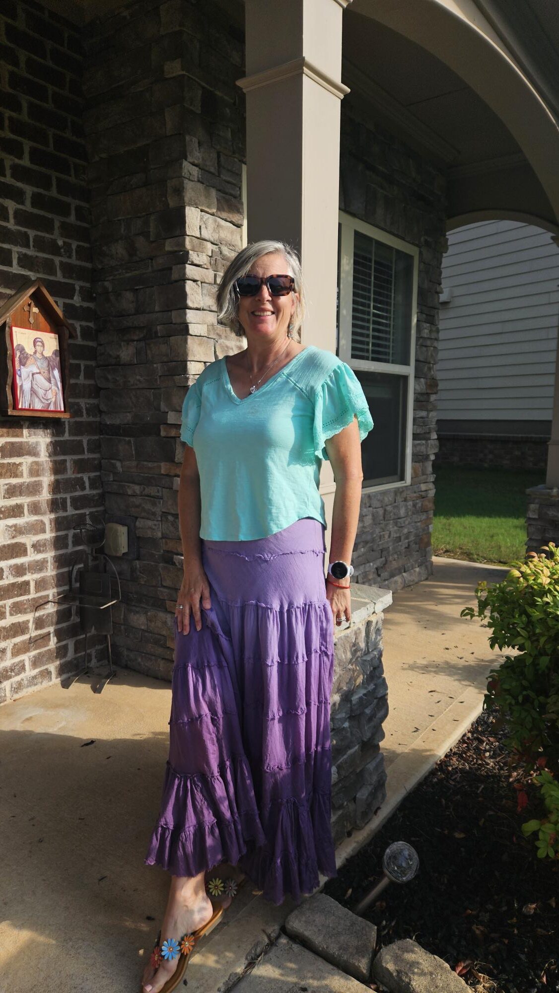 I have a lime green blouse that is more fitted that I could have used for my combo, but I don’t like it as much as this shirt. I think it is a bit frilly and the material is not cotton like this one, so it might be hotter for summer. I actually didn’t try it with this until I chose to photograph and wear it. So that gives me another combo to try soon!