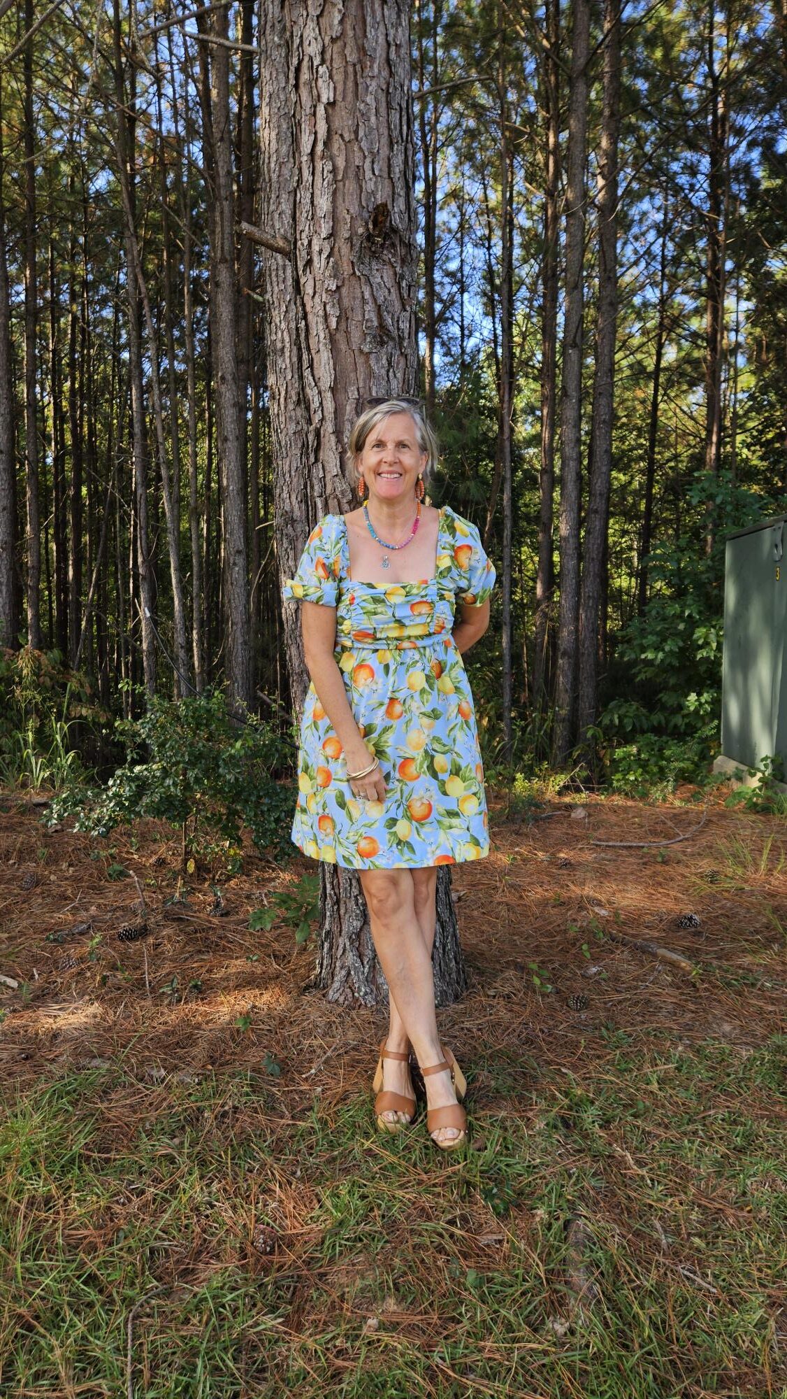 I thrifted this lemon and orange print dress in Chattanooga earlier in September. It caught my friend Rachel’s eye and since it didn’t fit her, I decided to try it on. While I did not have the right attire under, I could imagine how it would look done right, so I purchased it with this brunch in mind.