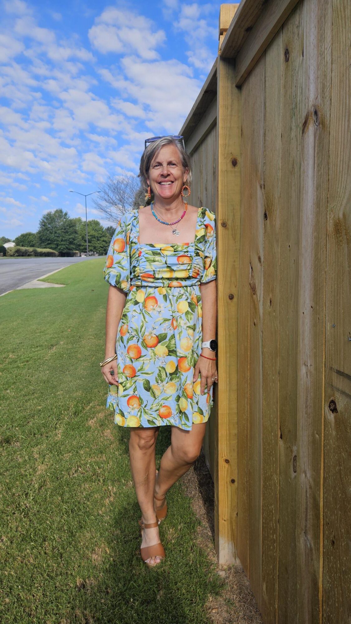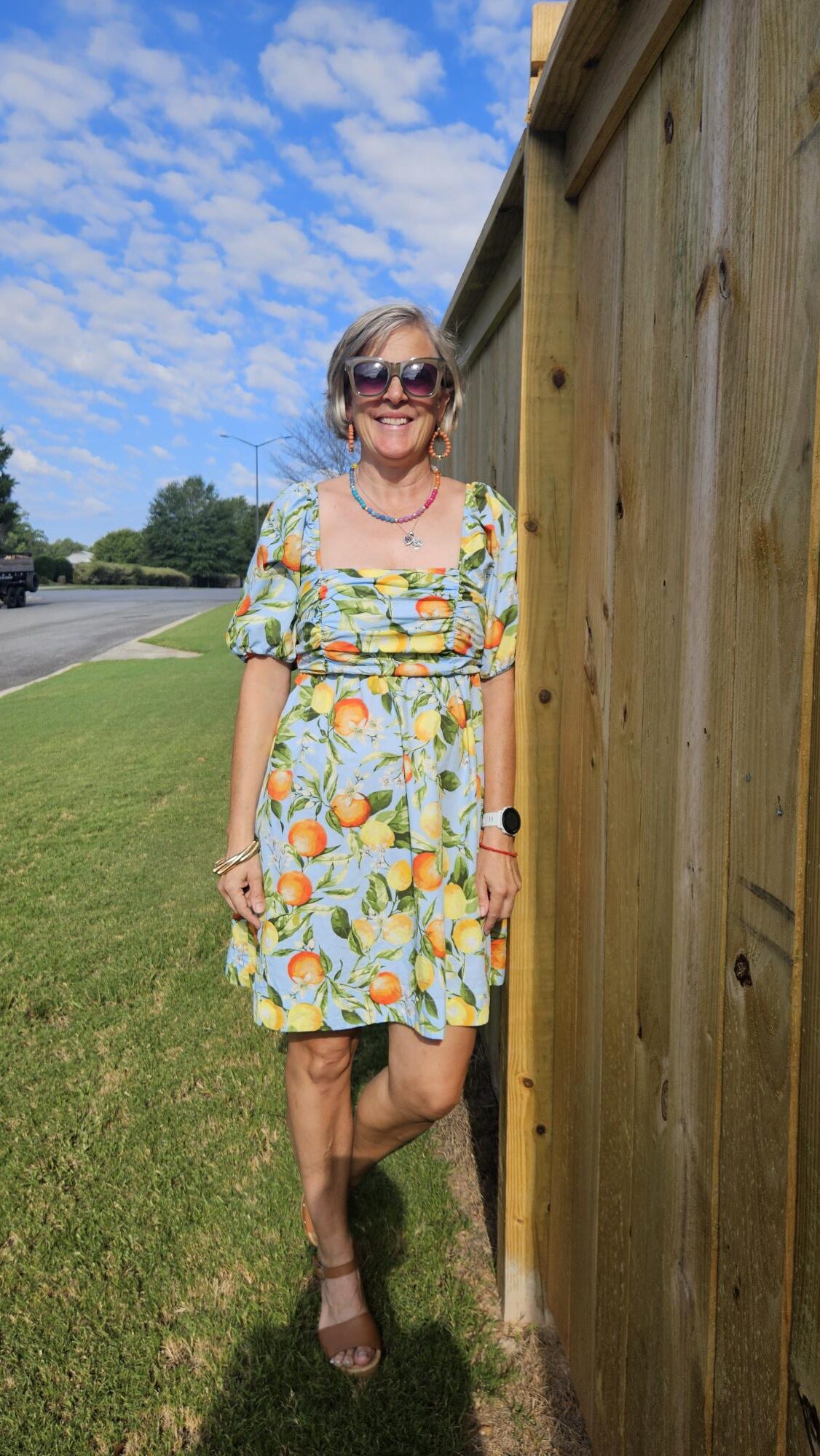 Happy birthday to you, Mireille! You are looking fabulous in that cute fruit print dress. I love the colors, and the dress seems just right for a special celebration. Thanks for sharing and hope you have a good week.