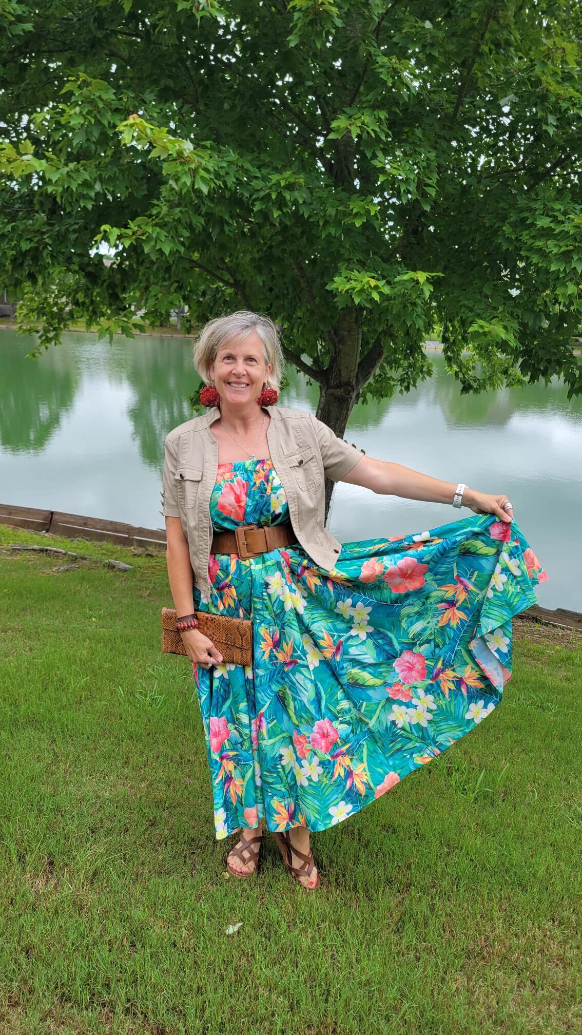 I added a picture with a close up of my accessories: this is my 50th birthday present that I chose at our local western museum. It really is pretty! This is the outfit I wore to church and since the AC has been in use, the thrifted denim shirt worked out well: I was neither hot nor cold but very comfortable.