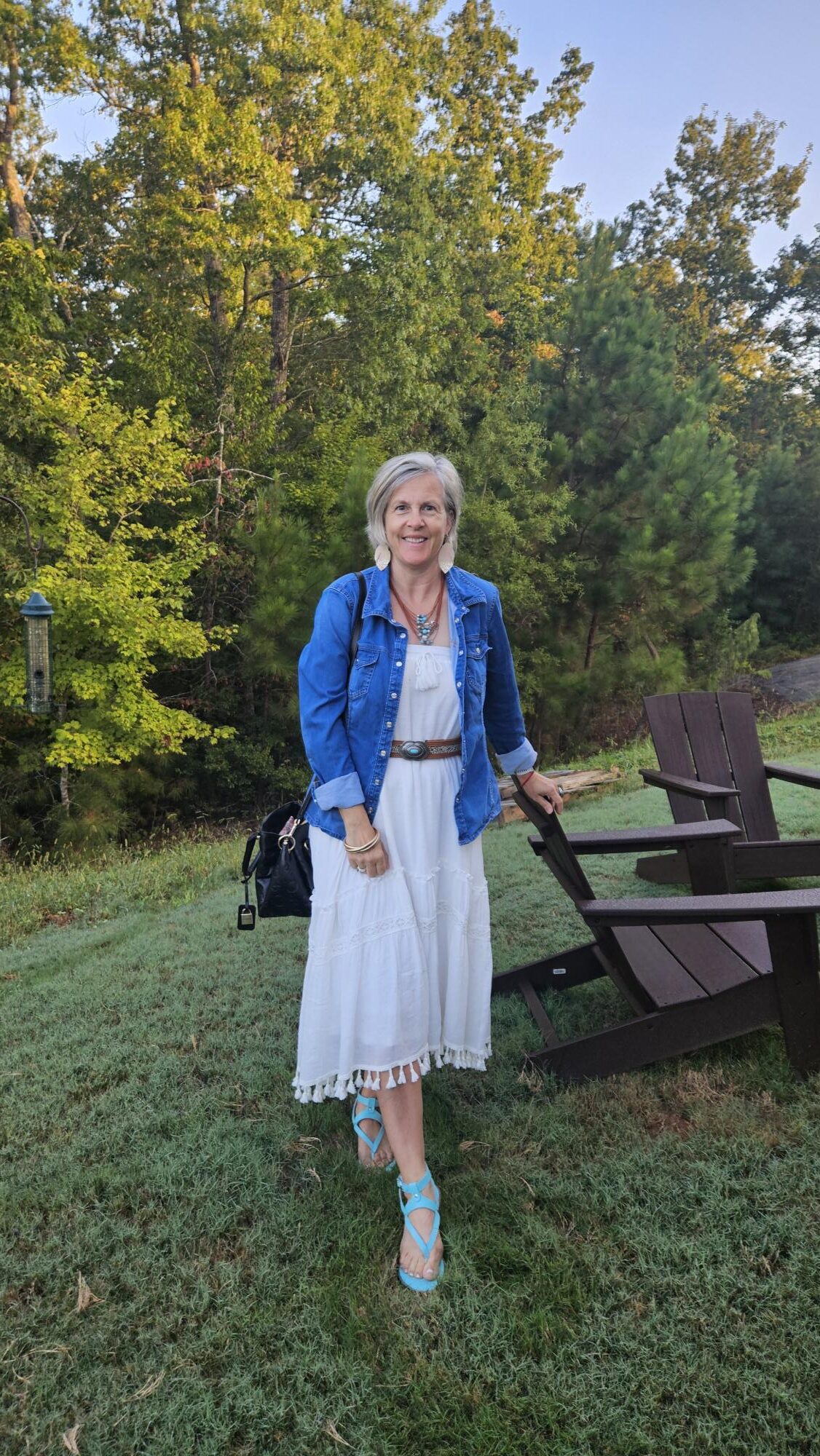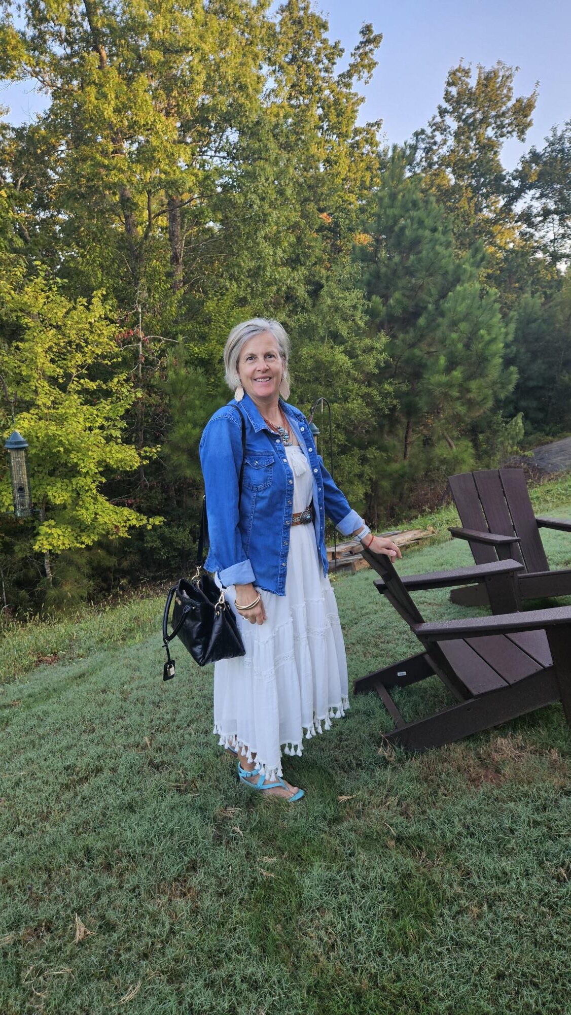 The white skirt/dress looks great with denim and styled with a western vibe!