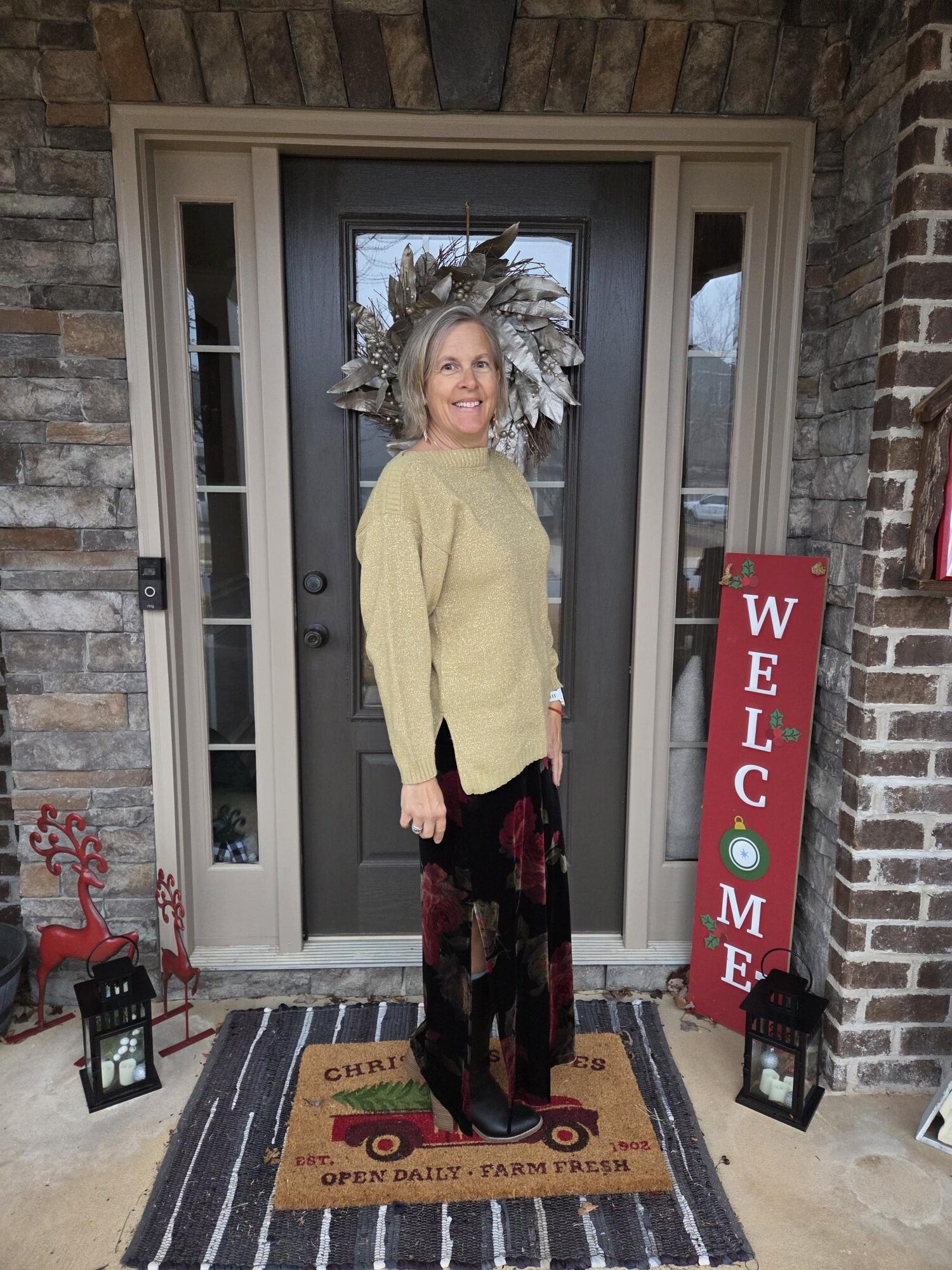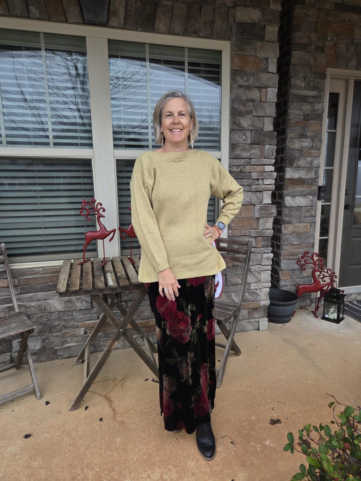 I love coming up with different outfits for the holiday season and Christmas without resorting to a red and green thematic outfit. Over the years, I have worn teal, burgundy, silver and different textured fabrics like velvet to create some festive outfits. Today, I am sharing two outfits with a gold Sweater I thrifted for a dollar this fall. I wore the skirt outfit last Sunday to church.
