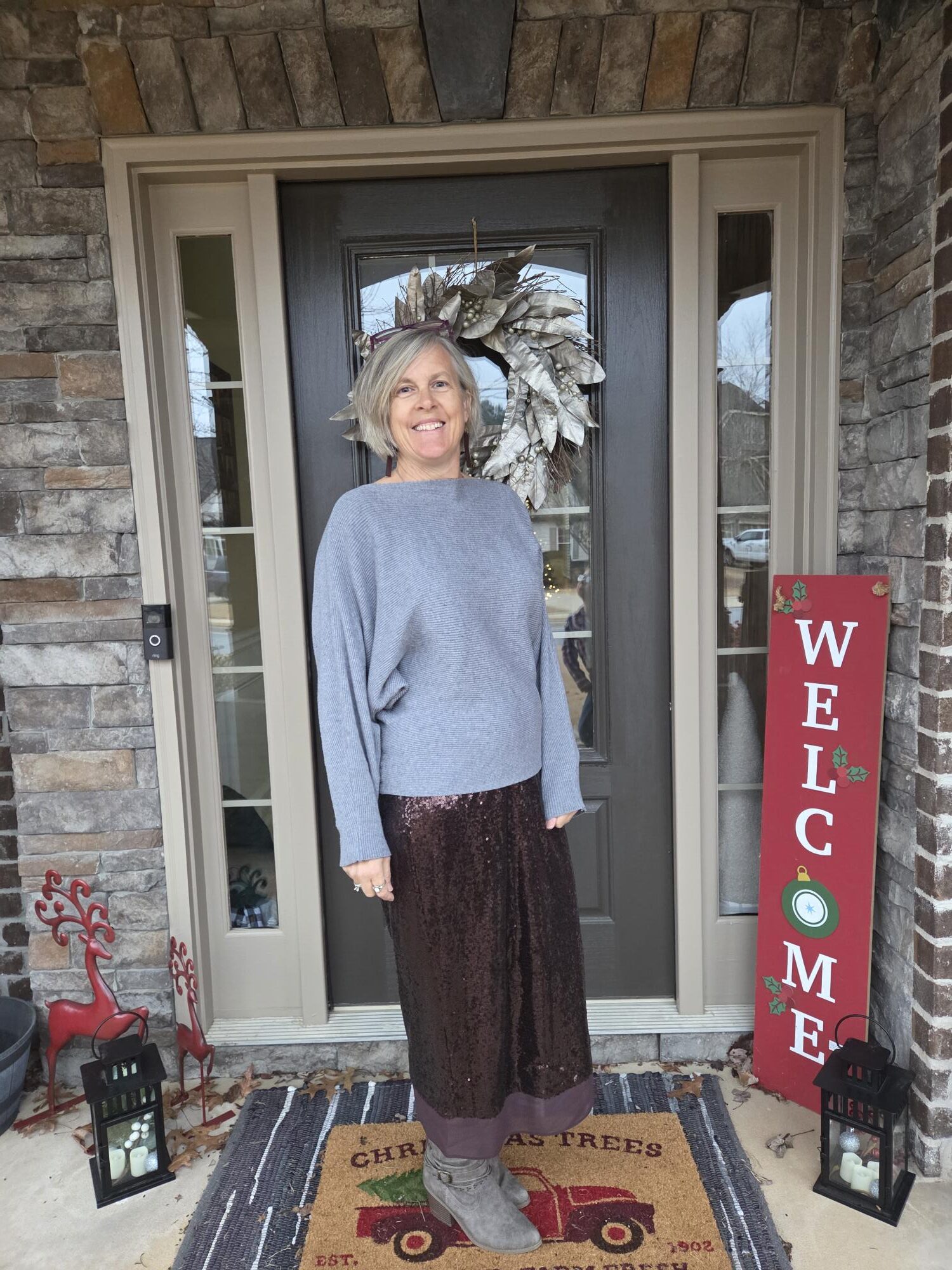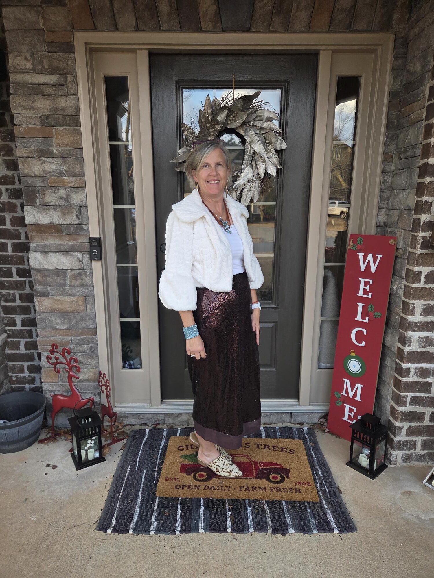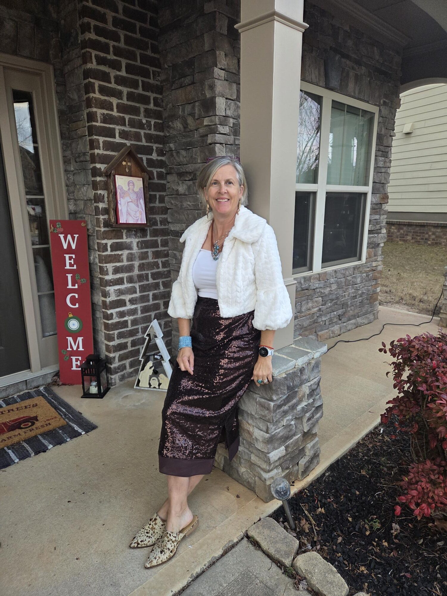 Sequins are so much more versatile than I would have thought! This is a great neutral color for sequins, and I love it with the fuzzy white crop jacket. thanks for sharing and hope you have a good week.