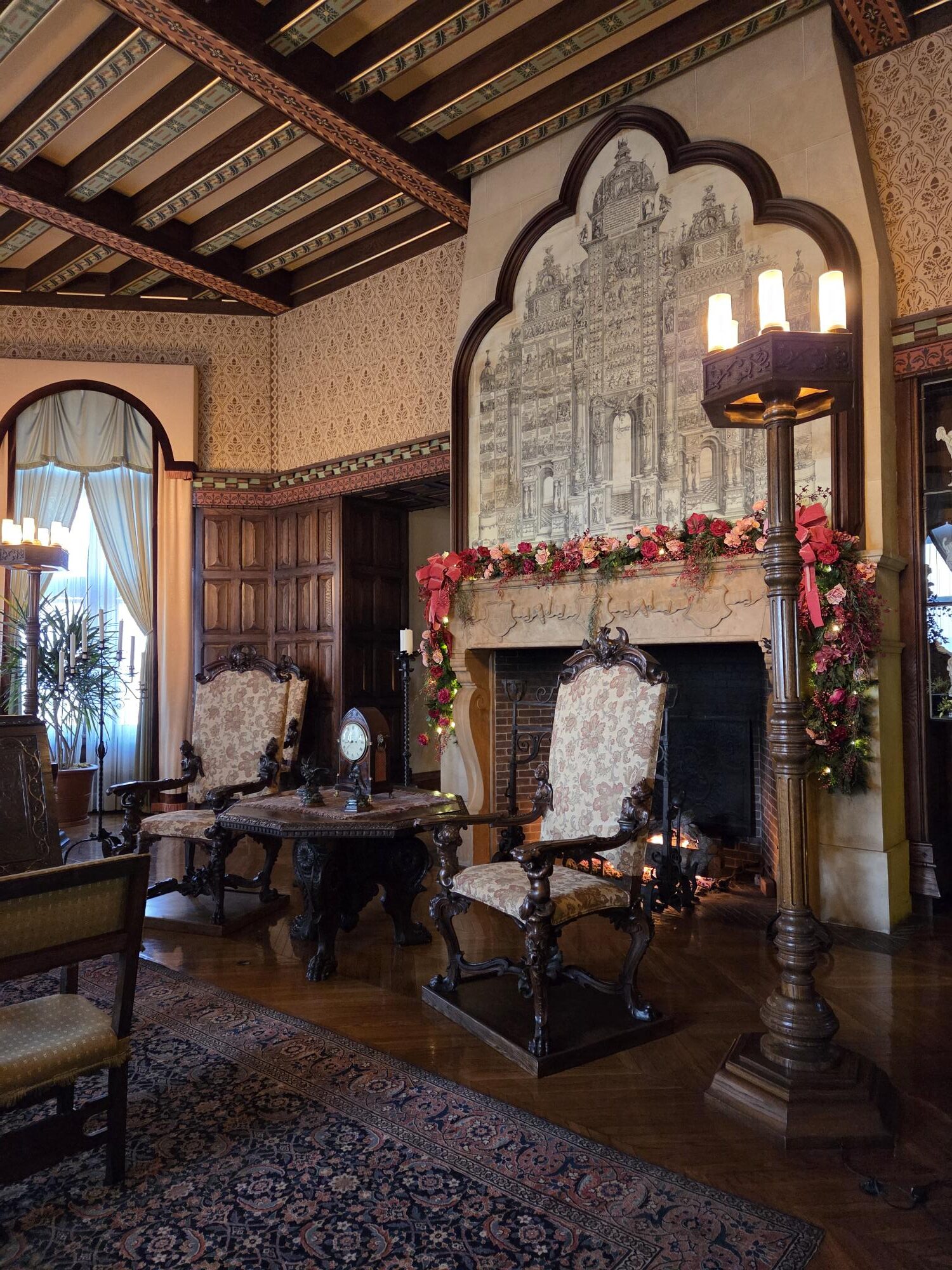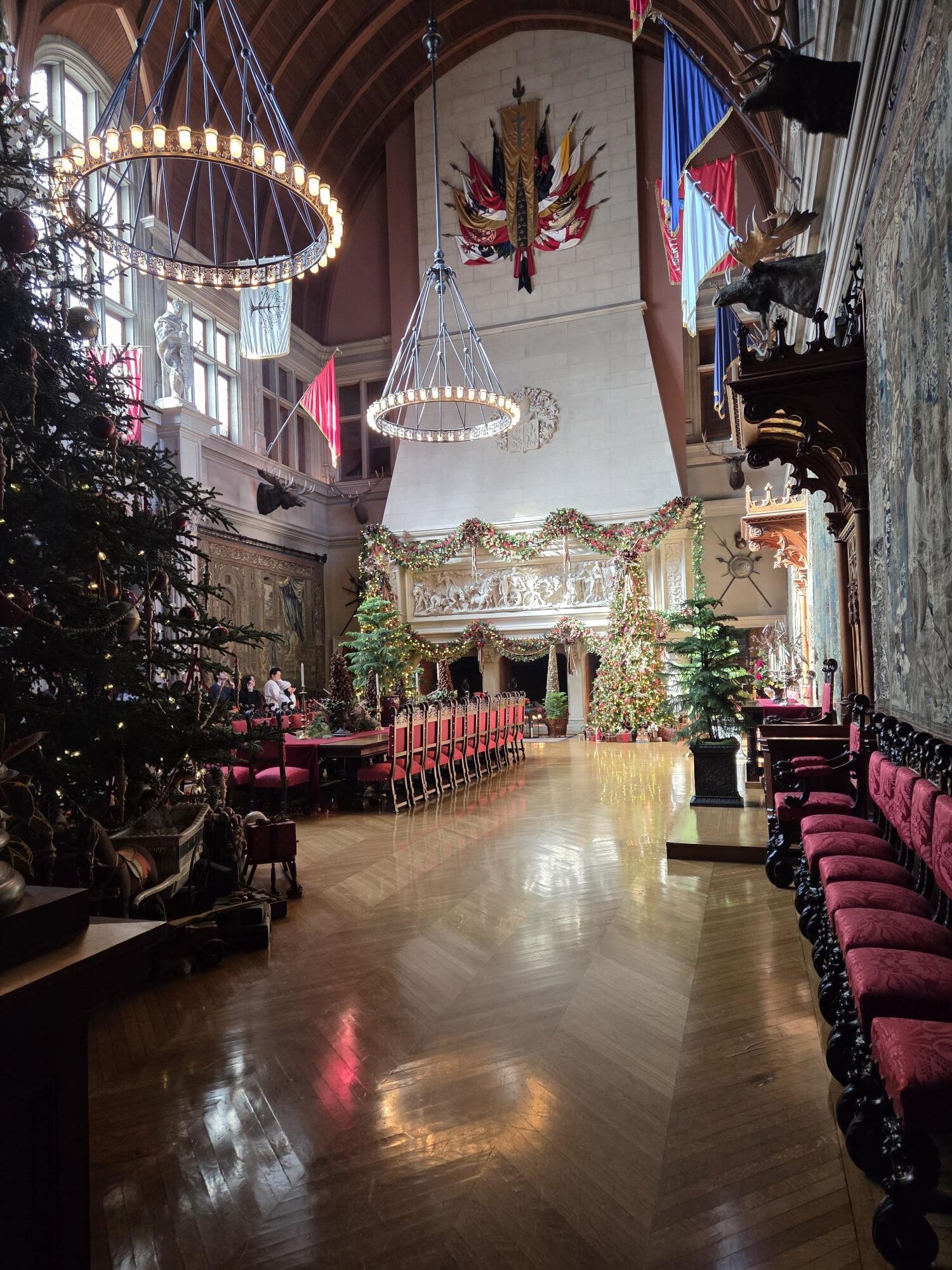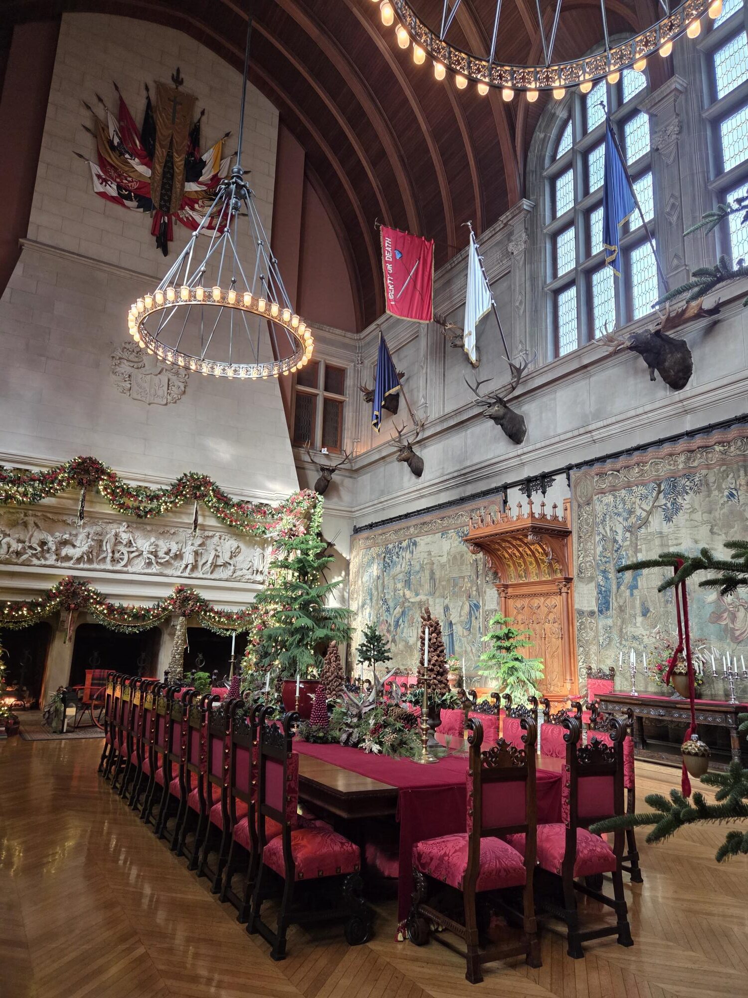I think that the Christmas decor still being up made the visit really special. It was beautiful! Imagine hosting a dinner in the banquet hall: the dining table can seat 64 guests and the room has 3 fireplaces. The tapestries you see below are Flemish taspestries from the 16th century. The ceiling is 70 ft high!