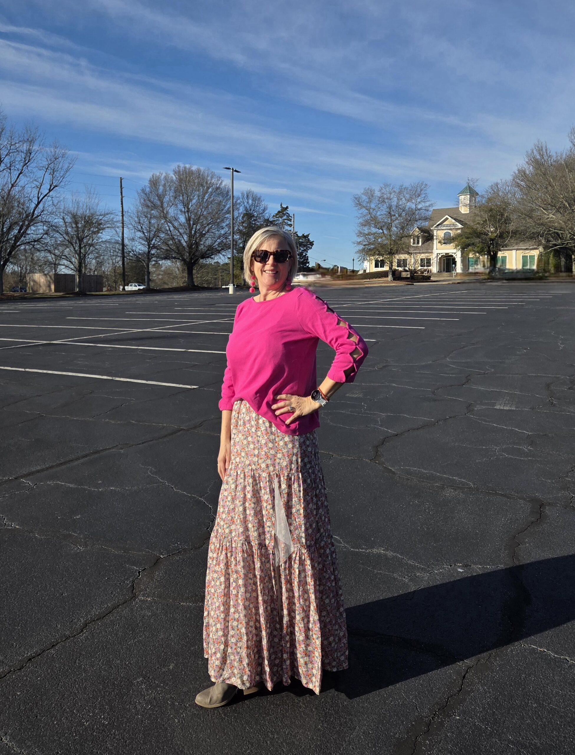I shared the sweater last week with navy, but my original idea was to pair it with a floral skirt and boots. I added matching earrings and wore this to church. I added my tulle overlay under the skirt for more coverage as the slit is really high. Of course, all of these sweaters will be great with denim too! I can imagine them with olive pants and skirts as well. They are a nice departure from all of my grey, white and blue sweaters!