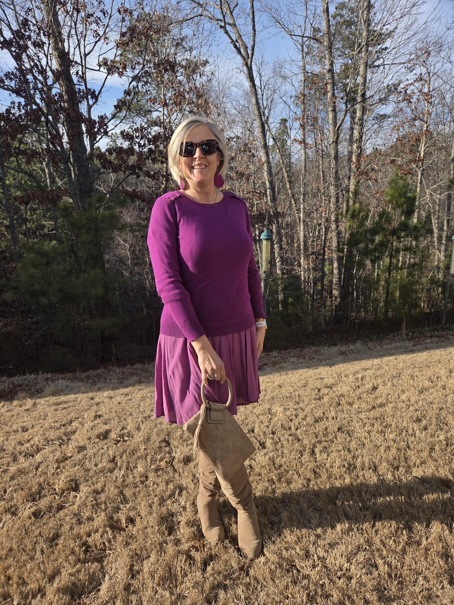 I couldn’t believe how perfect the color match was with my purple blazer and my dress (as well as my leather earrings), so this is where these two outfits came in. I wore one on grocery day and the other for church.