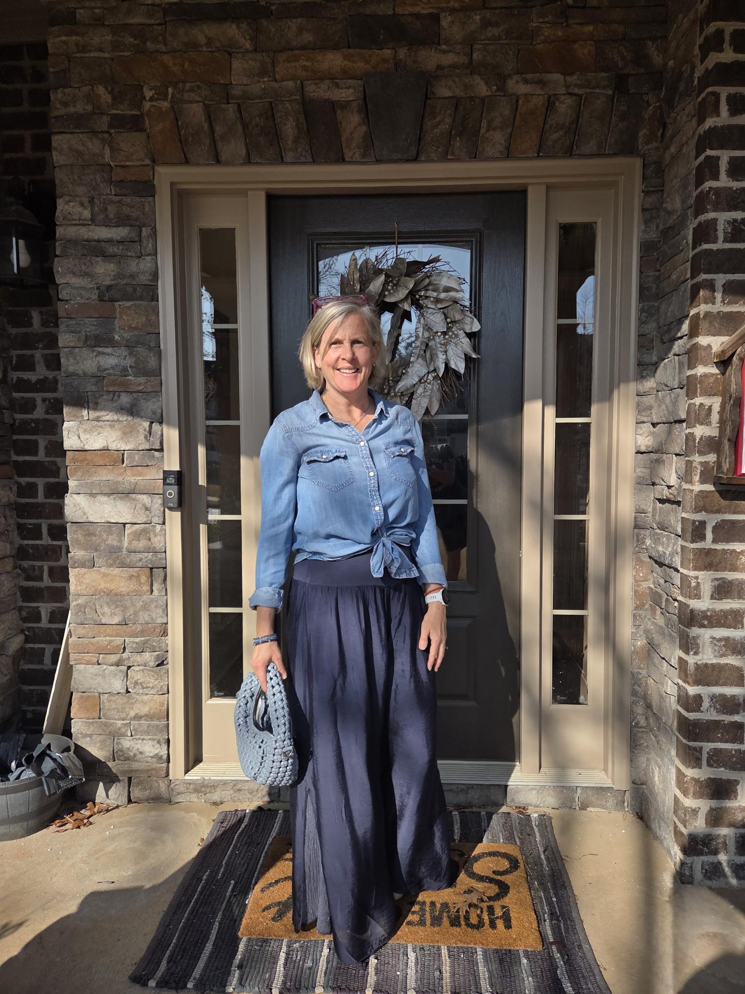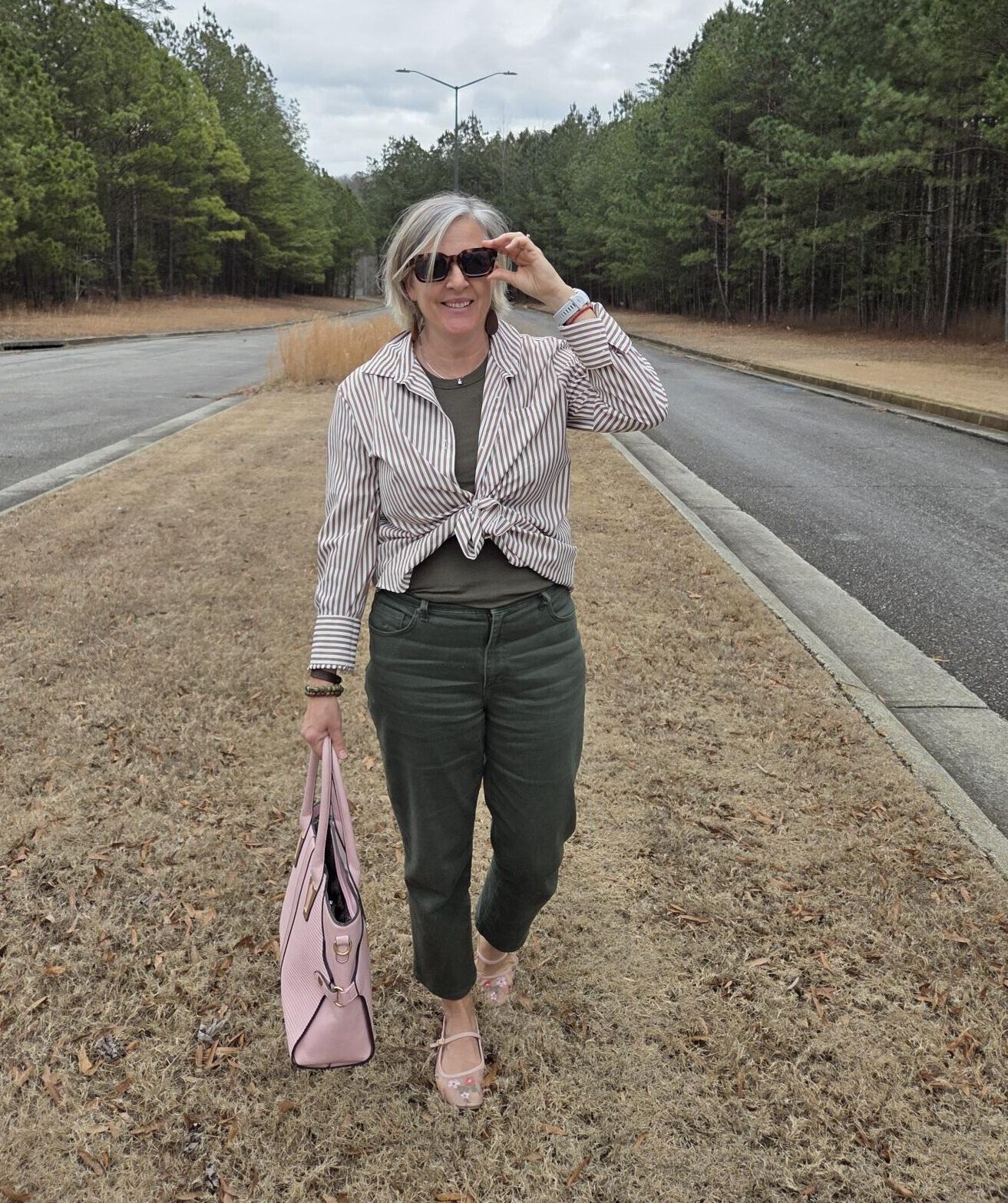 I played around with the shirt a little to try to make a higher knot, so my son had to take a second picture of my outfit later that day. I am curious as to whether that shirt came knotted like that. It’s a fun look! While I like this combo, I am not sure I would want to mess around with the knot.