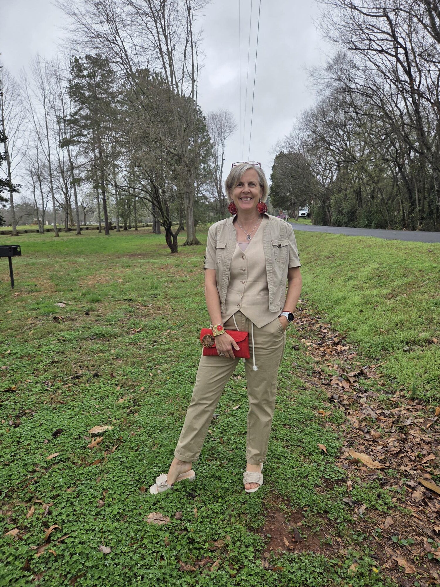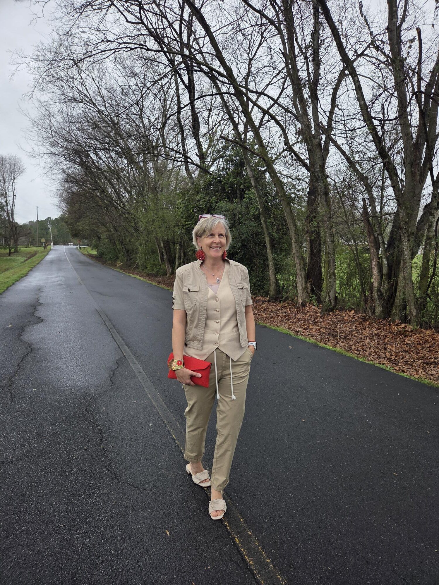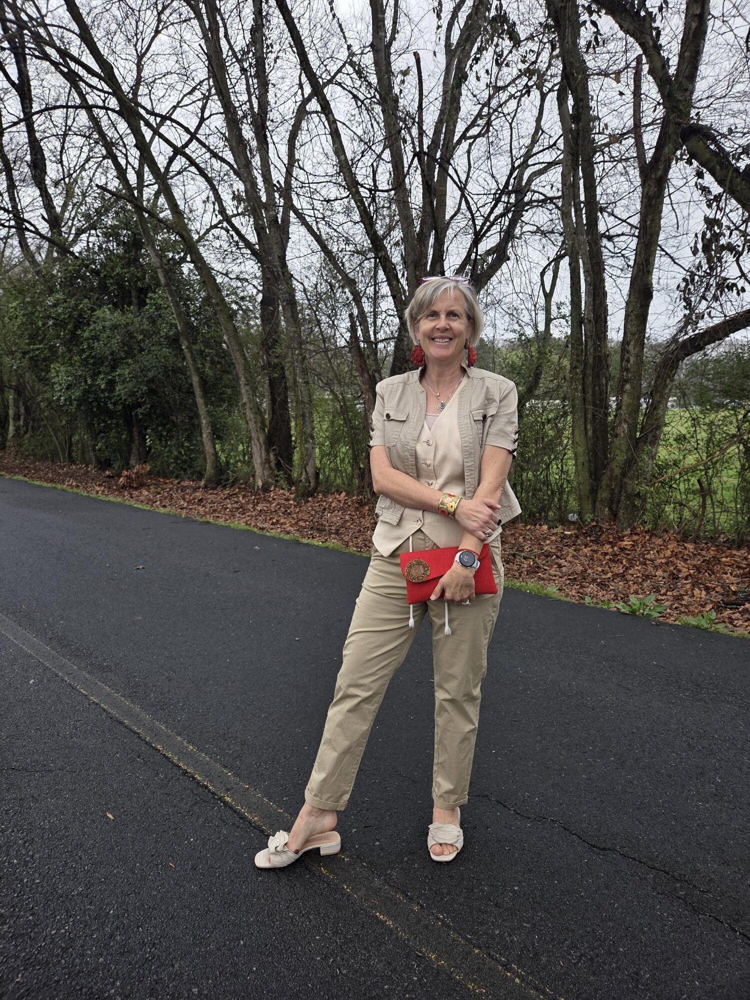 A stunning look! Tonal khaki looks very sophisticated with a pop of red. Thanks for linking!